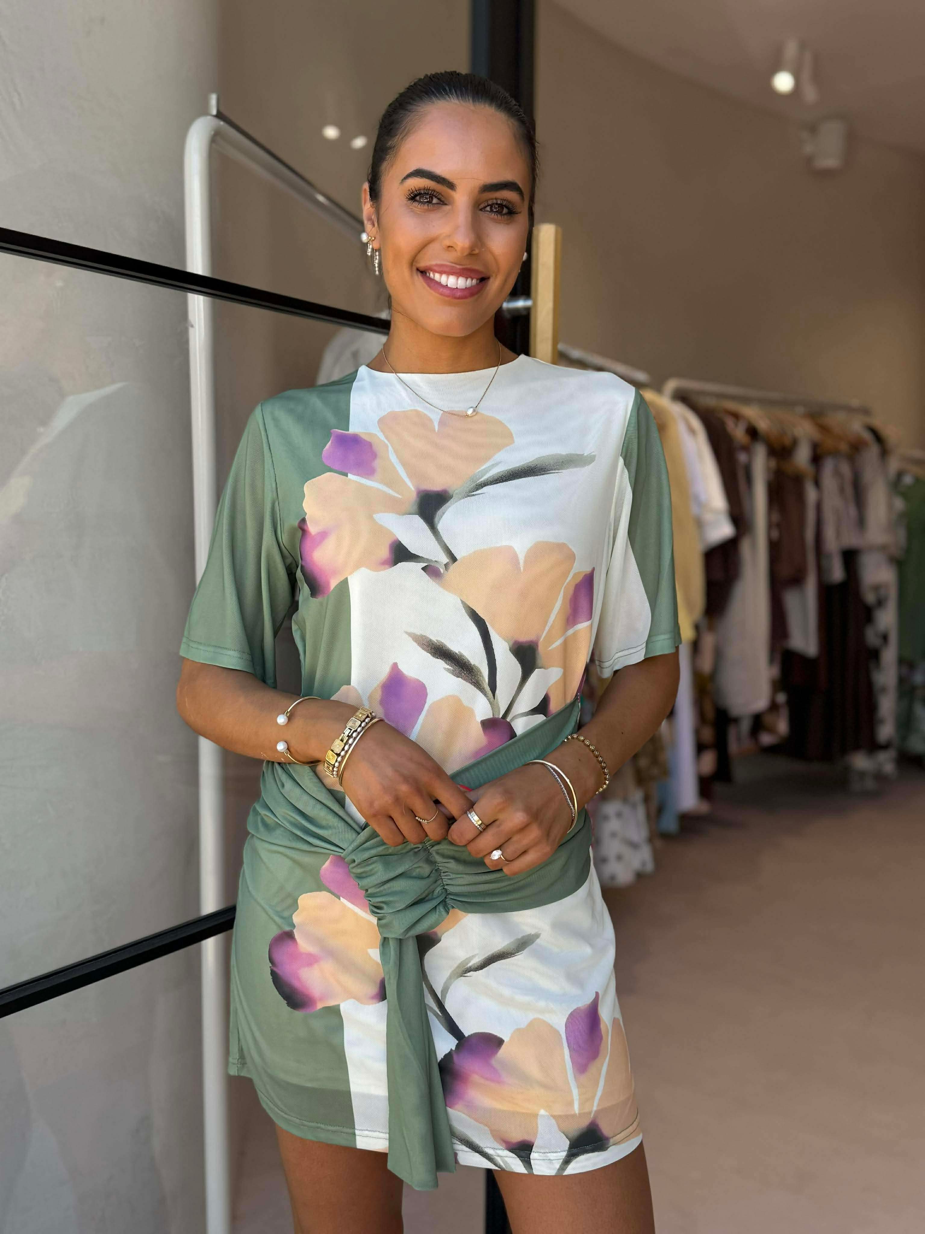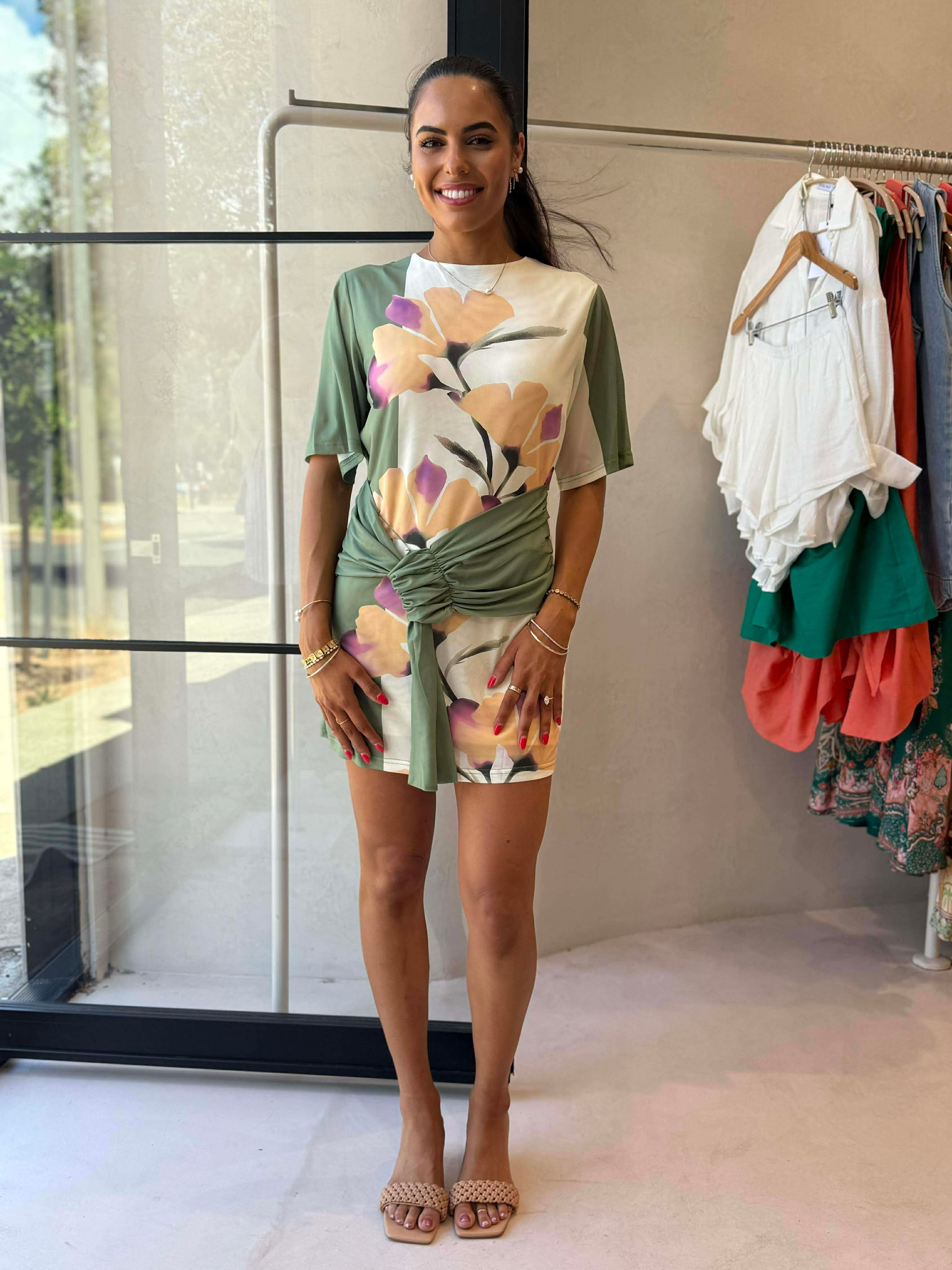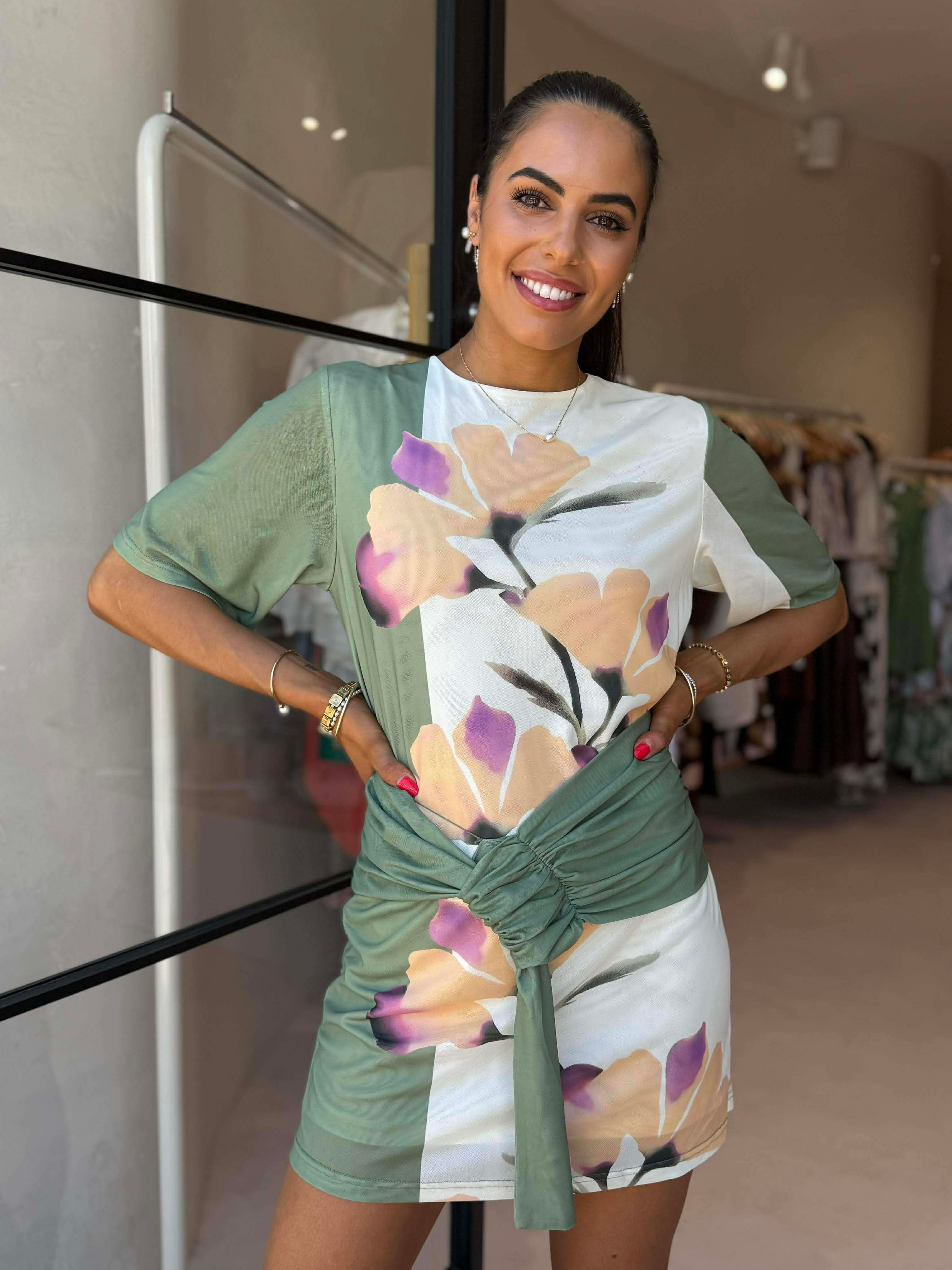 Stretch mesh fabrication; lined - Crew neckline - Short sleeves - Pull on design - Exclusive print designed in-house - Sash & loop front waist detail - Relaxed fit - This style is a large fit, we recommend sizing down