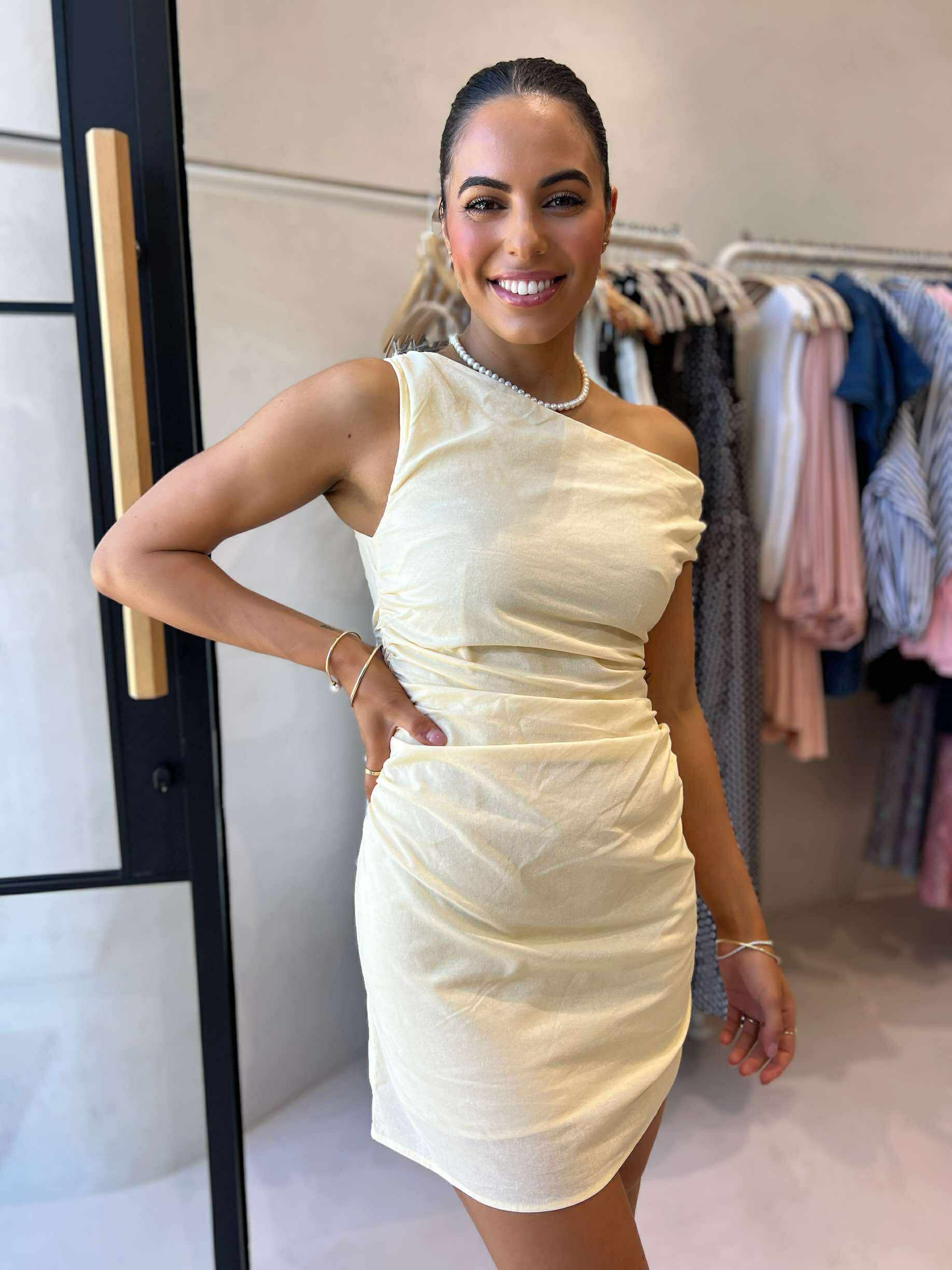 The Alyssa Asymmetrical Dress is sunshine in a silhouette, crafted from a ruched linen-cotton blend in a vibrant yellow hue. Designed to sit off the shoulder with an asymmetrical neckline, it brings a flirty edge to warm-weather styling. Pair it with strappy heels or sandals for your next spring soirée or golden hour moment.