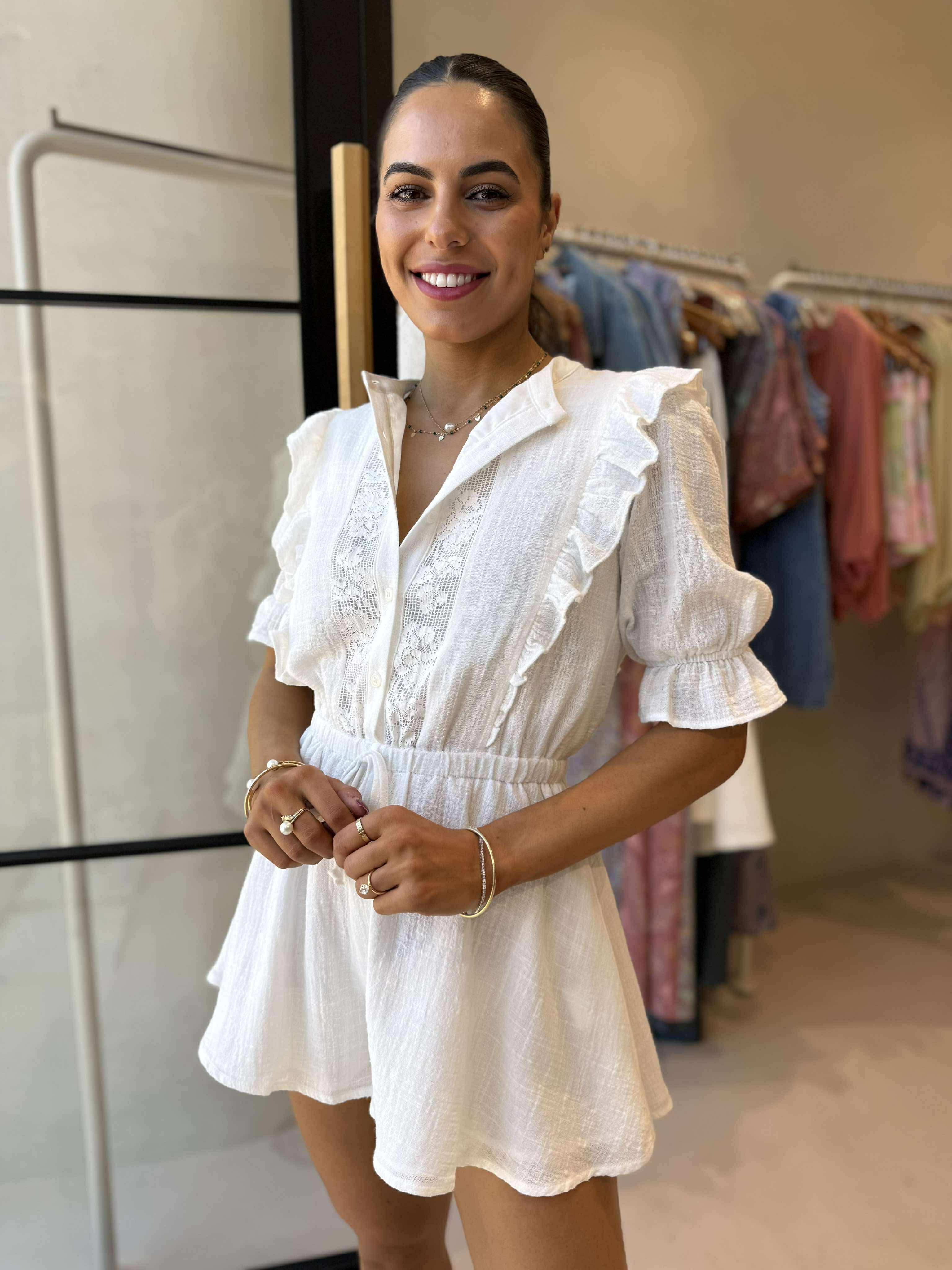 This white mini playsuit features delicate lace detail on the chest, a flattering elasticated waistband, and loose sleeves with elasticated cuffs. Fully lined and finished with a button-up front for an effortlessly chic look.