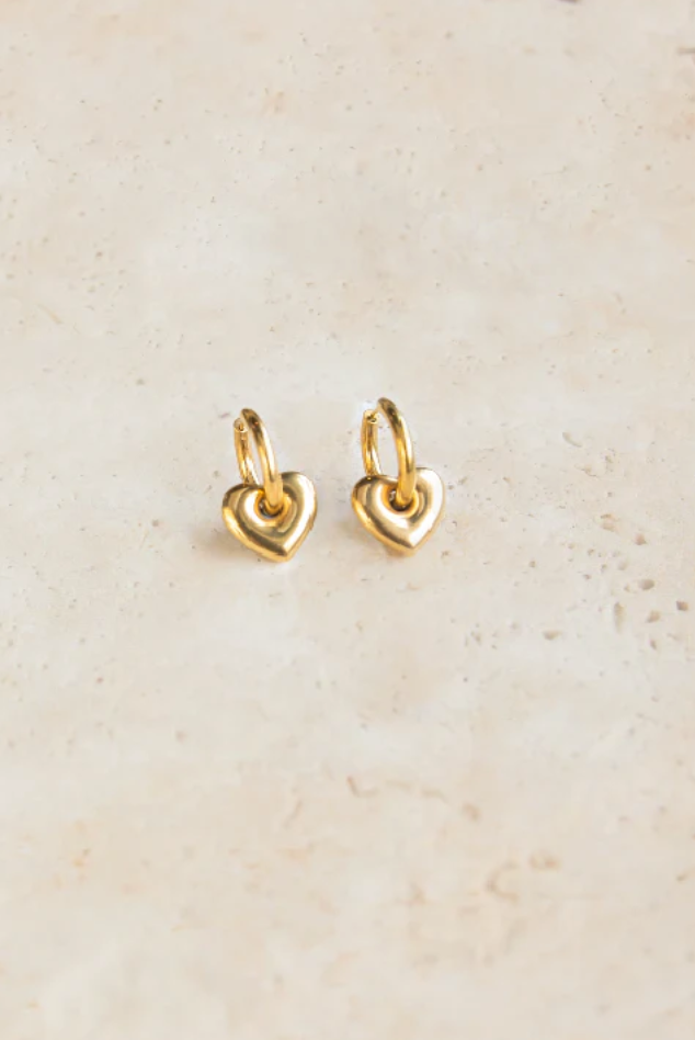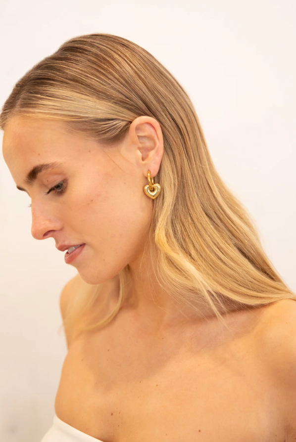 Introducing the Amy Hoop Earrings, crafted bold statement heart hoops in a stunning gold finish. Make a statement with these earrings that are sure to elevate any outfit. Perfect for any occasion, these hoop earrings are a must-have addition to your jewelry collection.