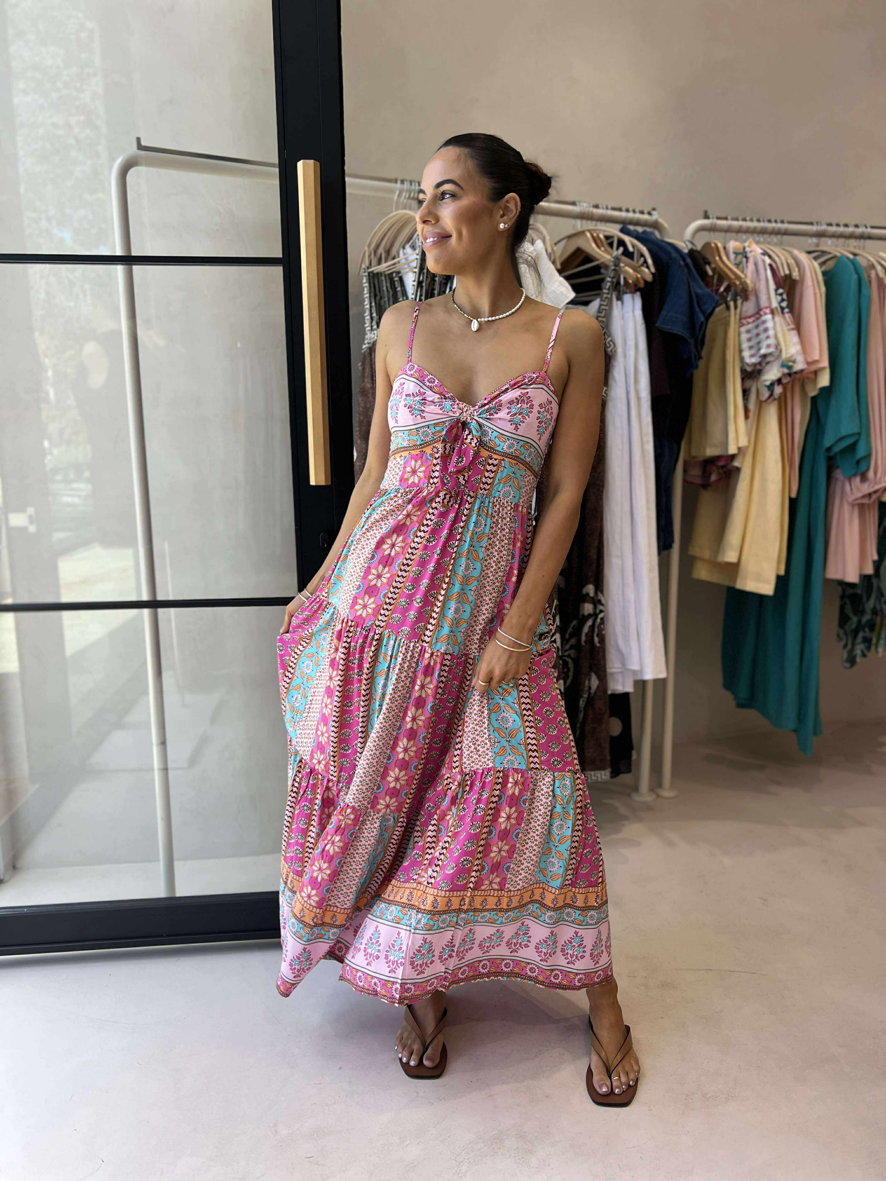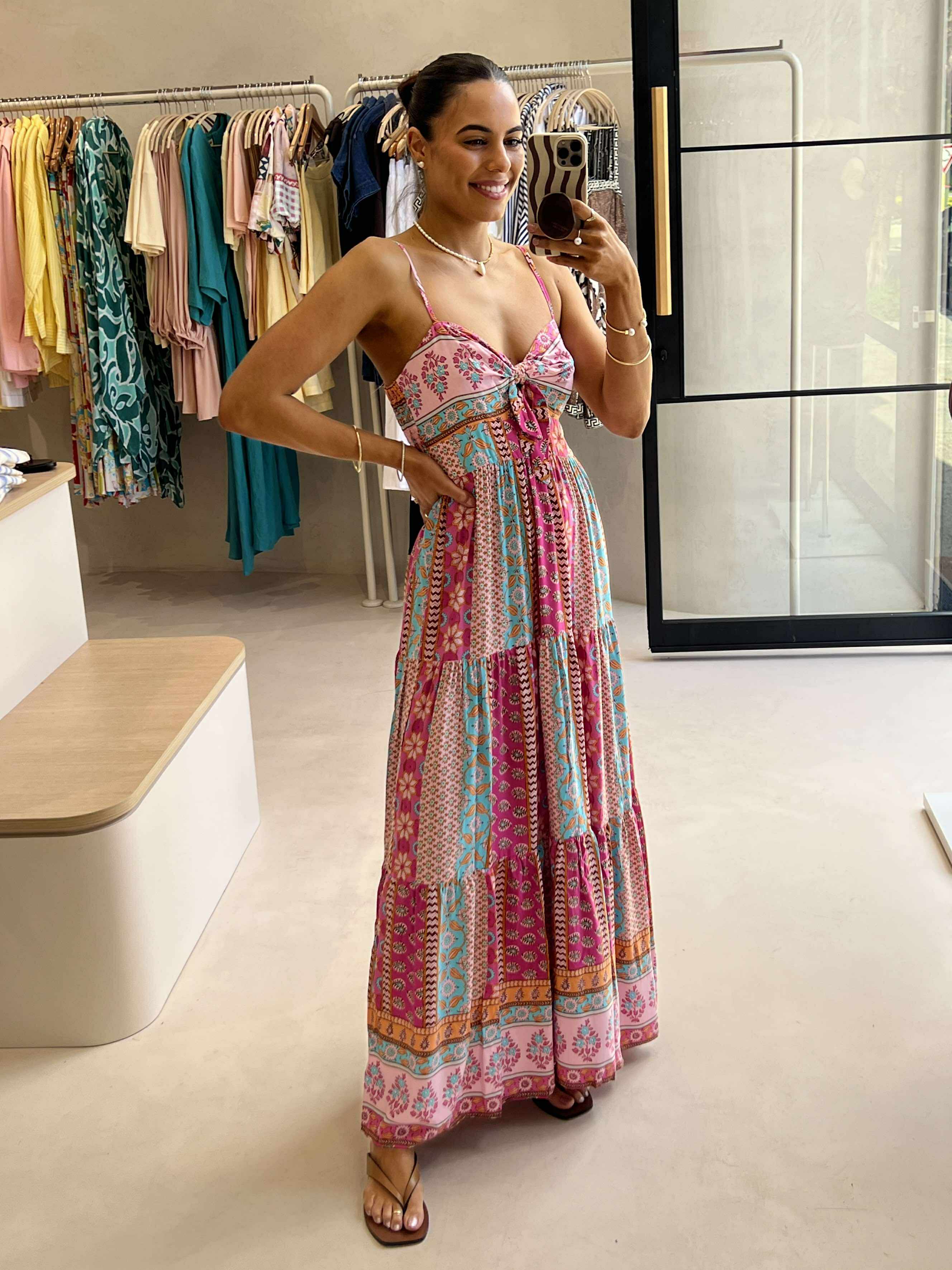 Make a statement in this bright, bold floral maxi dress. Featuring thin adjustable spaghetti straps, a front tie with flirty cutout detail, and a comfortable shirred back panel for the perfect fit. The flowy maxi length adds effortless elegance—ideal for summer events, vacations, or sunny day strolls.