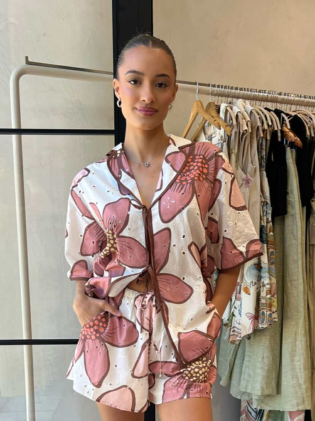 Add a touch of effortless charm with this gorgeous top, featuring a delicate botanical print on lace-inspired fabrication. Designed in a relaxed fit with side pockets and a flattering tie-up closure, it’s the perfect blend of feminine detail and everyday ease.