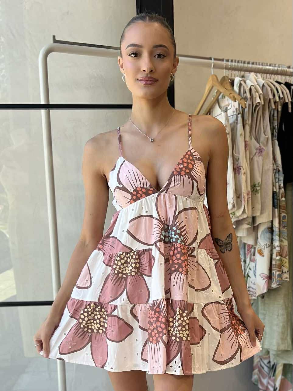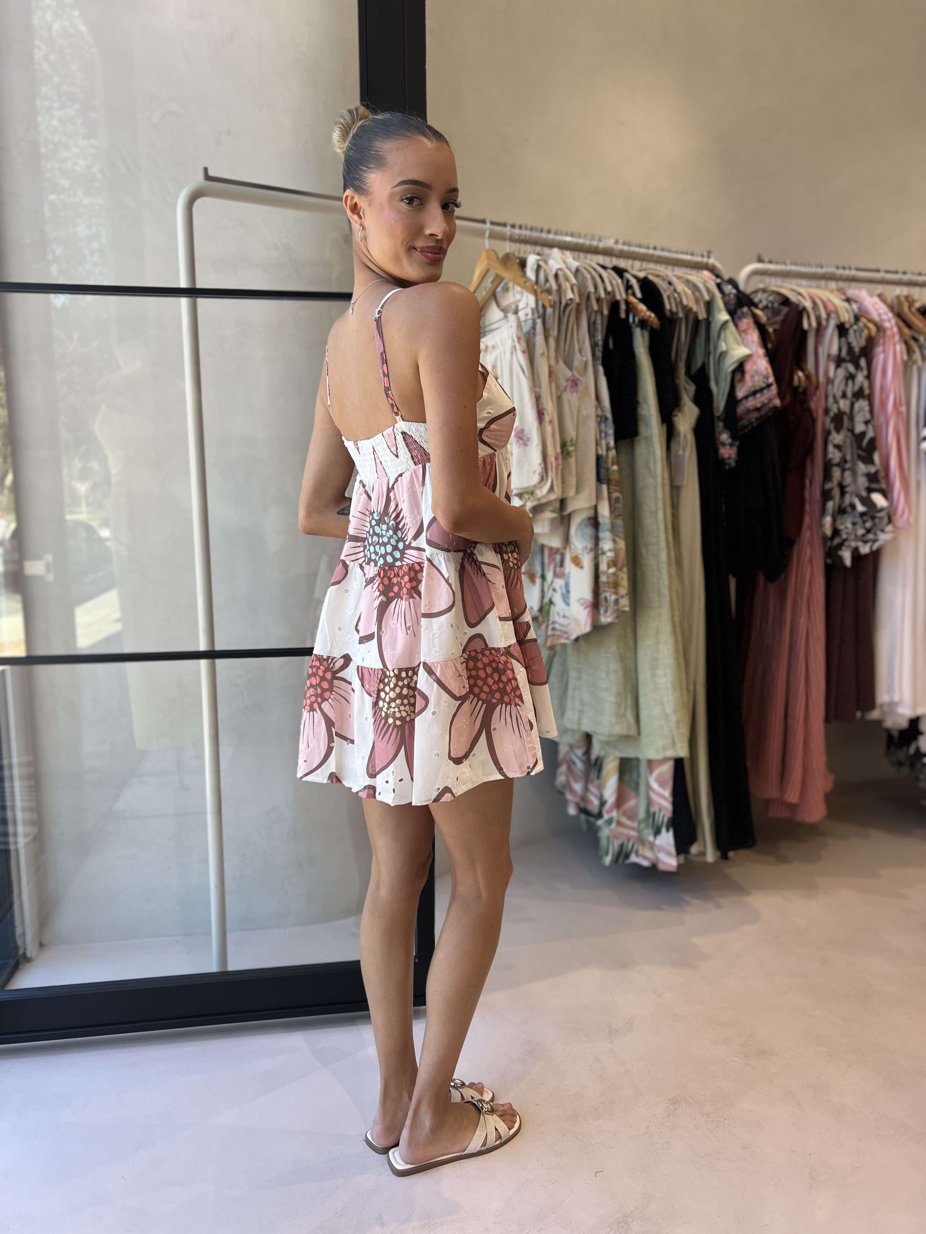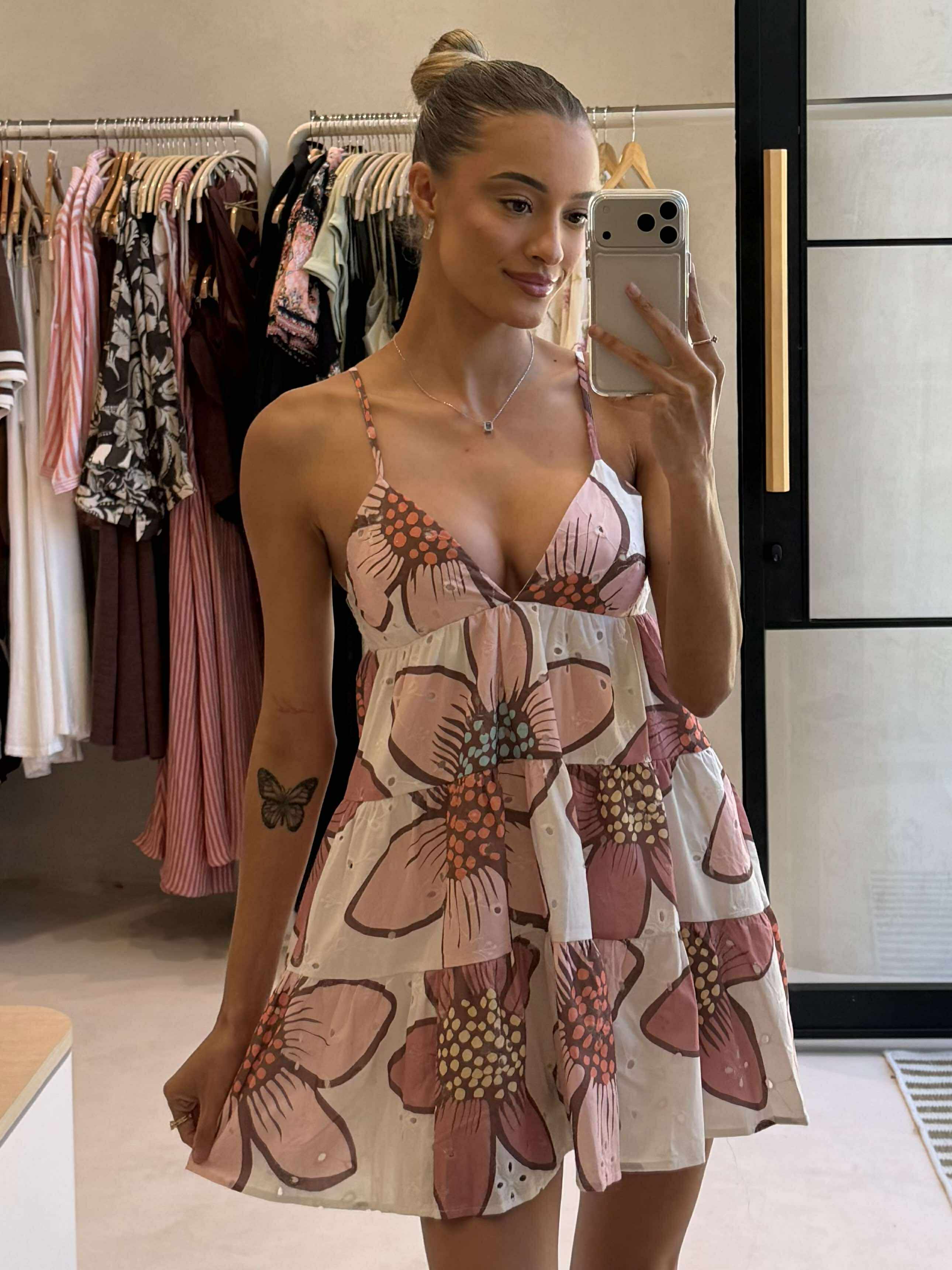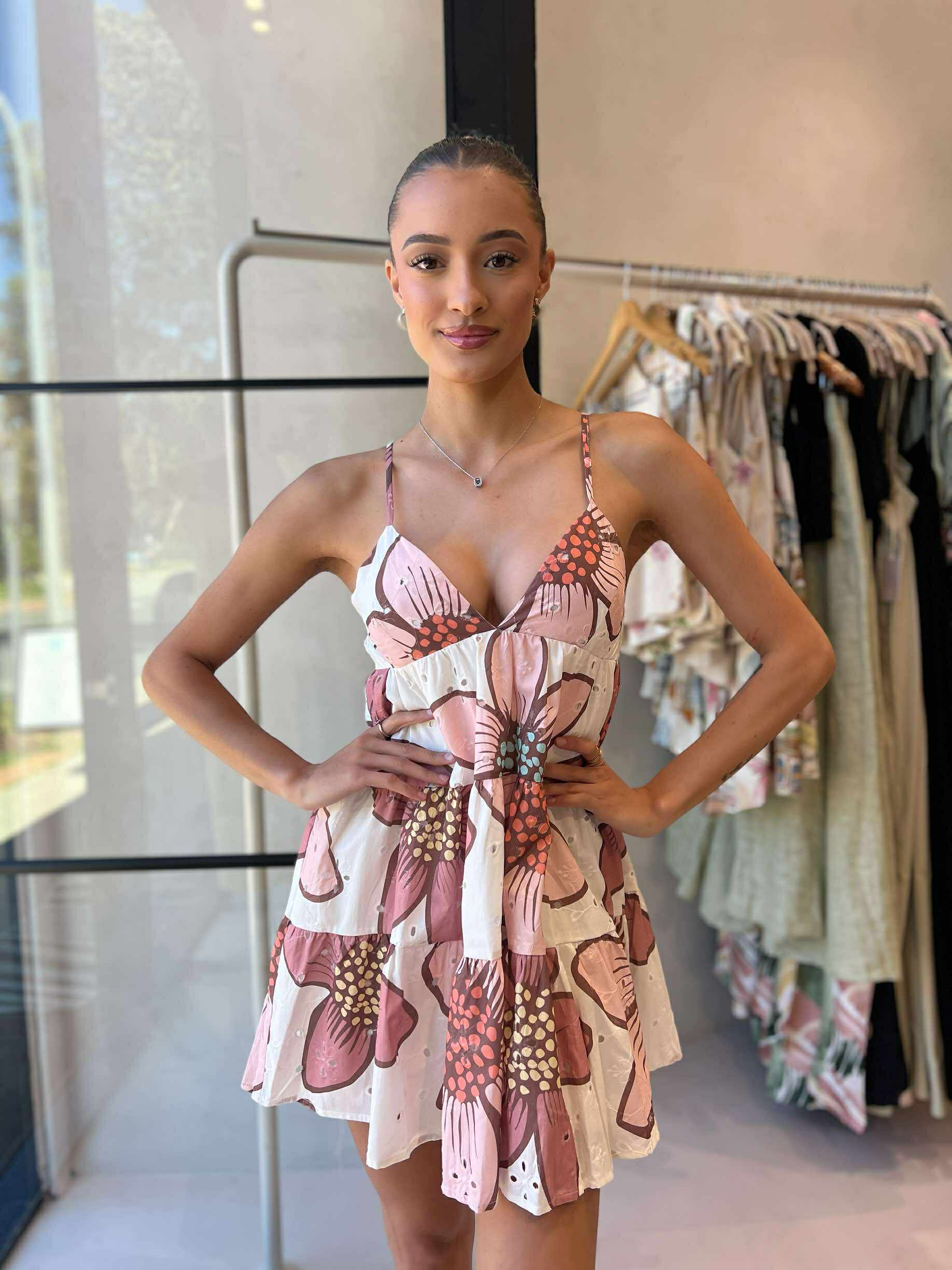 Feminine and fresh, this mini dress features a beautiful botanical print on delicate lace fabrication. Designed with a flattering V-neck, adjustable spaghetti straps, and an elasticated back panel for the perfect fit. Fully lined for comfort — an easy, romantic piece for sun-soaked days.