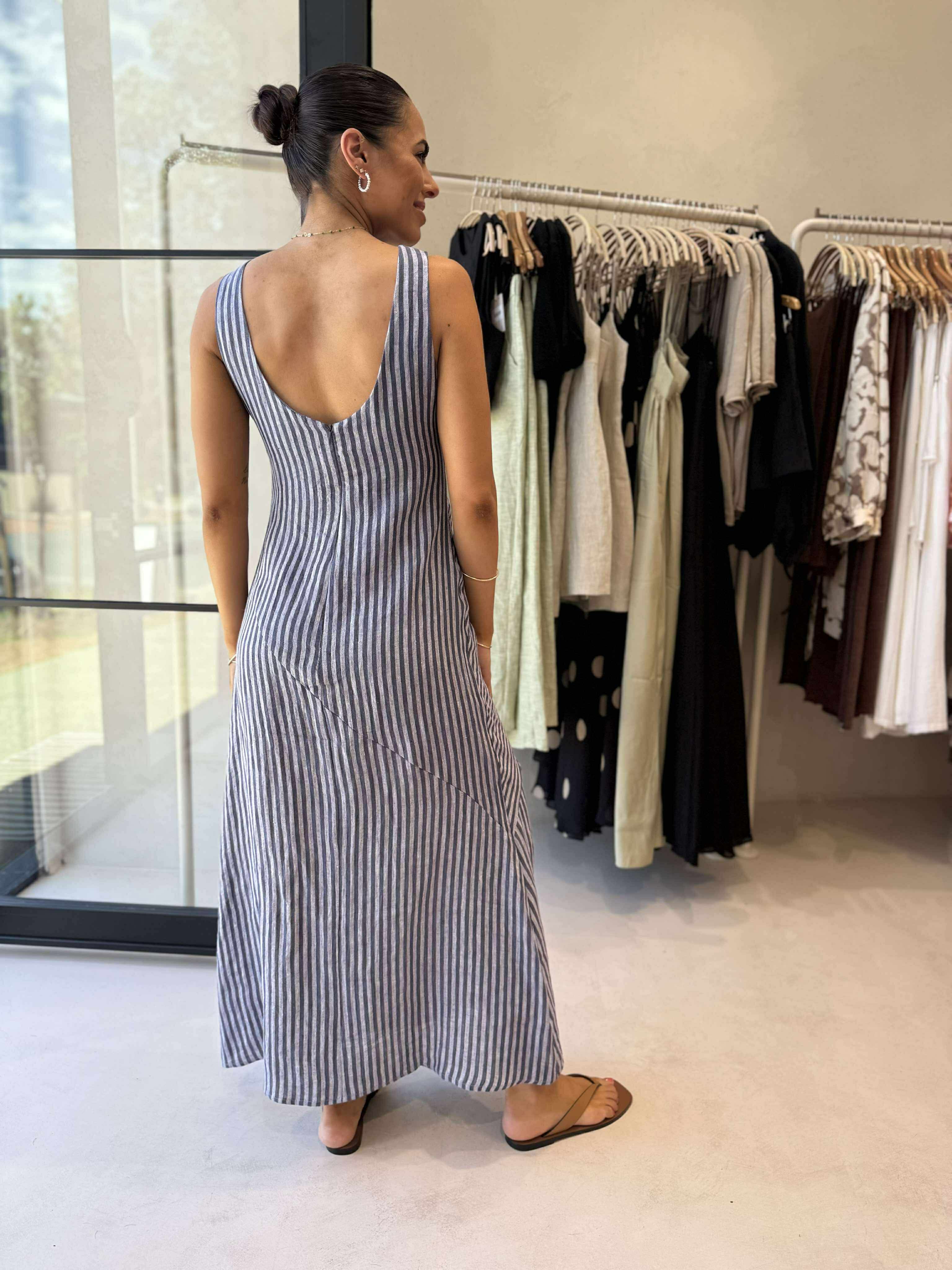 Effortlessly elegant and timeless, the Brandy Maxi is part of our in-house Frankii collection. Crafted from 100% linen, it features a flattering diagonal stripe design, a sleek invisible back zip, and a scoop V-back for a touch of sophistication. Fully lined for comfort and quality, this dress combines relaxed style with refined detail.