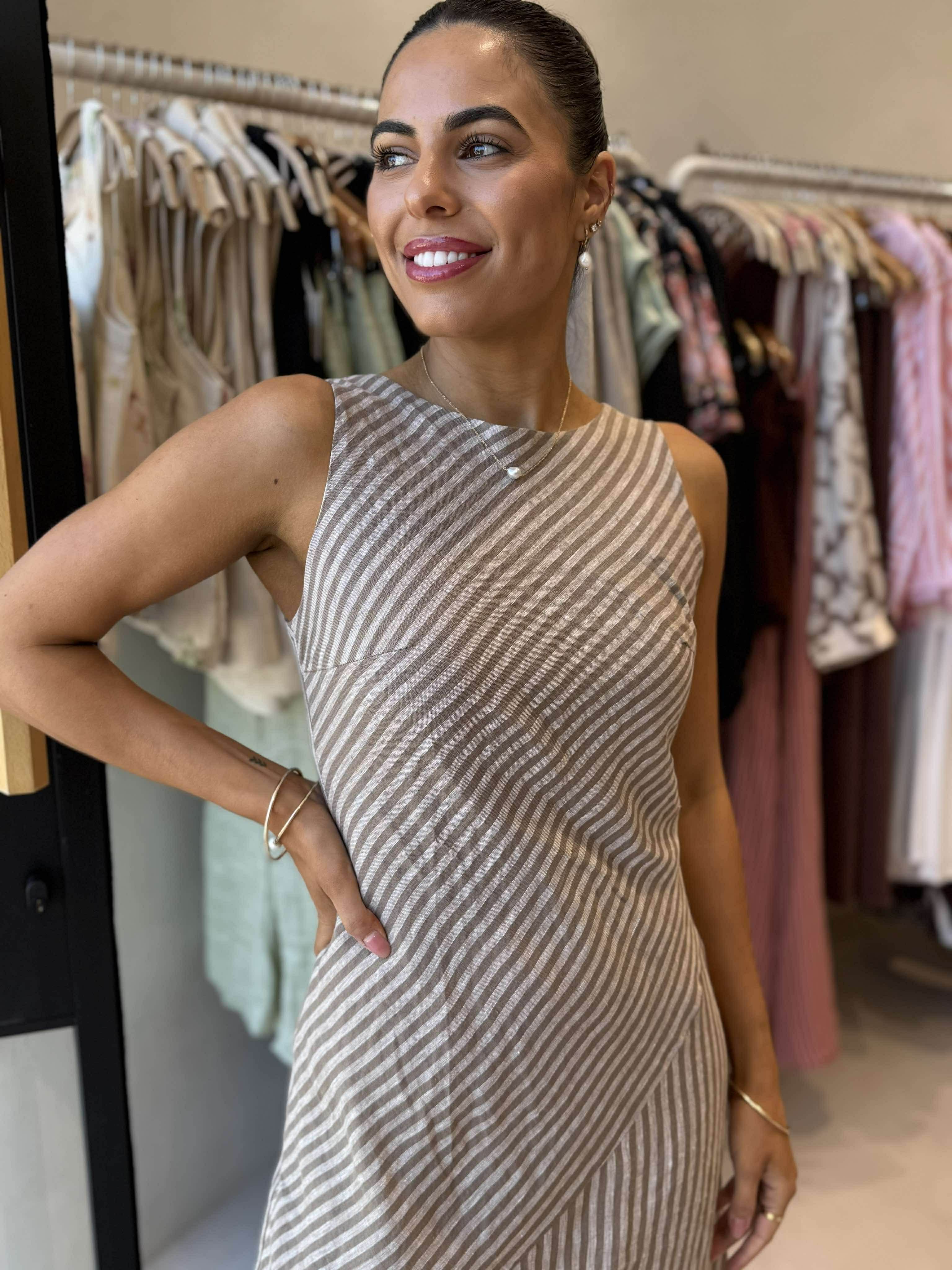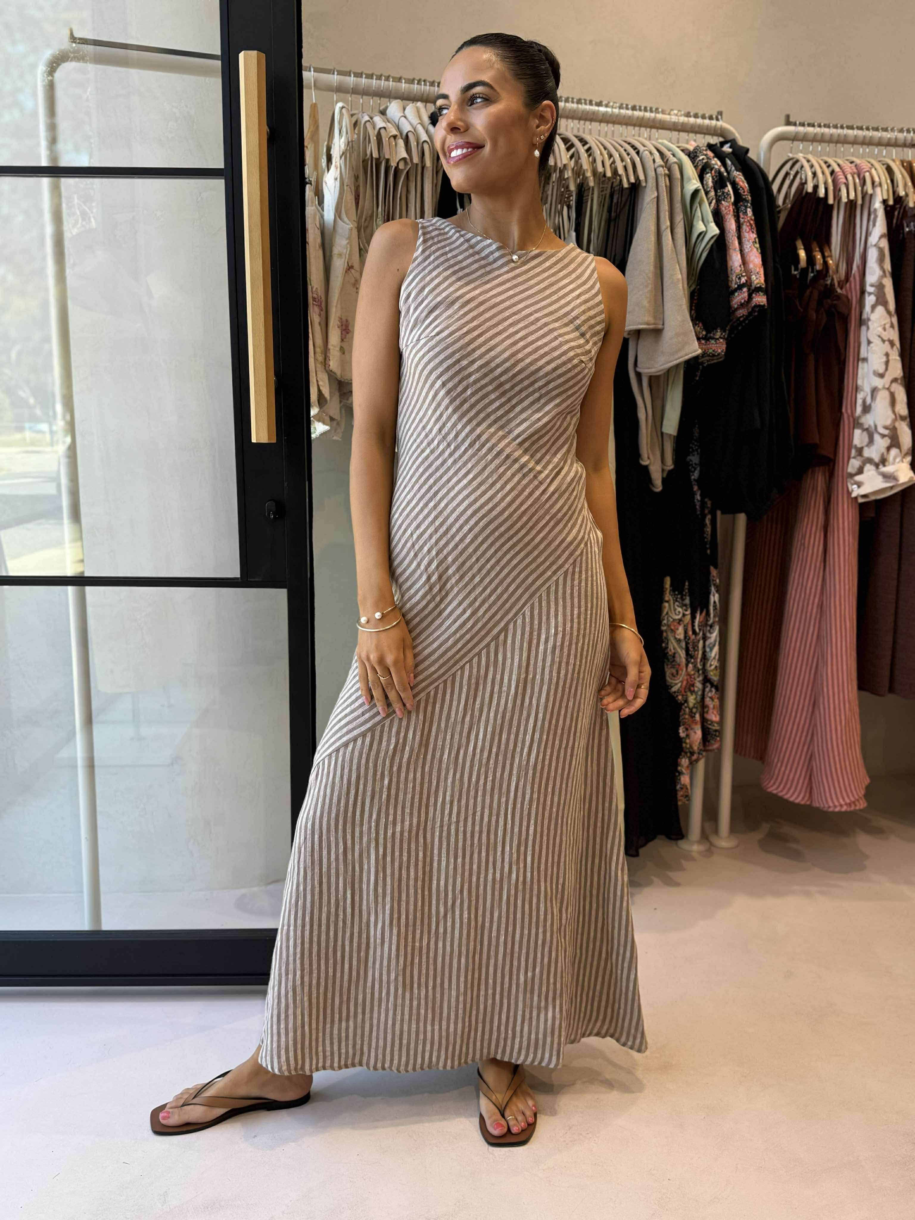 Effortlessly elegant and timeless, the Brandy Maxi is part of our in-house Frankii collection. Crafted from 100% linen, it features a flattering diagonal stripe design, a sleek invisible back zip, and a scoop V-back for a touch of sophistication. Fully lined for comfort and quality, this dress combines relaxed style with refined detail.