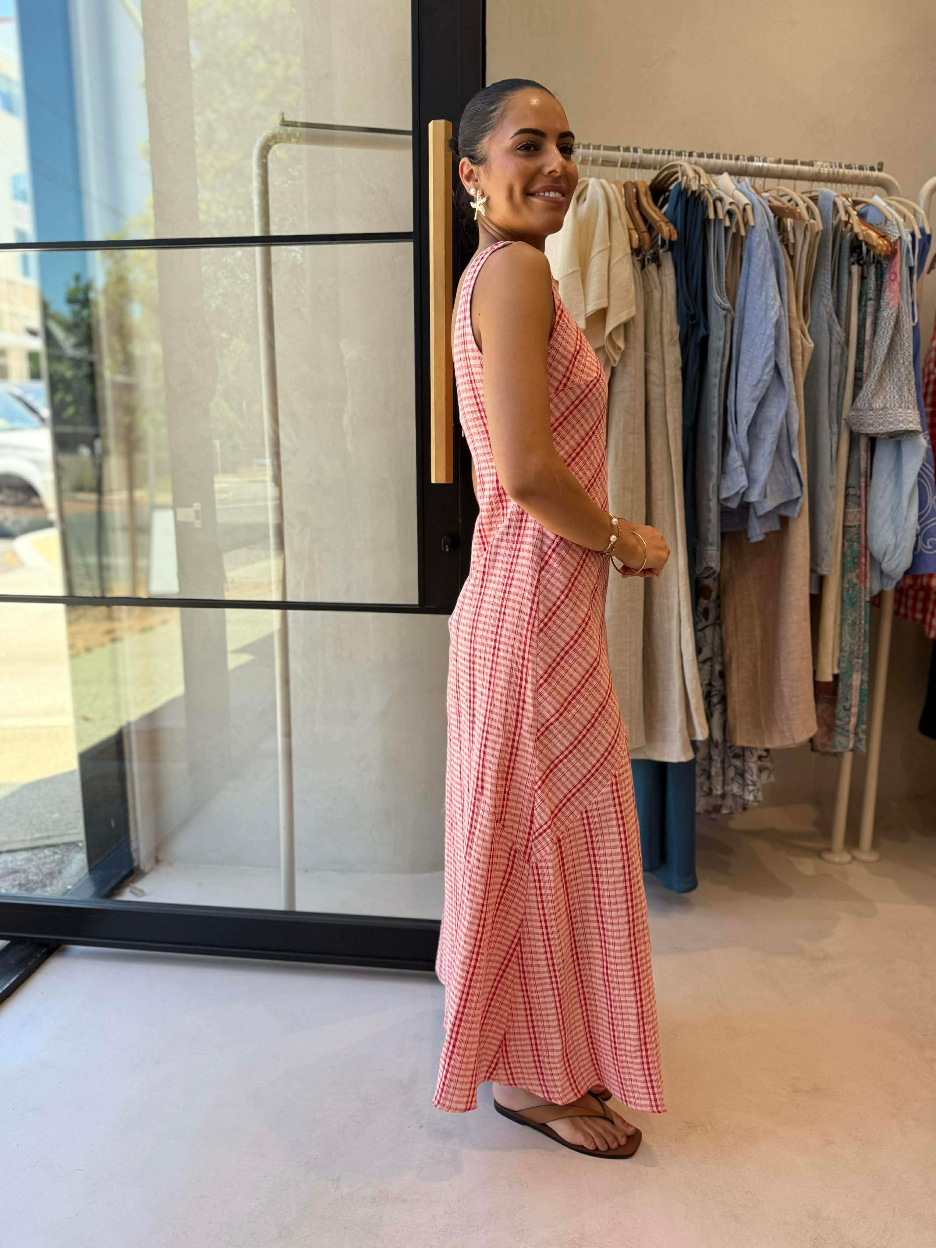 Effortlessly elegant and timeless, the Brandy Maxi is part of our in-house Frankii collection. Crafted from a blend of linen and cotton, it features a flattering check design, a sleek invisible back zip, and a scoop V-back for a touch of sophistication. Fully lined for comfort and quality, this dress combines relaxed style with refined detail.