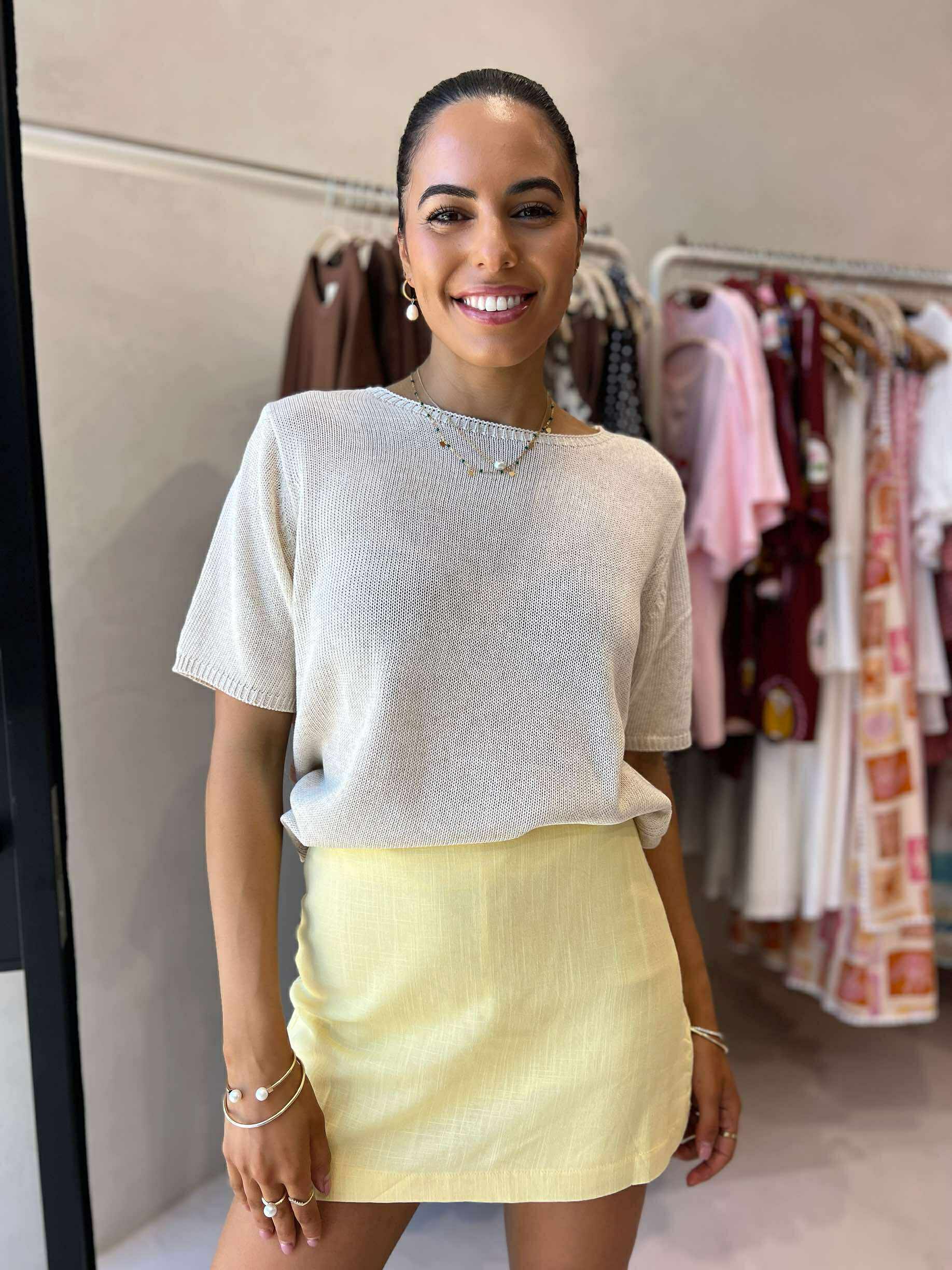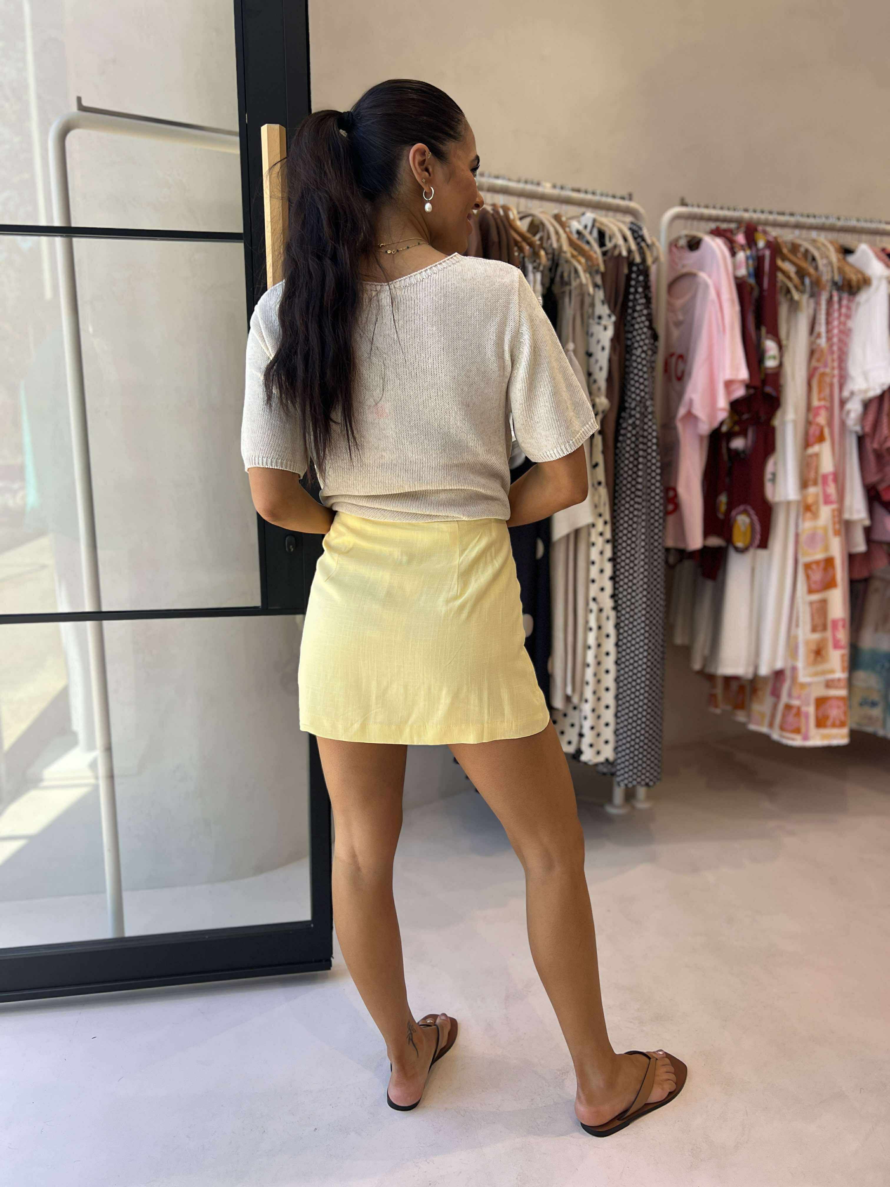 Fresh and feminine, this soft yellow mini skort is crafted from a breezy linen-blend fabric for effortless warm-weather style. Featuring an invisible side zip for a seamless look, it’s the perfect blend of comfort and polish.