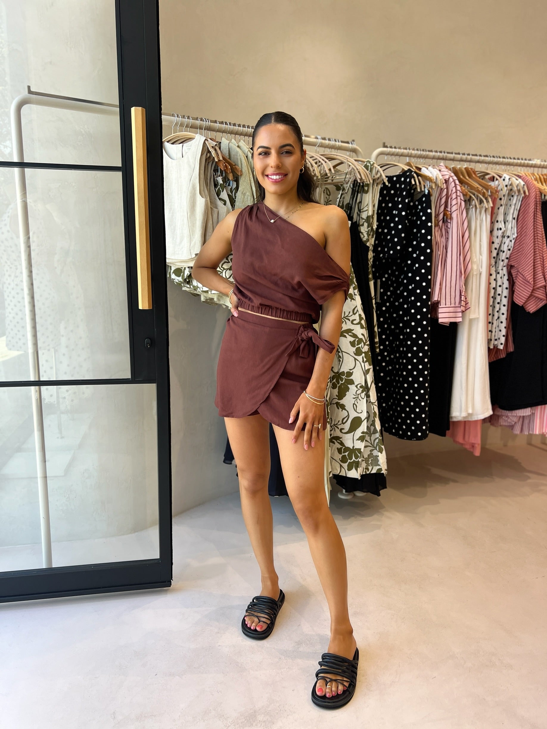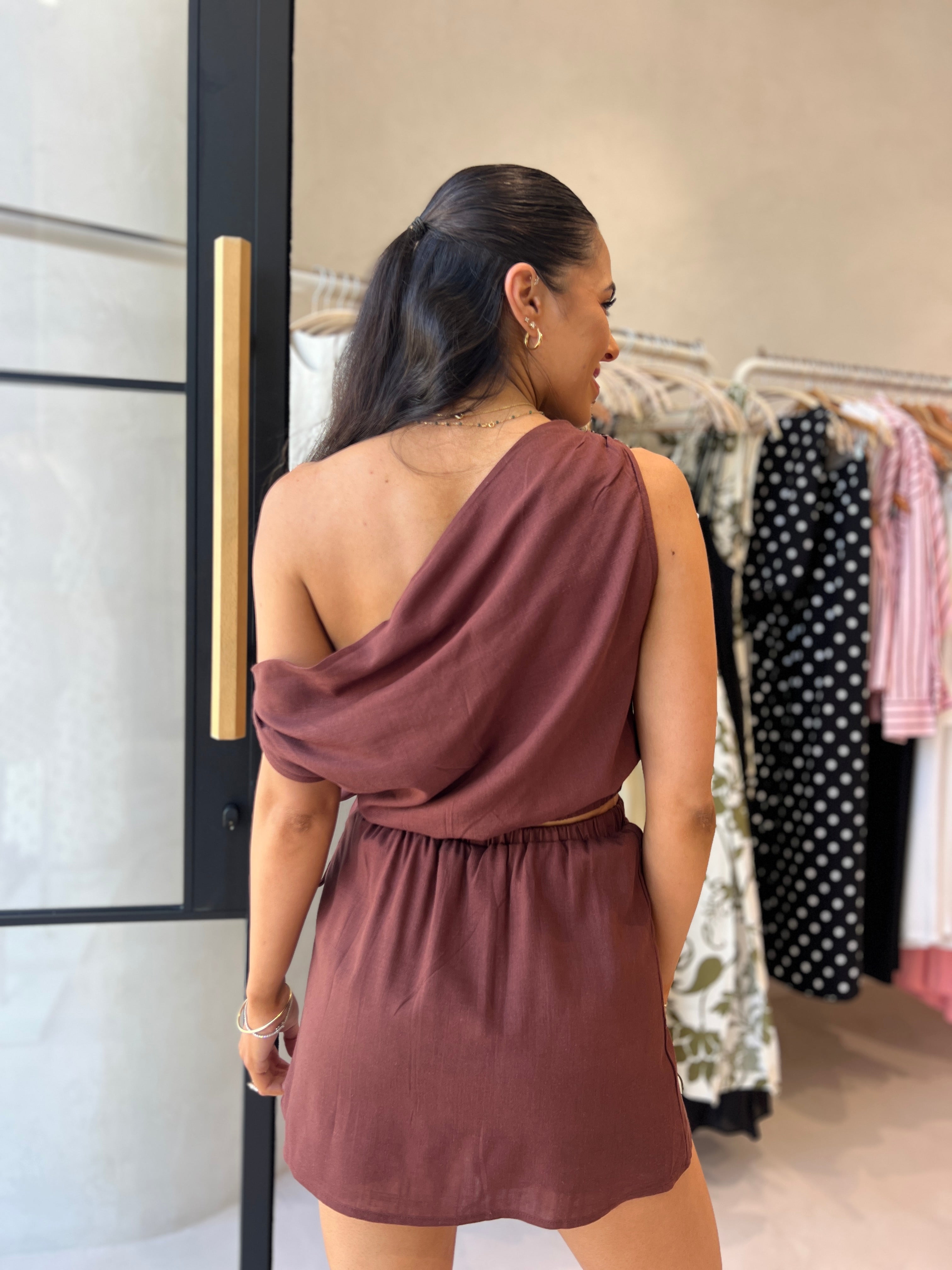 BROWN OFF SHOULDER SKORT SET