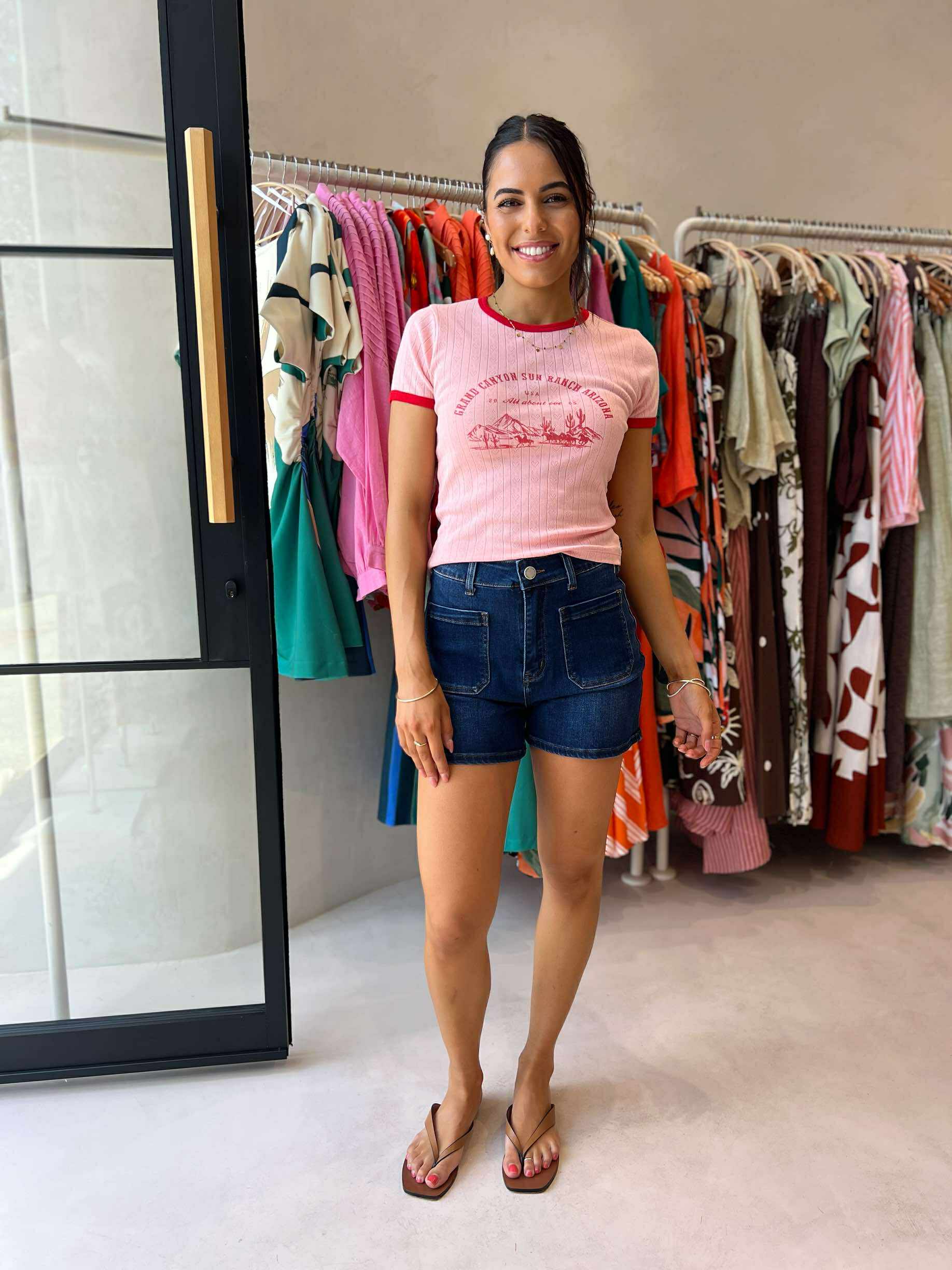 The Canyon Sun Baby Tee features a red graphic on blush pink cotton pointelle for a vintage-meets-dreamy feel. With its baby tee fit and delicate texture, it pairs perfectly with a denim mini skirt or a flowing maxi skirt for a touch of carefree charm.