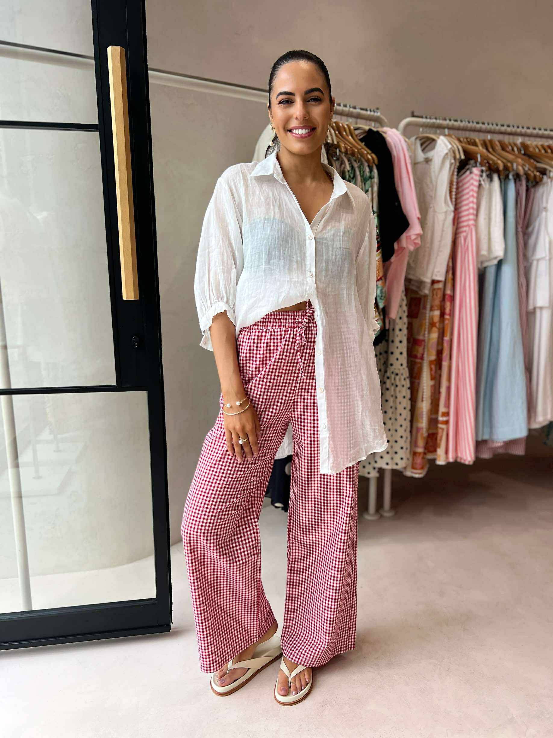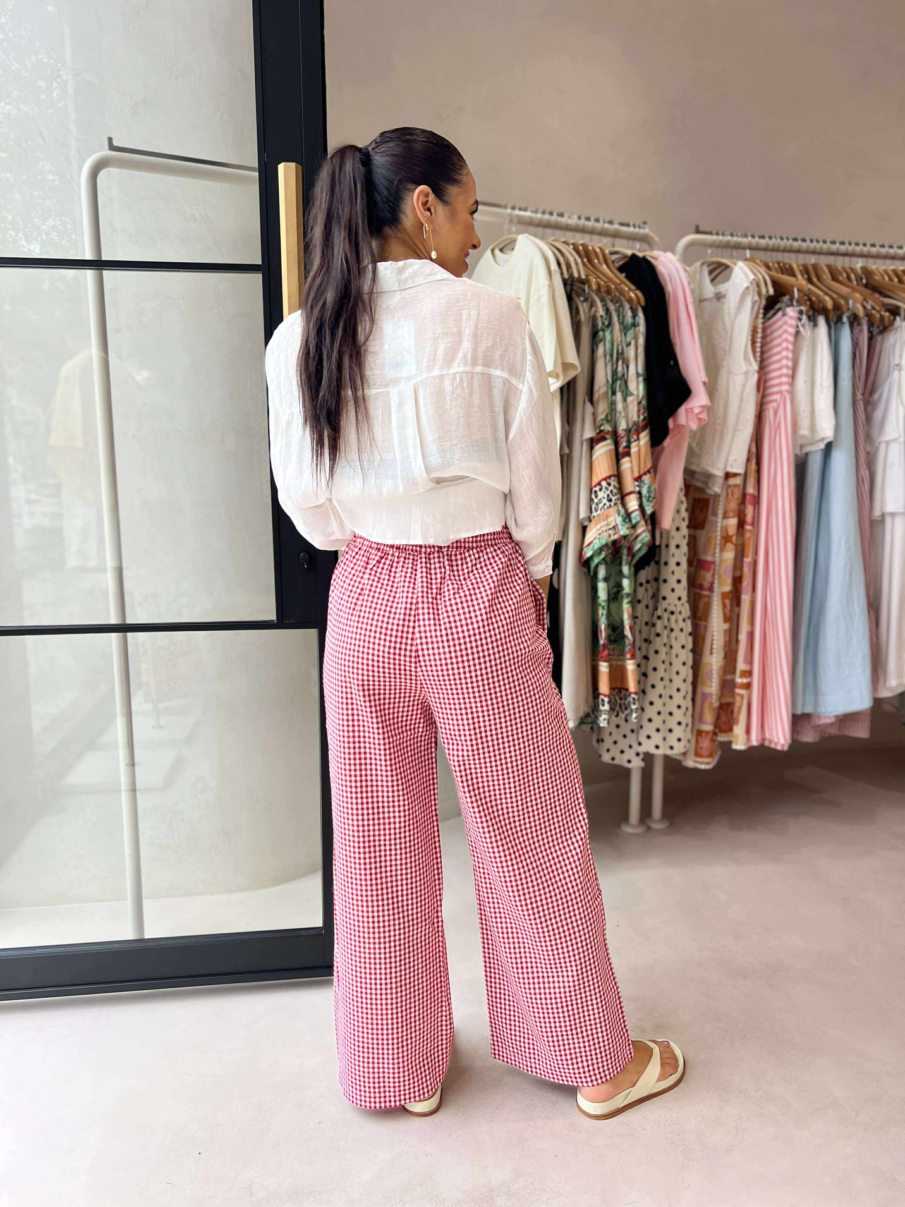 Stay effortlessly stylish and comfortable with these red and white checkered pants. Made from a breathable linen blend, they feature a relaxed fit, elasticated waistband with an adjustable tie, and convenient side pockets — perfect for everyday wear or laid-back weekends.