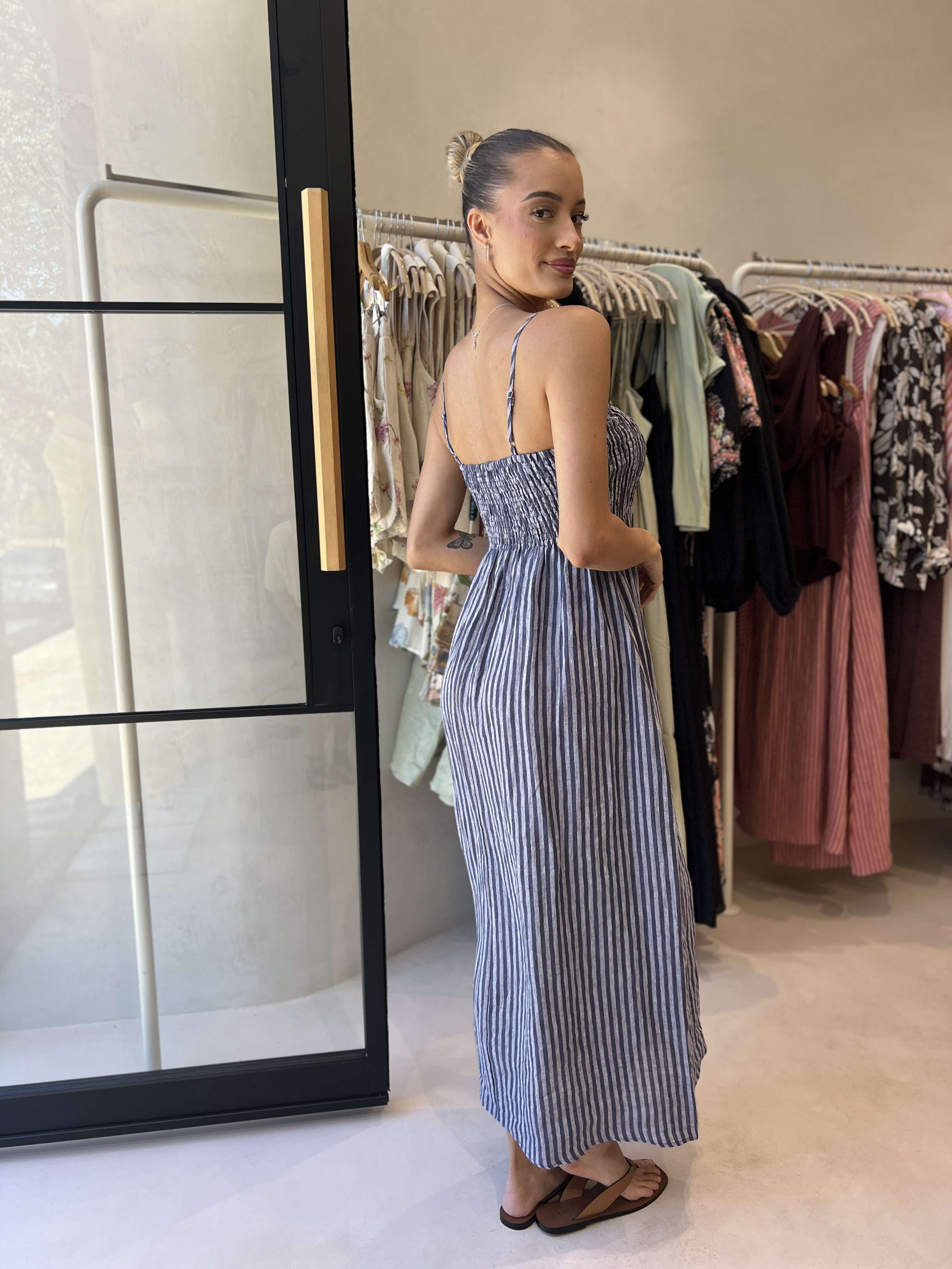 A relaxed summer essential, the Chicago Dress is crafted from a breathable, textured linen with a denim blue and natural stripe. The shirred bodice with adjustable spaghetti straps, offers comfort and shape, while the floaty, full-length skirt adds effortless elegance.