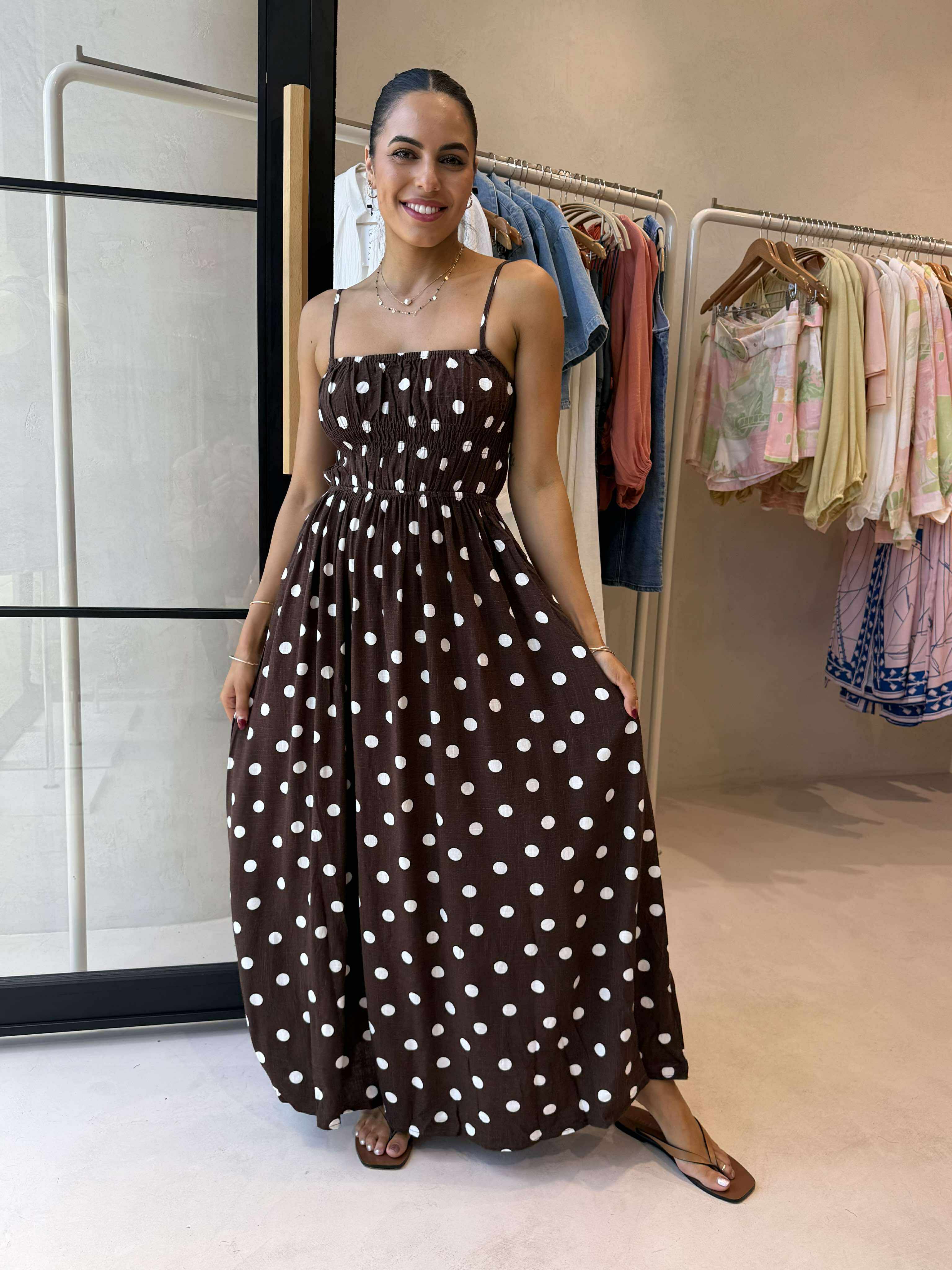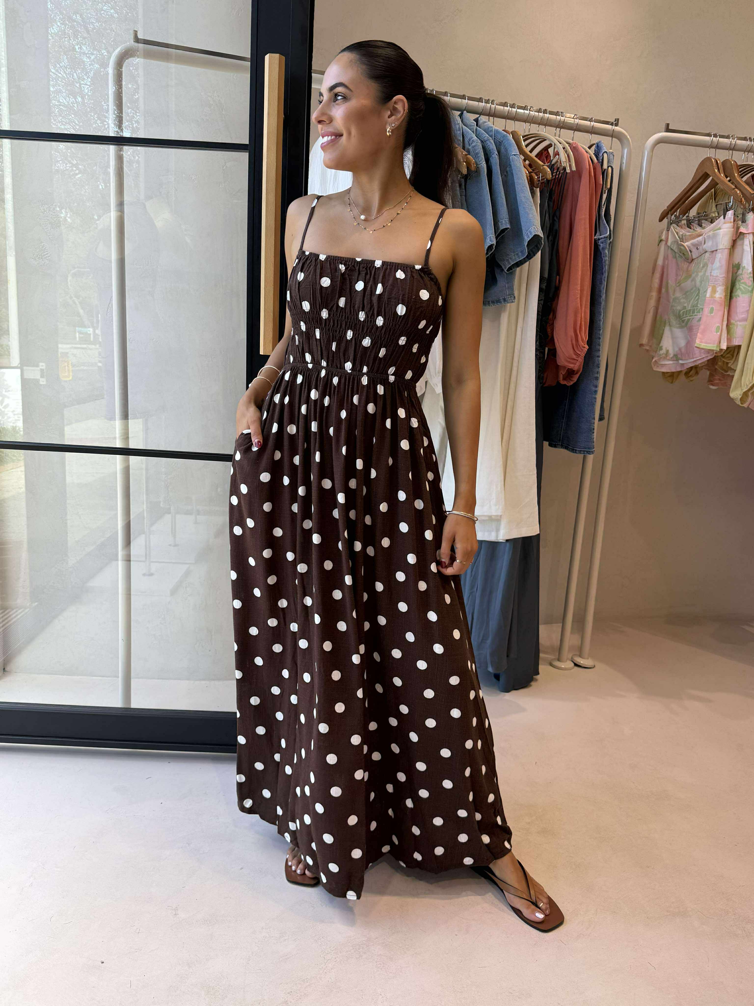 The Clarissa Thin Strap Maxi features a square neckline, adjustable spaghetti straps, and an elasticated bust for a comfortable fit. With a breezy pull-on style, side pockets, and a flattering maxi length, it’s perfect for effortless everyday wear. Made from a lightweight rayon/linen blend. Model wears size 8.