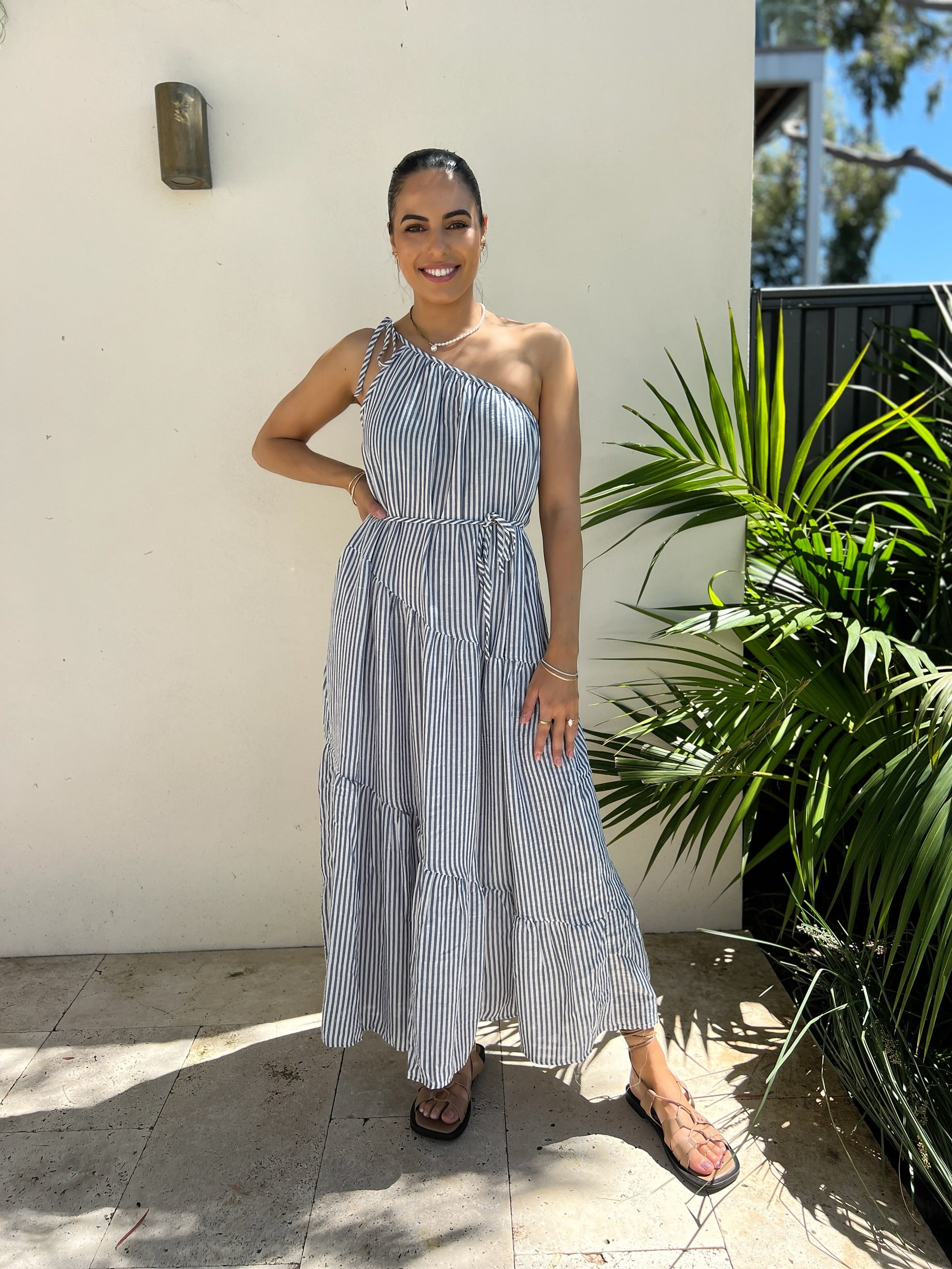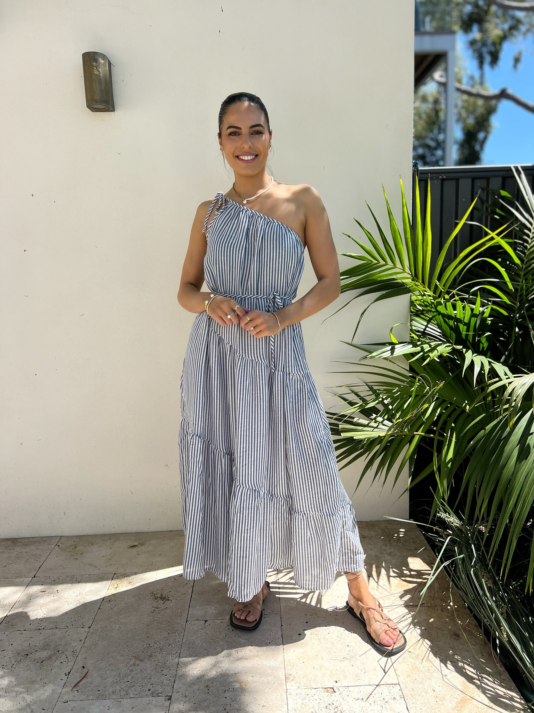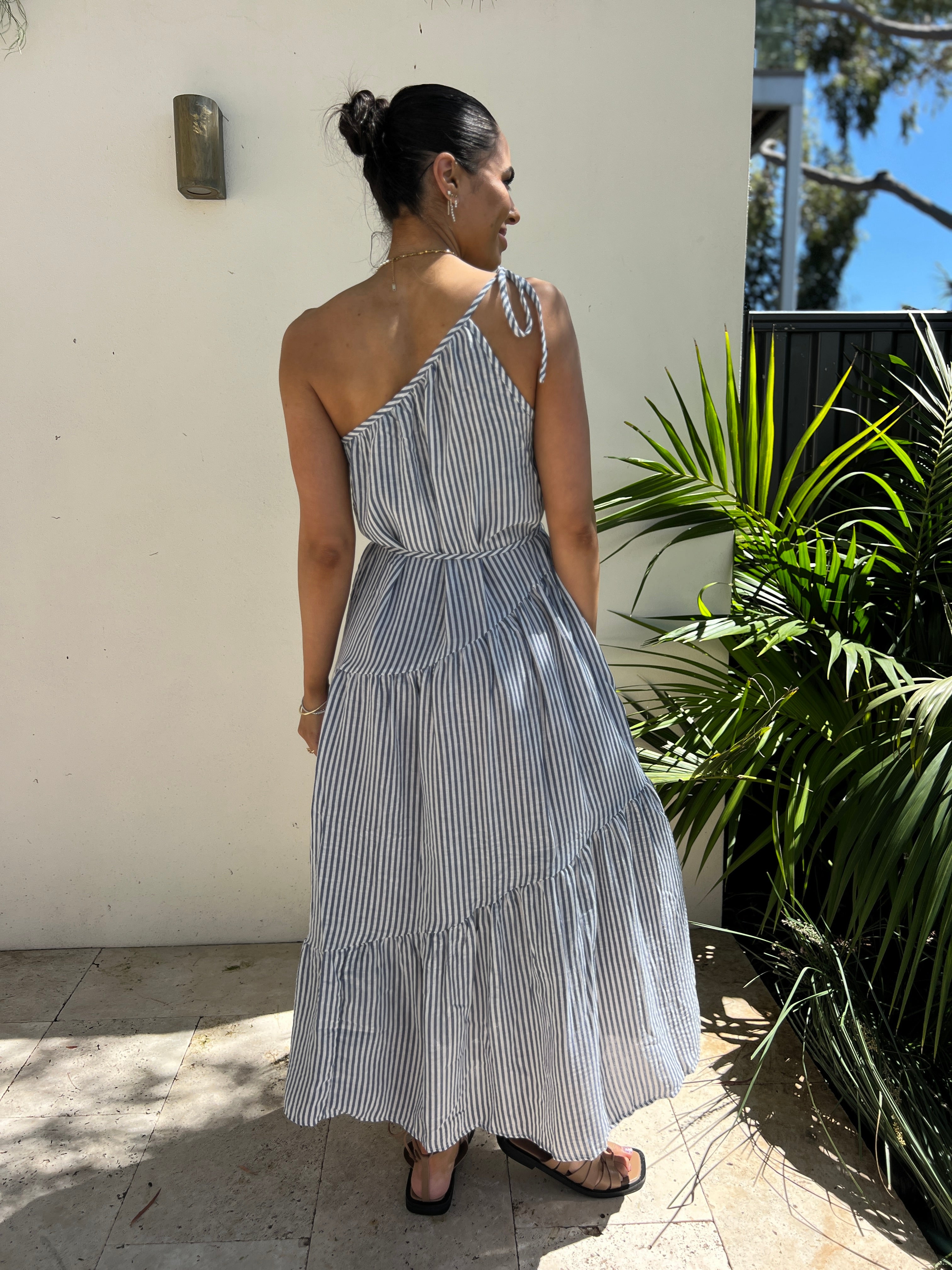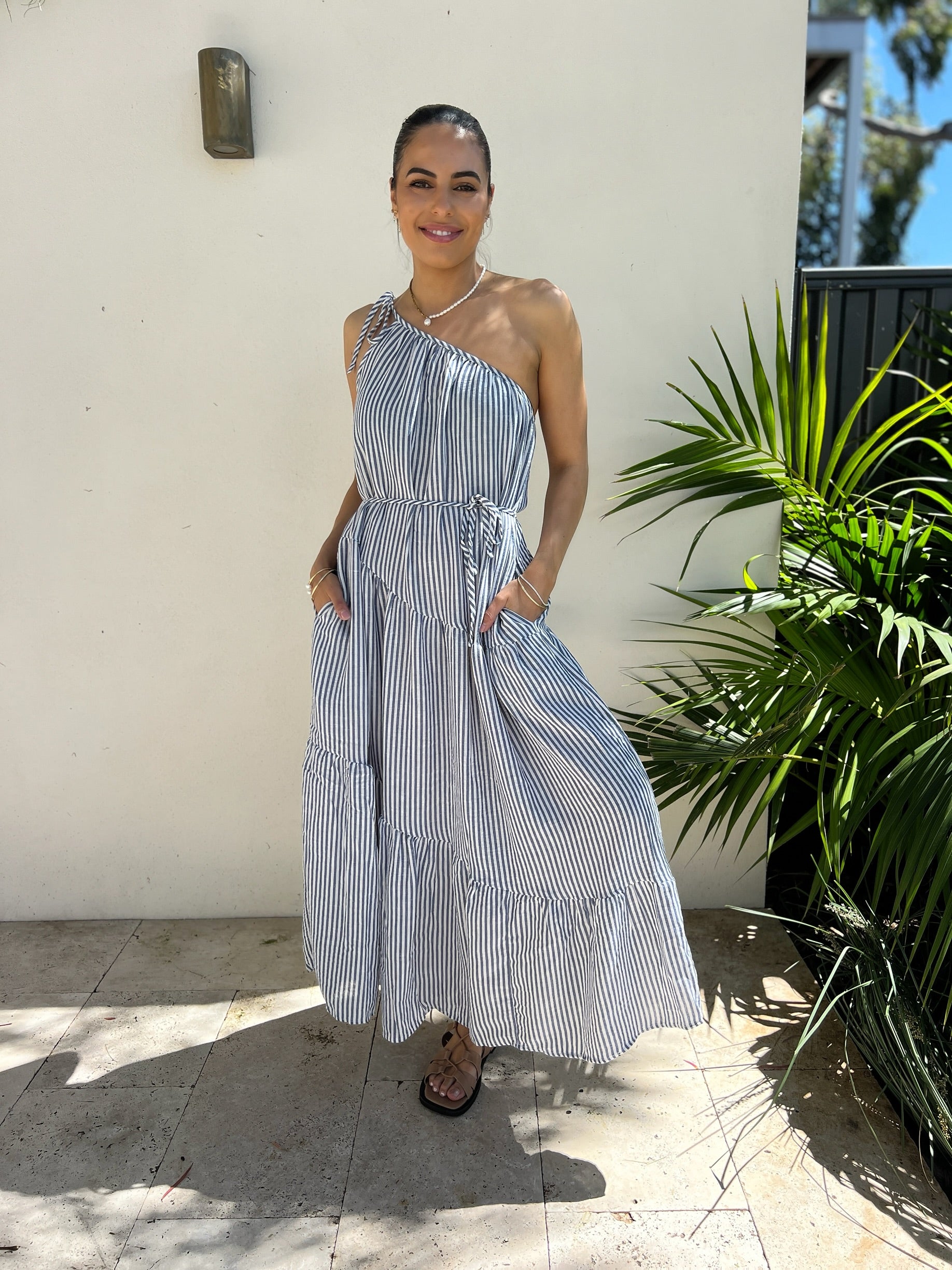 Make a statement in this effortless one-shoulder maxi dress, featuring bold blue and white stripes and a playful tie-up shoulder detail. With a relaxed fit, adjustable waist tie, practical pockets, and a flowing tiered hem, it's the perfect blend of comfort and style for sunny days or laid-back evenings.