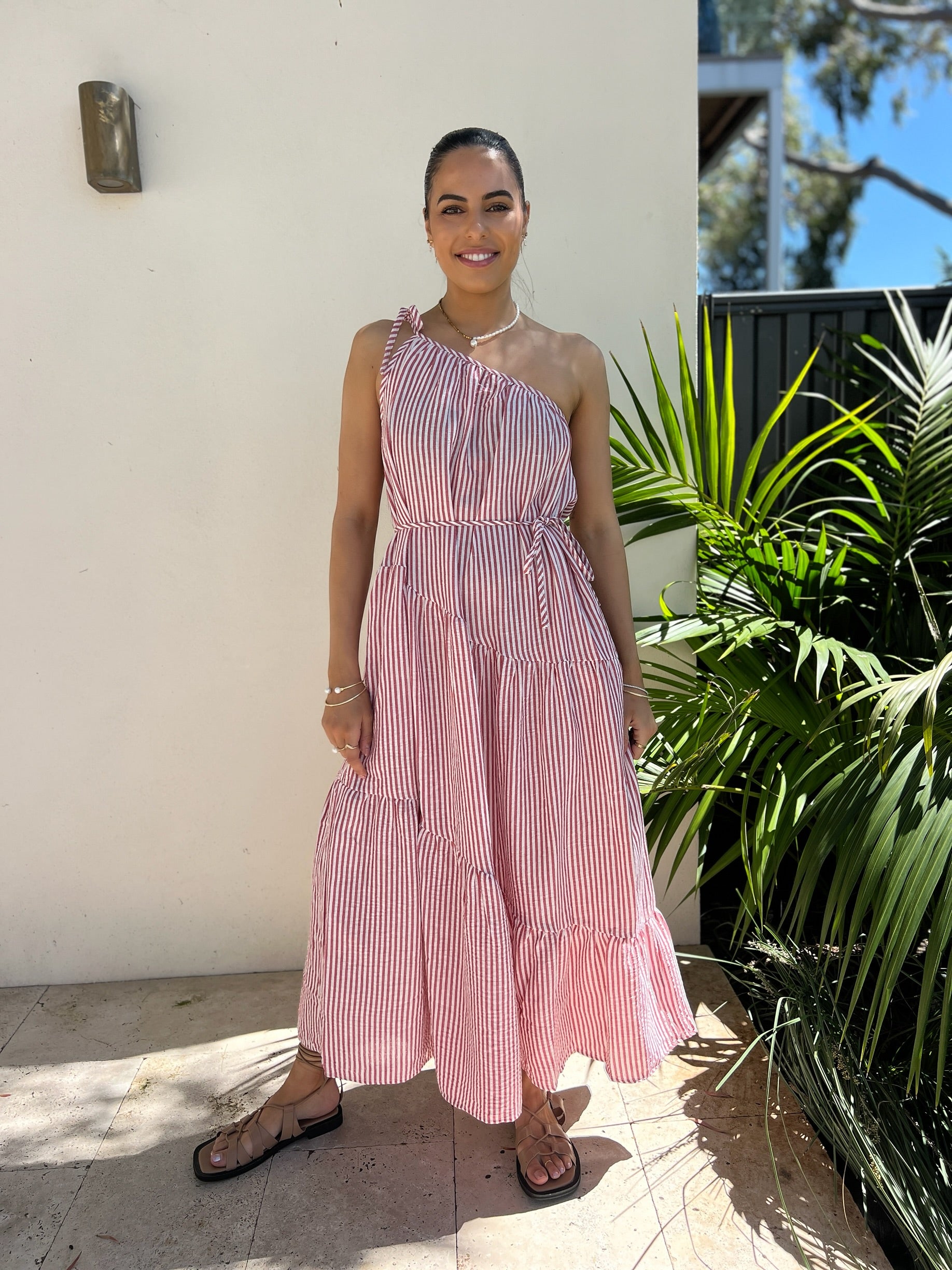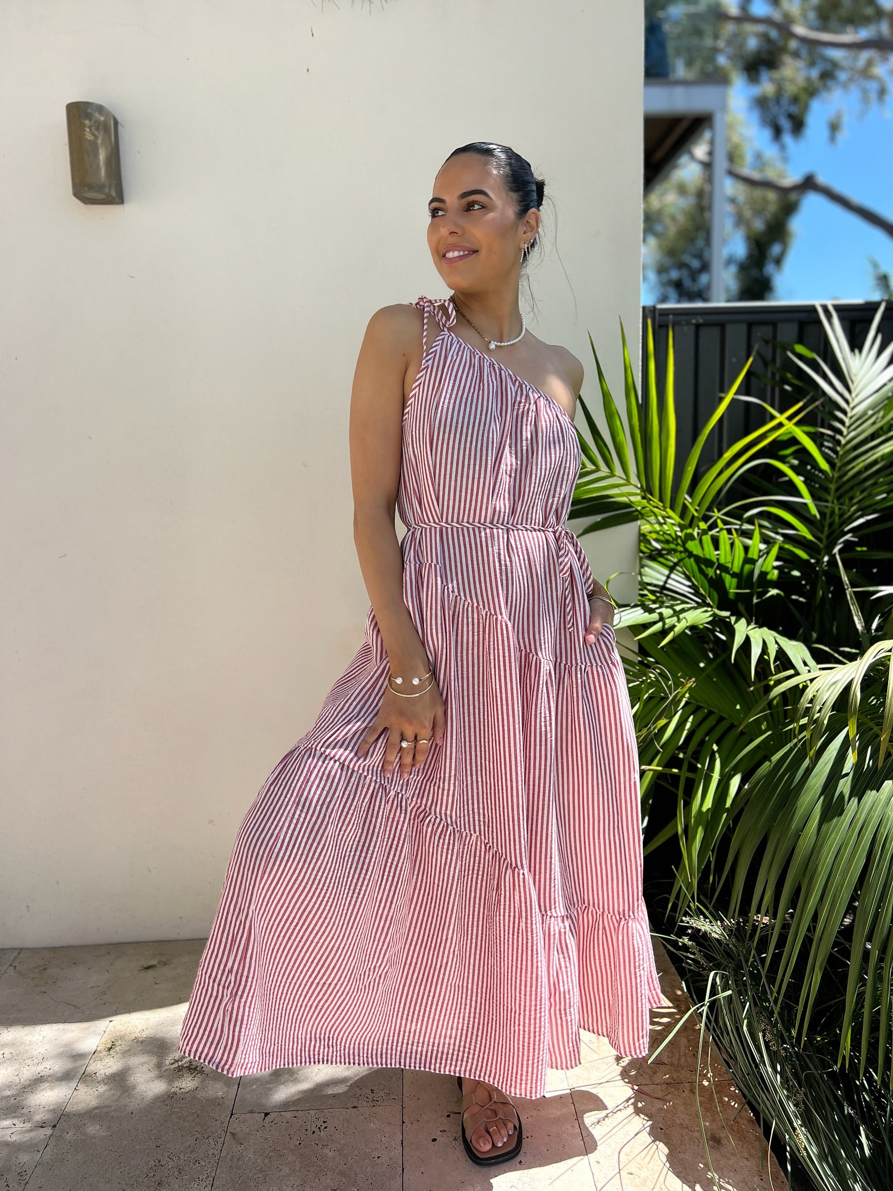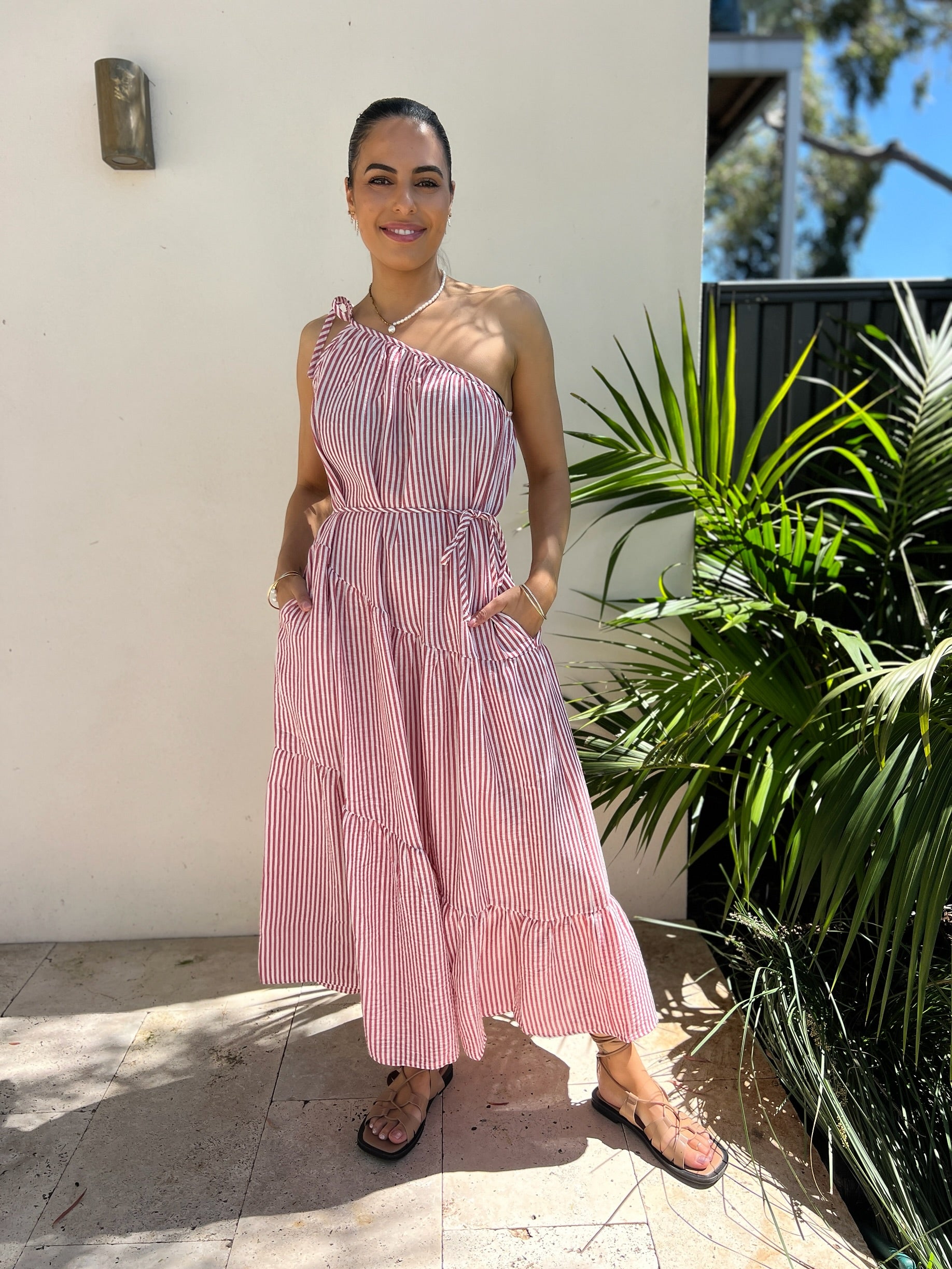 Make a statement in this effortless one-shoulder maxi dress, featuring bold red and white stripes and a playful tie-up shoulder detail. With a relaxed fit, adjustable waist tie, practical pockets, and a flowing tiered hem, it's the perfect blend of comfort and style for sunny days or laid-back evenings.