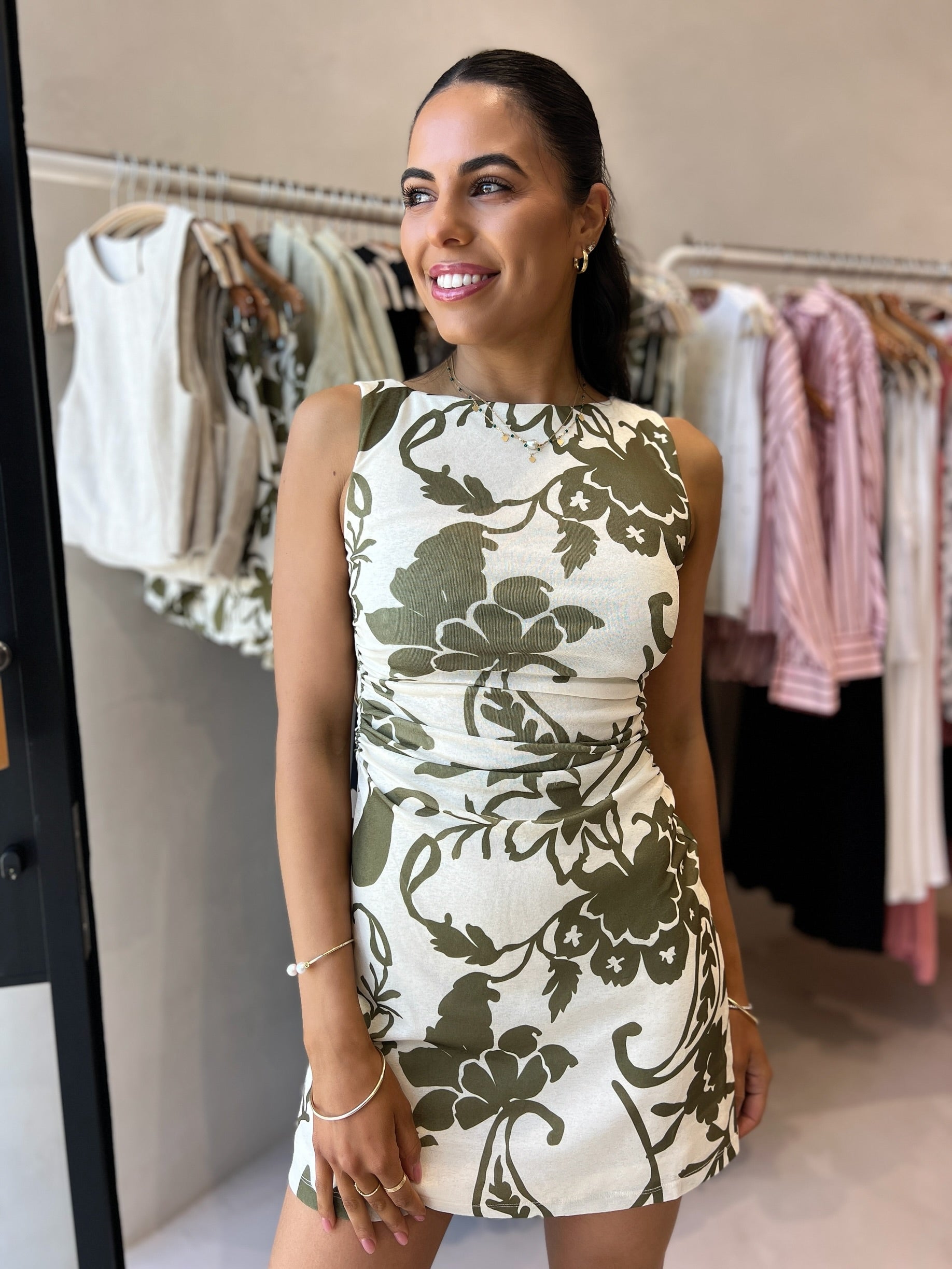 The Dahlia Mesh Mini Dress is made from a stretch jersey in our exclusive Dahlia print. The silhouette is fitted through the body, with a slight A-line shape at hem and mini in length. Features include a wide boat neckline and soft gathering through the waist. This dress is fully lined.