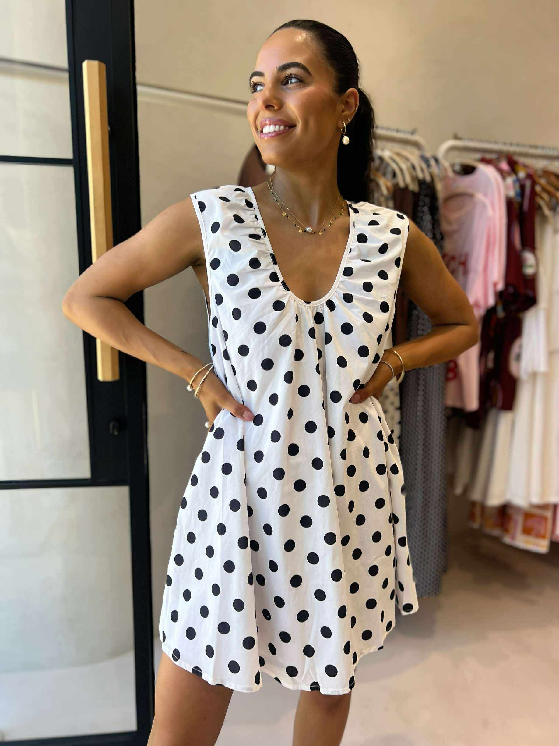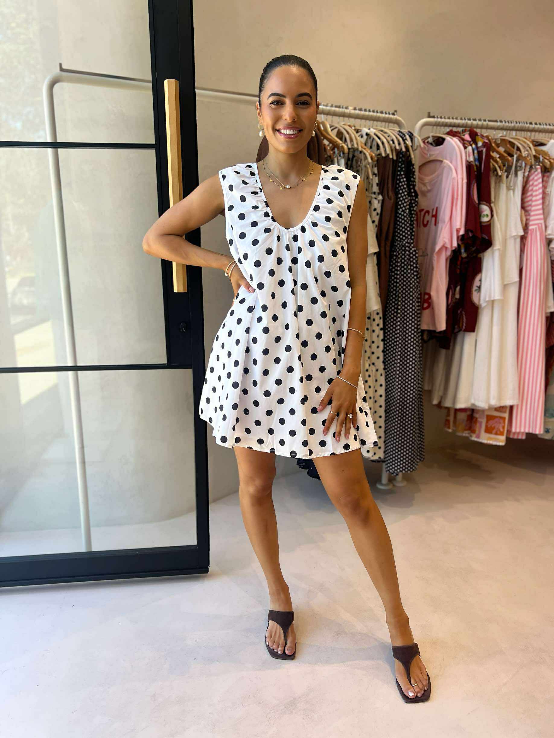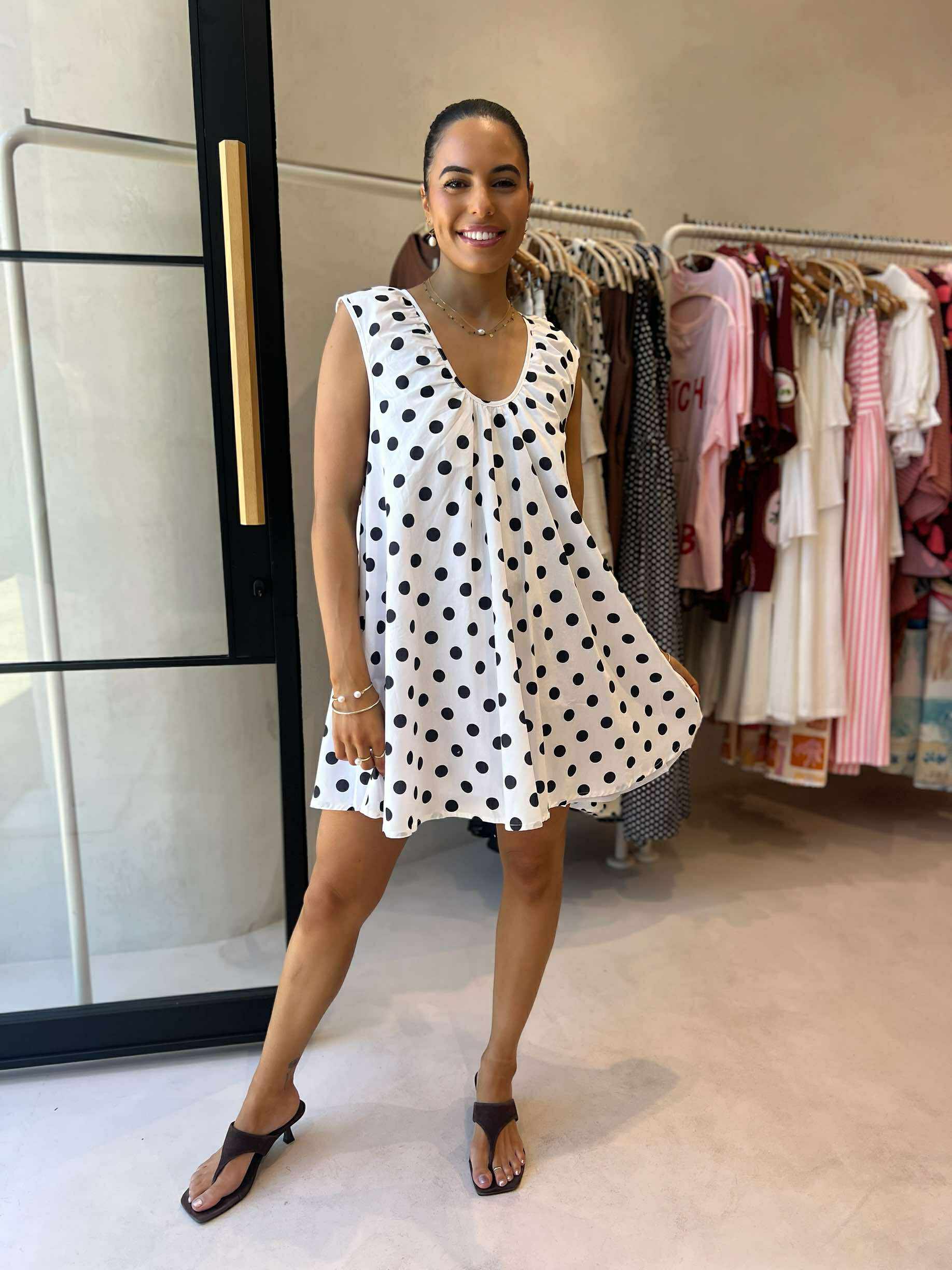 Effortlessly chic, this sleeveless mini dress features a scooped neckline and a loose, relaxed fit for all-day comfort. Designed in crisp white with playful black dots and fully lined for ease, it's the perfect throw-on-and-go piece for warm, sunny days.