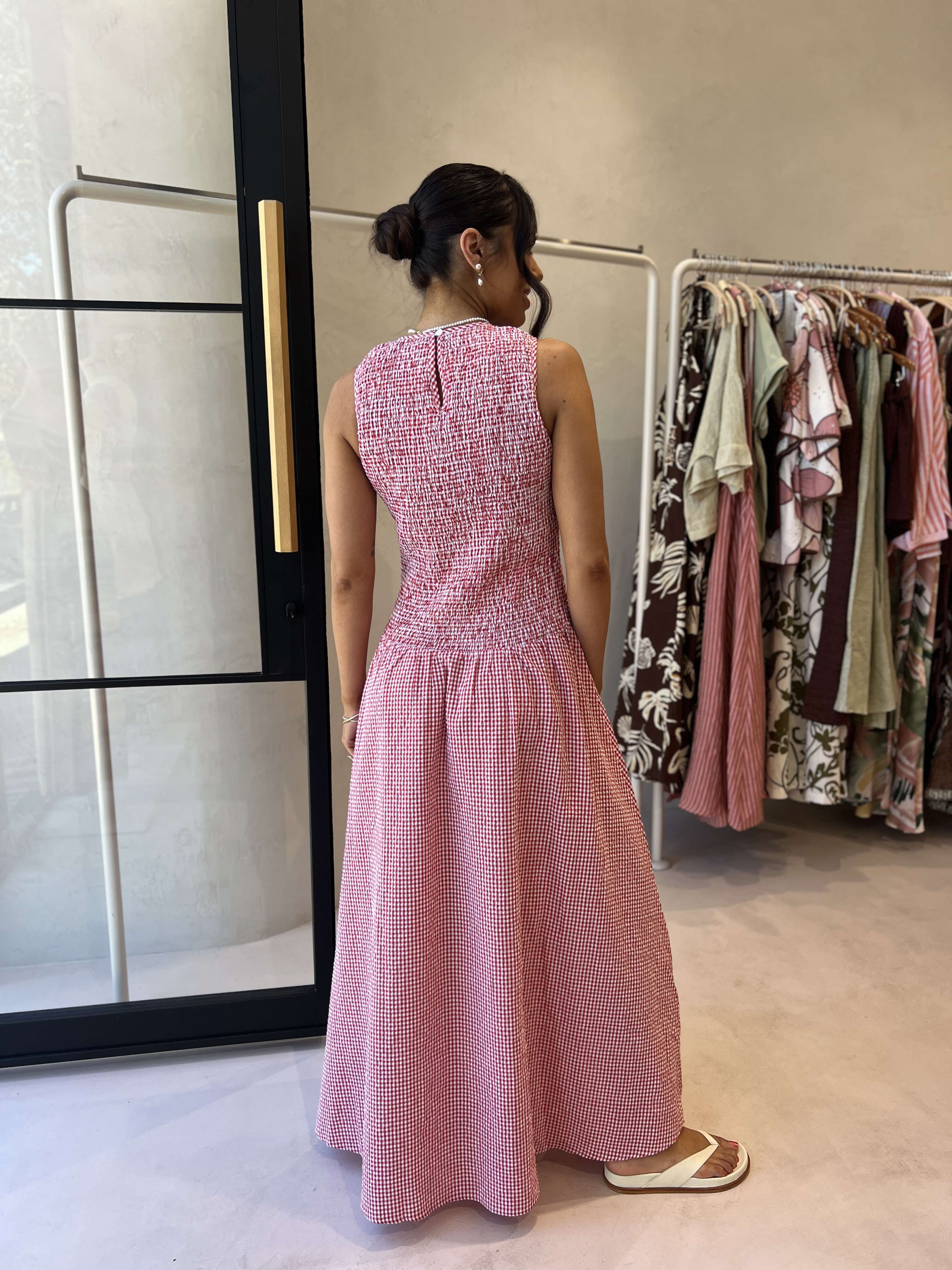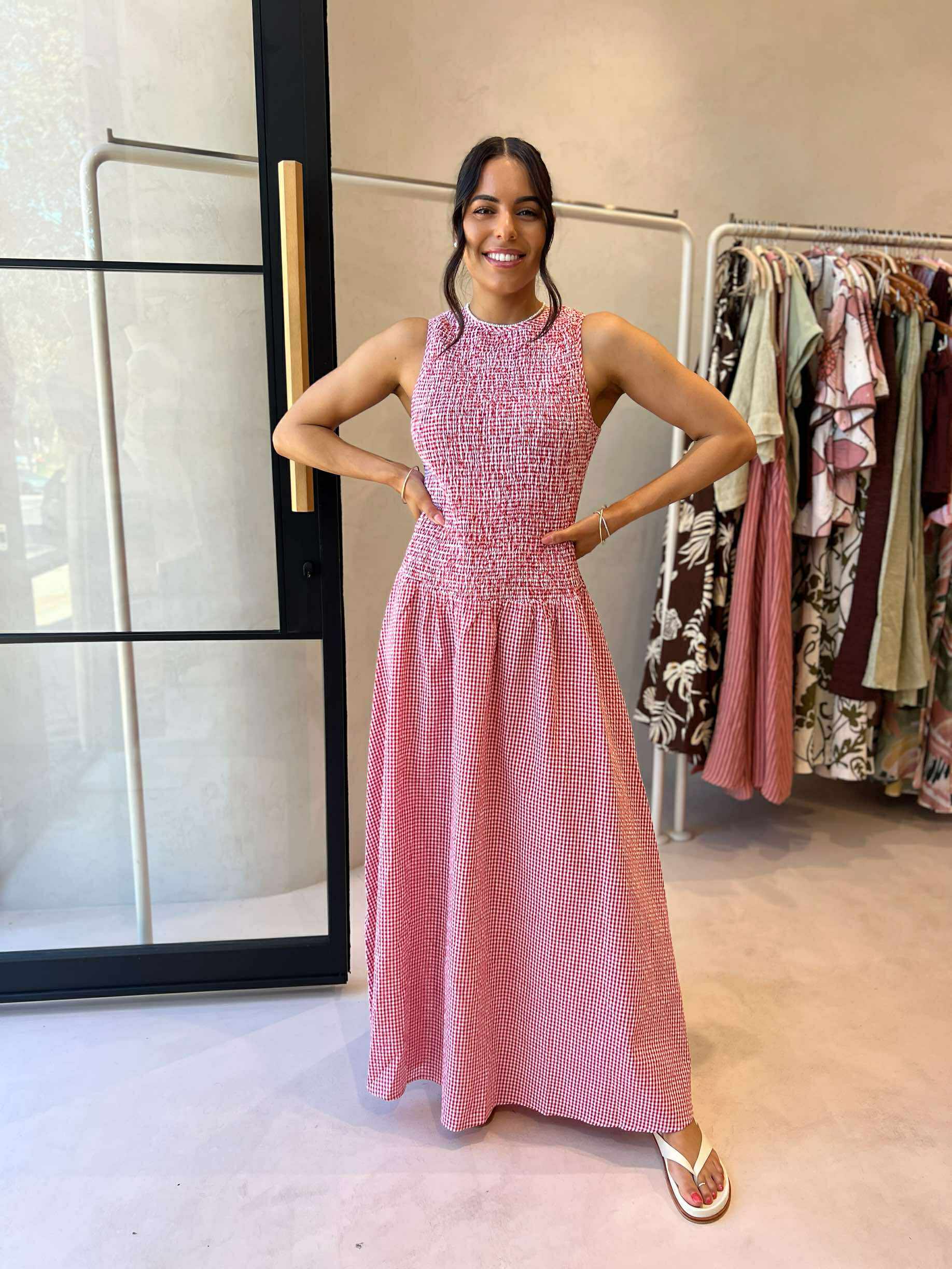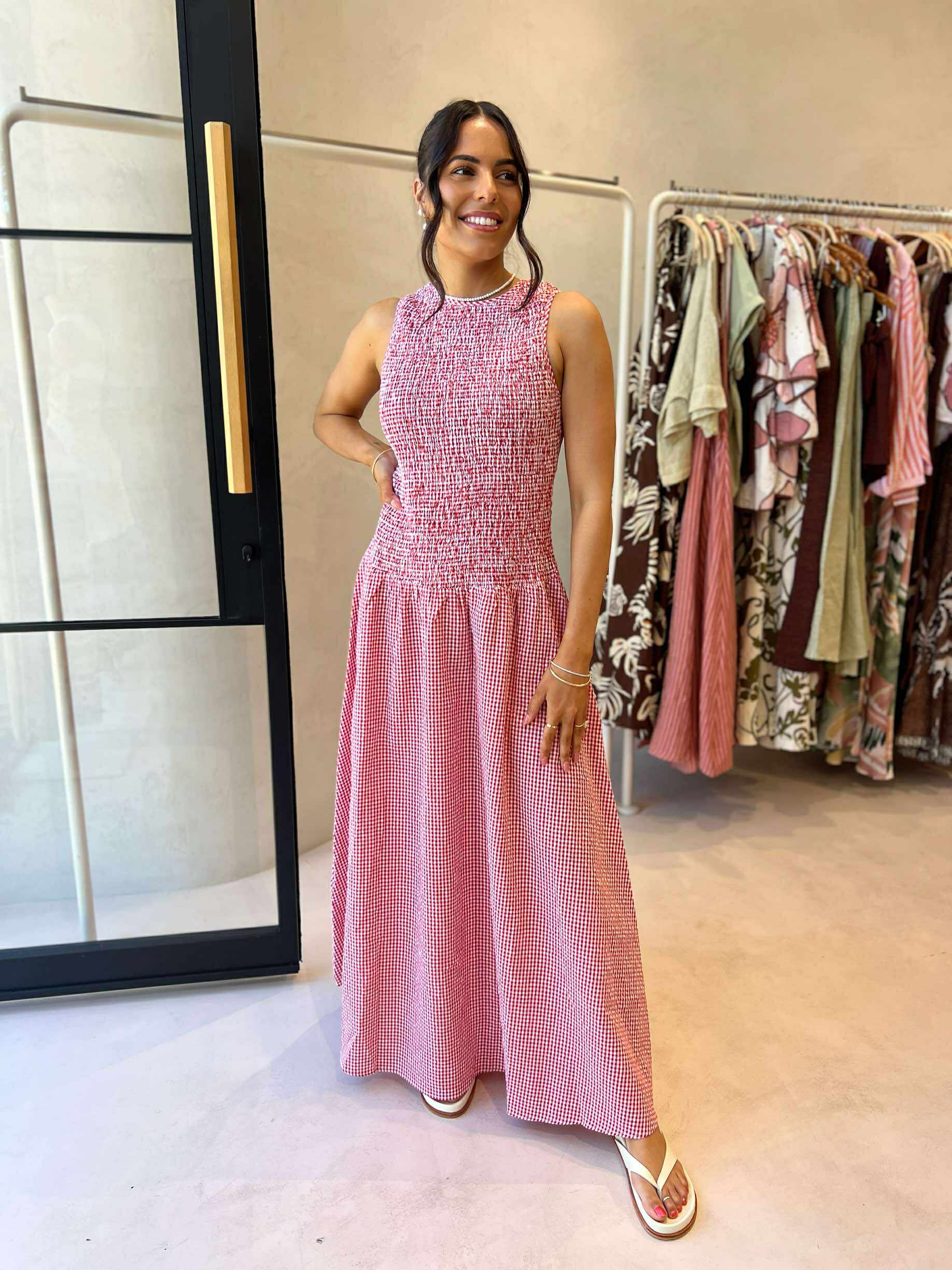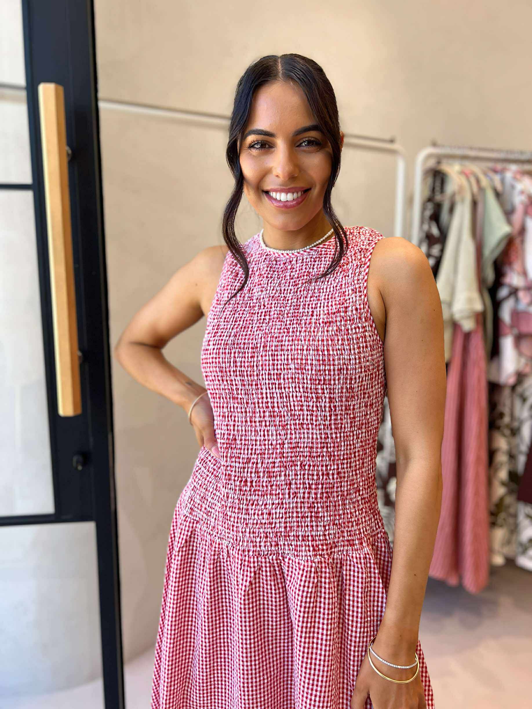 Fresh and feminine, our red and white gingham dress is a timeless statement for warm days. Featuring a sleeveless design and a fitted shirred bodice for a comfortable, flattering fit, it flows into a relaxed skirt that moves effortlessly with you. Finished with a button closure at the back neckline, this piece combines classic charm with everyday ease — perfect for picnics, brunches, or sunny weekend strolls.
