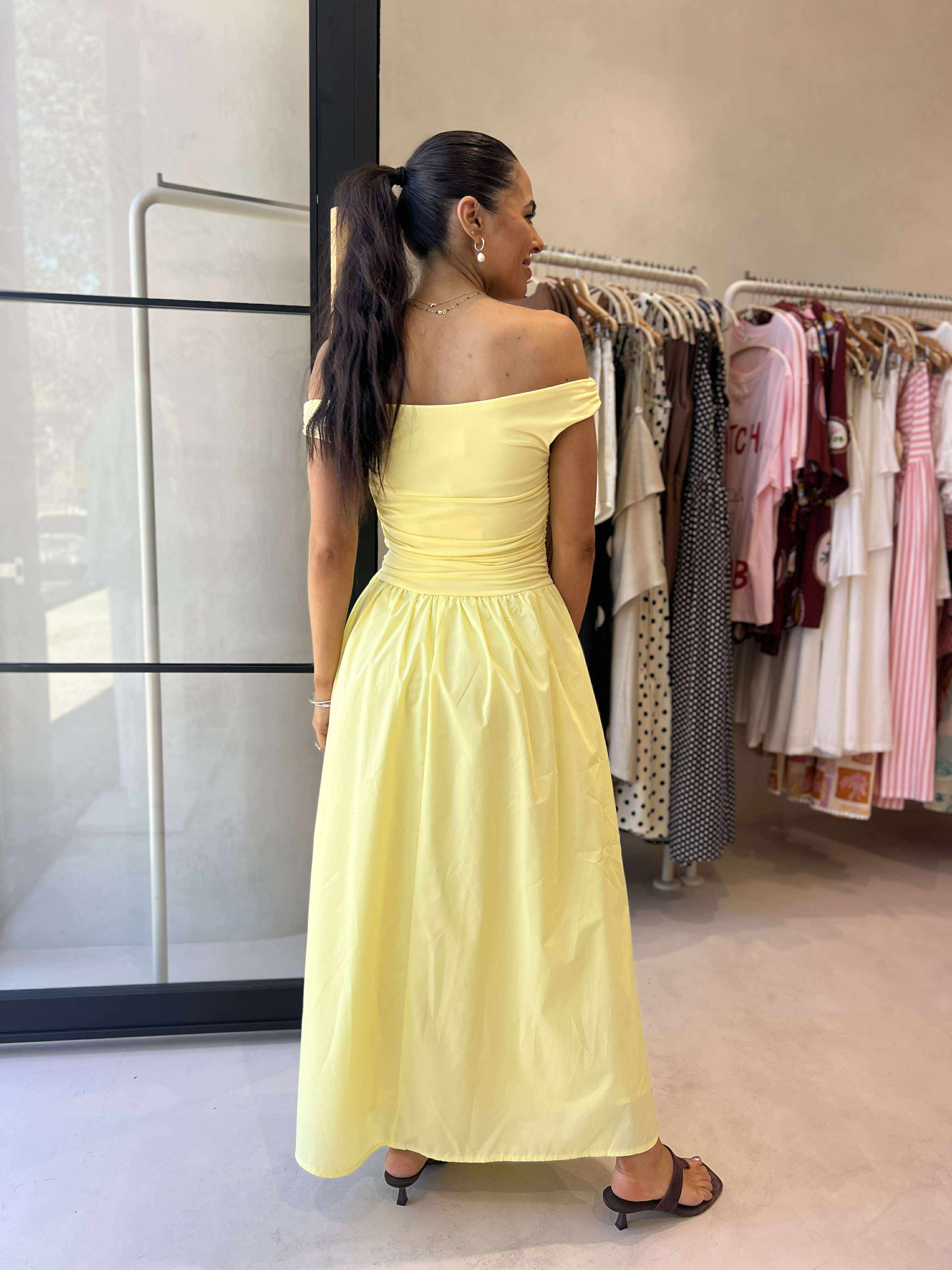 Make a statement in this stunning yellow maxi dress, featuring an off-shoulder neckline and a fitted, stretch bodice that flatters your shape. The fully lined skirt flows effortlessly with a relaxed fit, offering both comfort and elegance for any occasion.