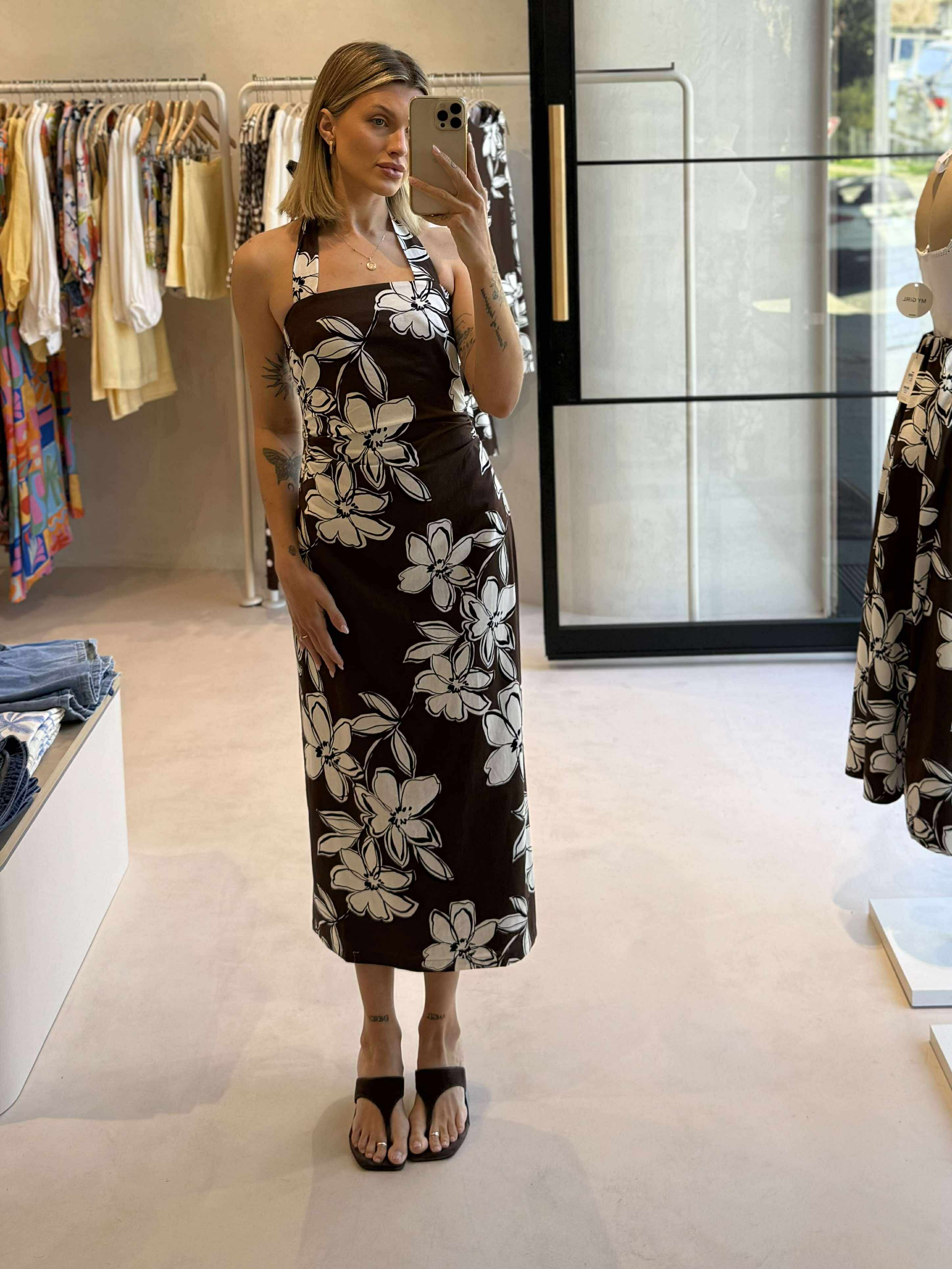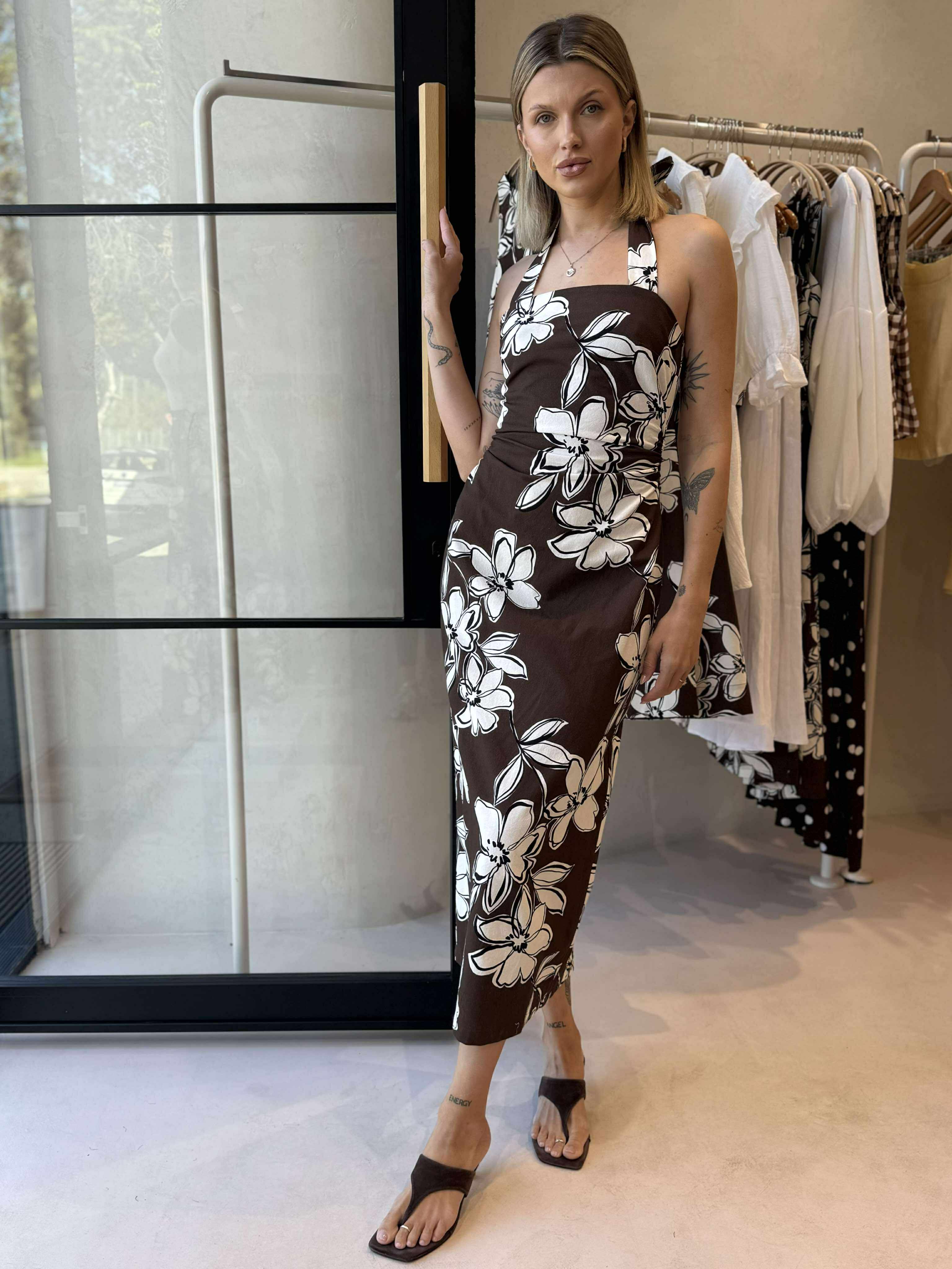 The Elara Brown & White Cotton Floral Halter-Neck Midi Dress is a show-stopping style with a bold chocolate brown floral print. Crafted from 100% cotton with a smooth viscose lining, it features a halter neckline with tie fastening, a fitted bodice, and a sleek midi-length skirt with a back split for ease of movement. Perfect for summer occasions, garden parties, or elegant evenings out.