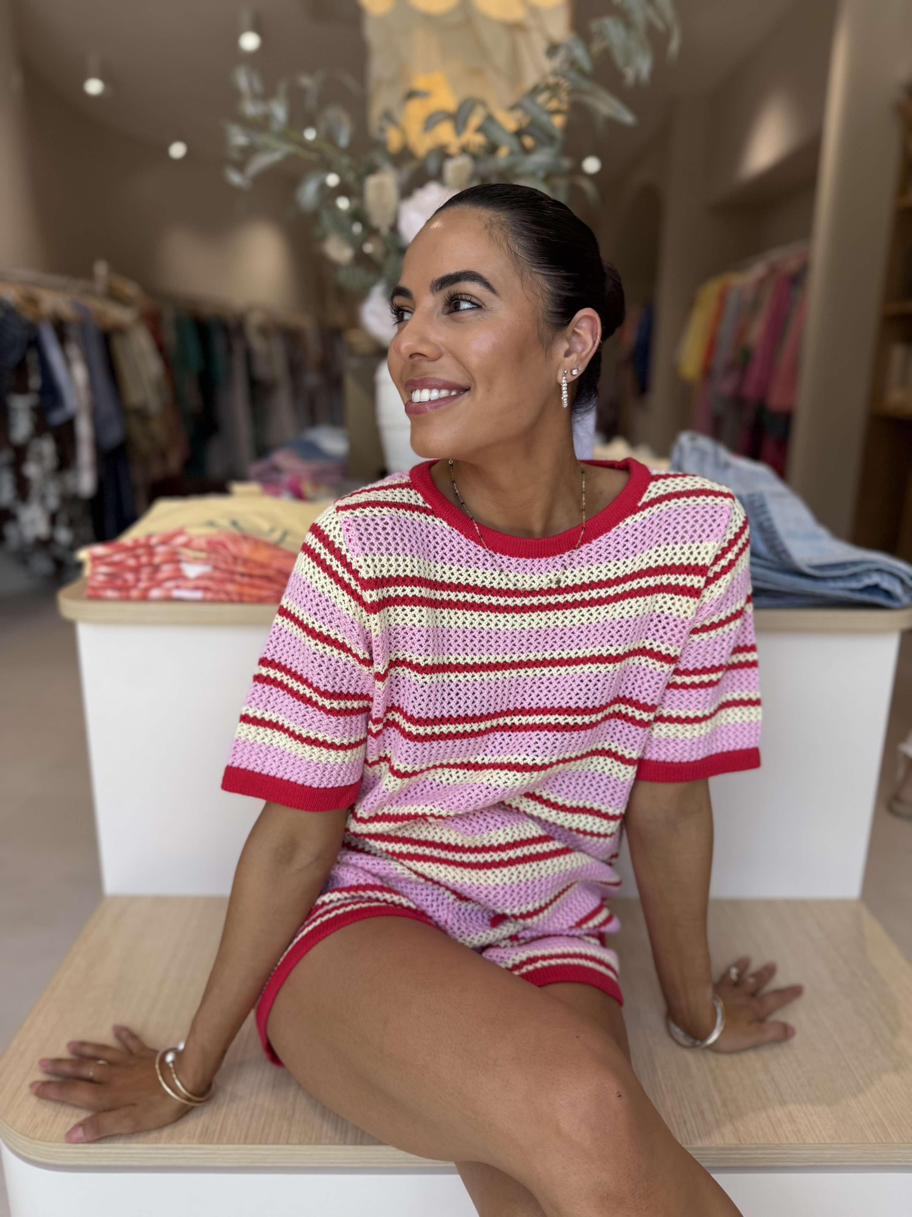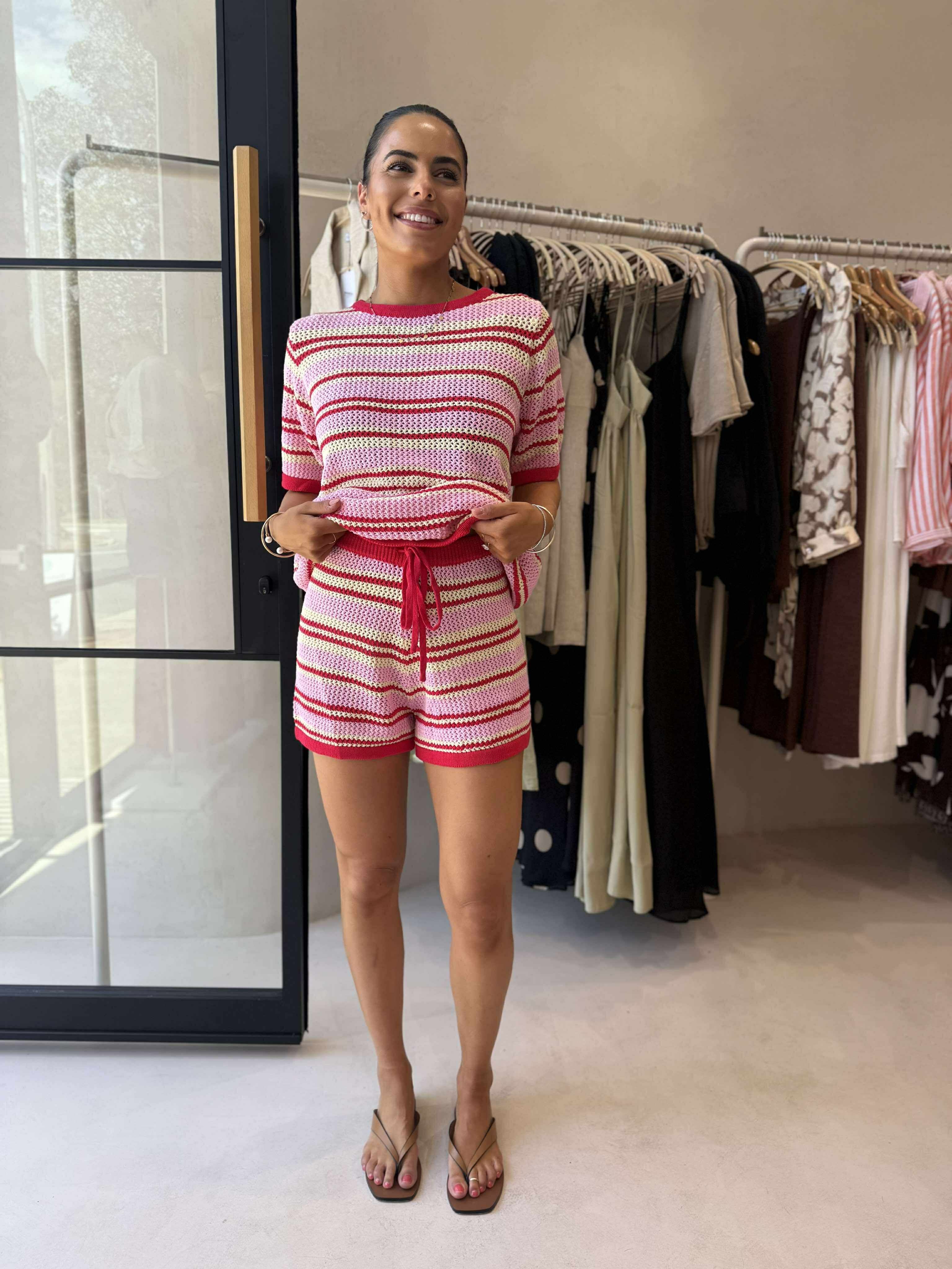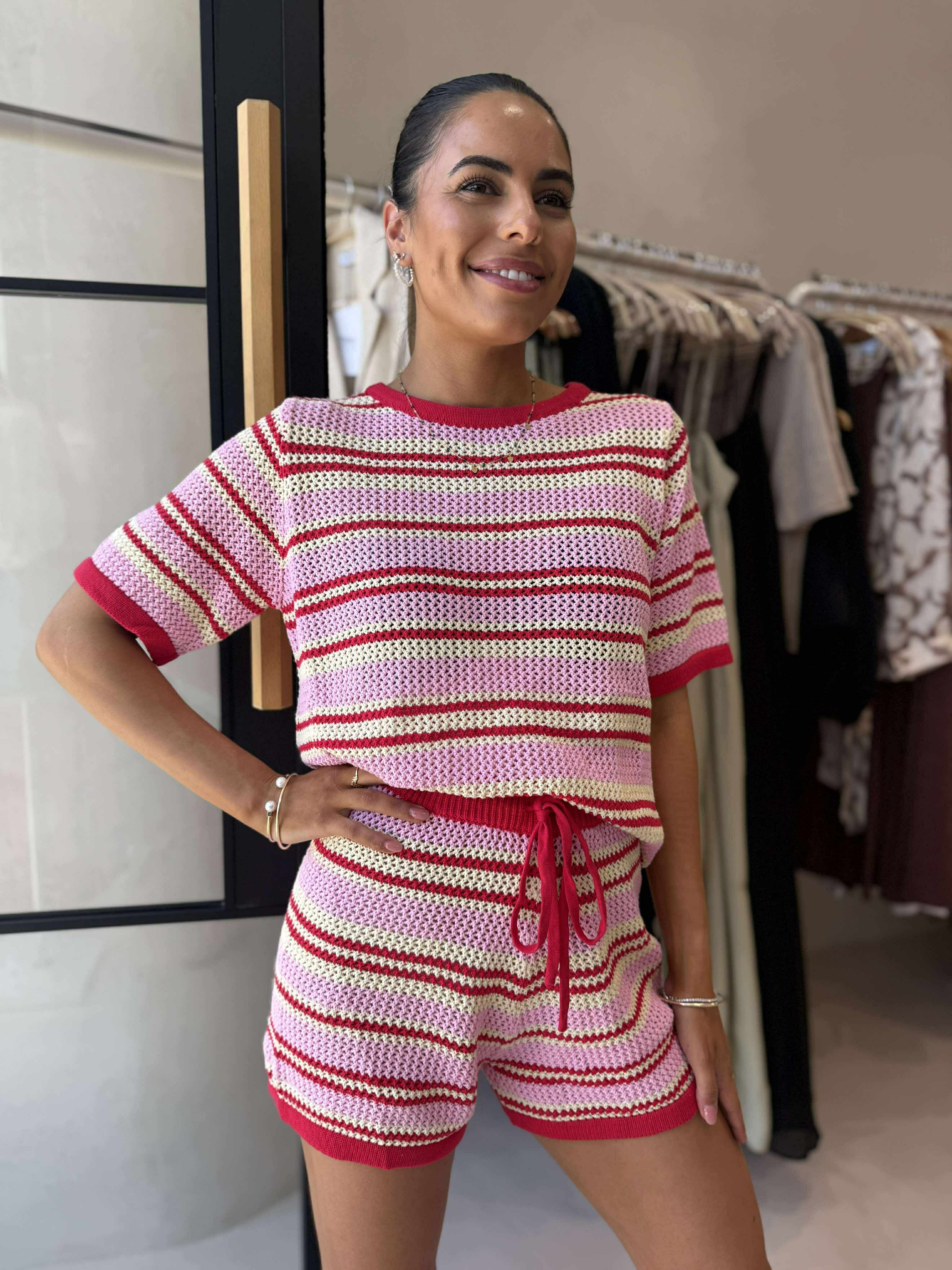 Turn heads in this gorgeous 100% cotton crochet set, featuring bold pink, red, and yellow contrast stripes. The matching shorts offer a comfy elasticated waistband with a functional drawstring for the perfect fit. Lightweight, breathable, and effortlessly stylish – perfect for sunny days and relaxed vibes.