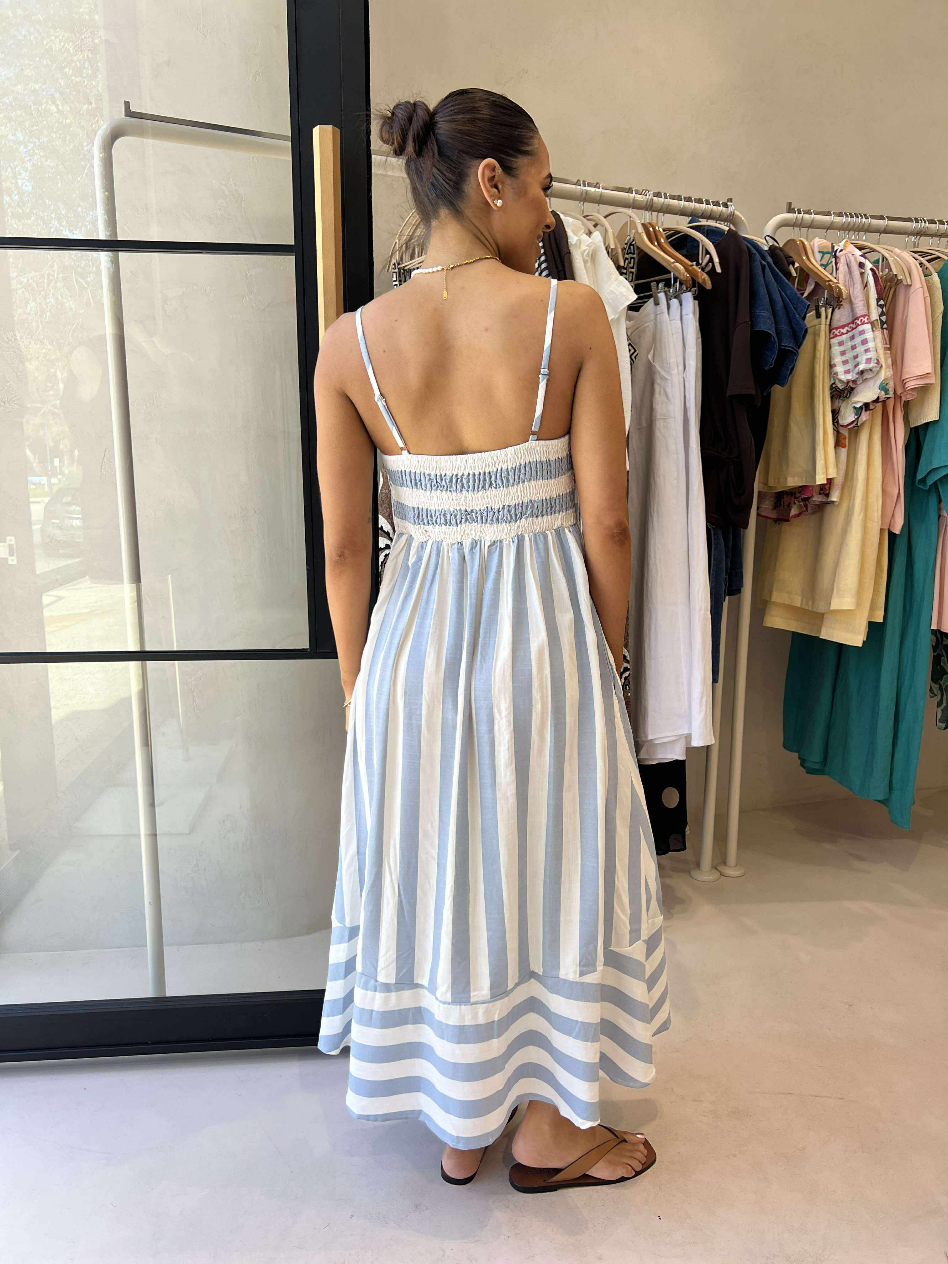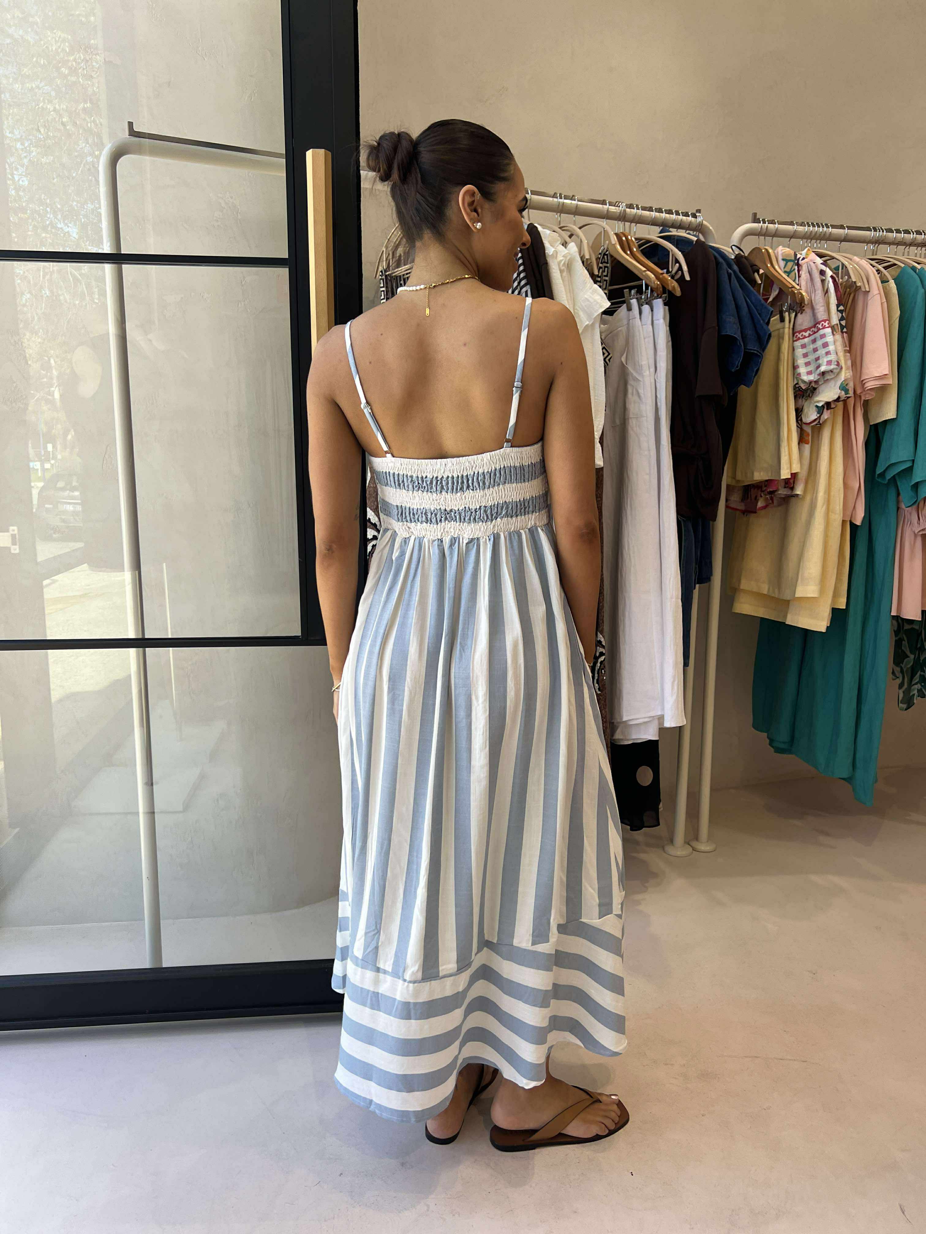 Effortlessly feminine, this light blue and white striped midi dress is perfect for sunny days. Featuring adjustable spaghetti straps, pockets and an elasticated back panel for a flexible, comfortable fit, it’s finished with a lightly lined bust and a soft, flowing skirt that moves with you. A go-to piece for picnics, brunches, or beachside strolls.