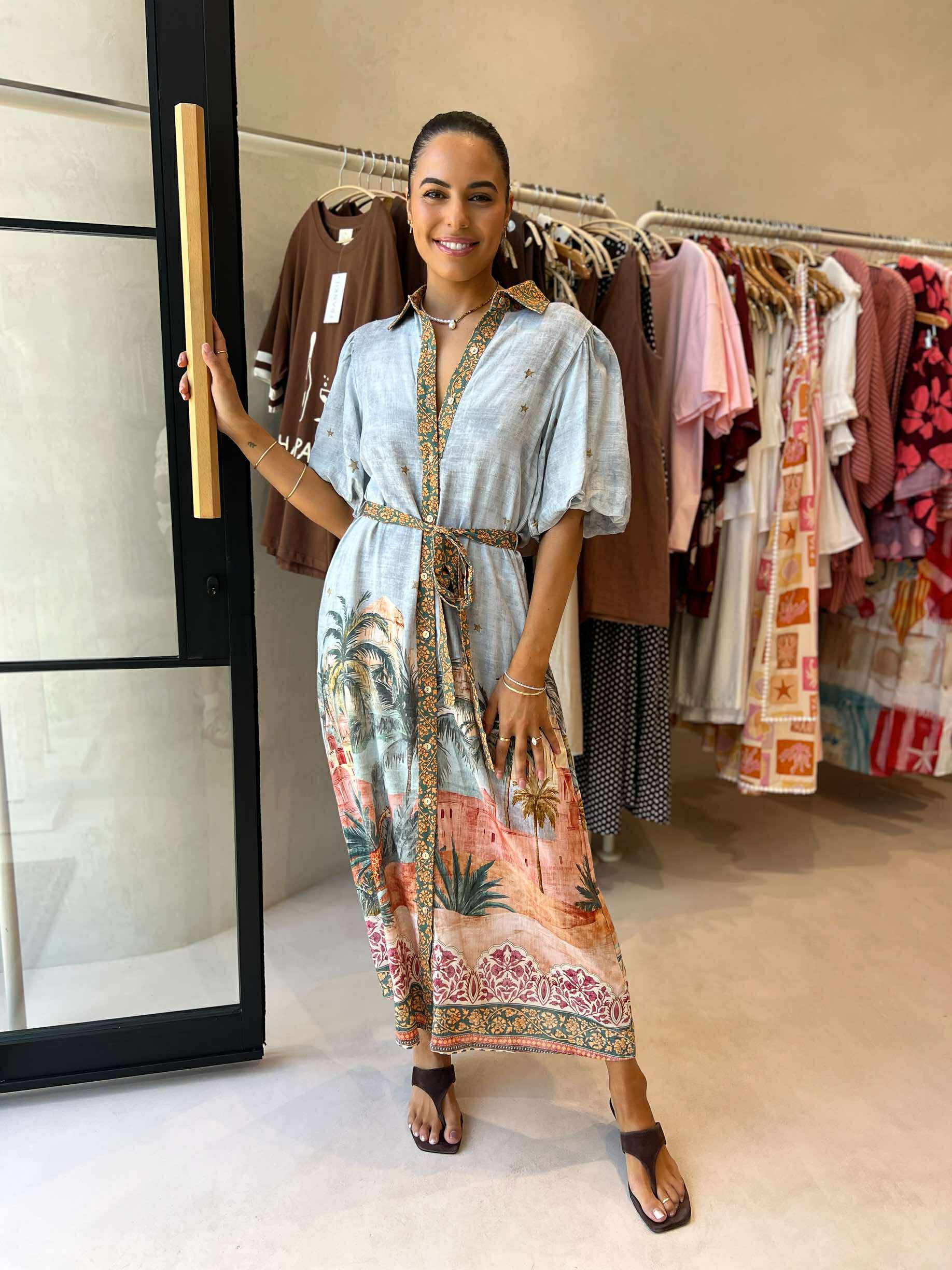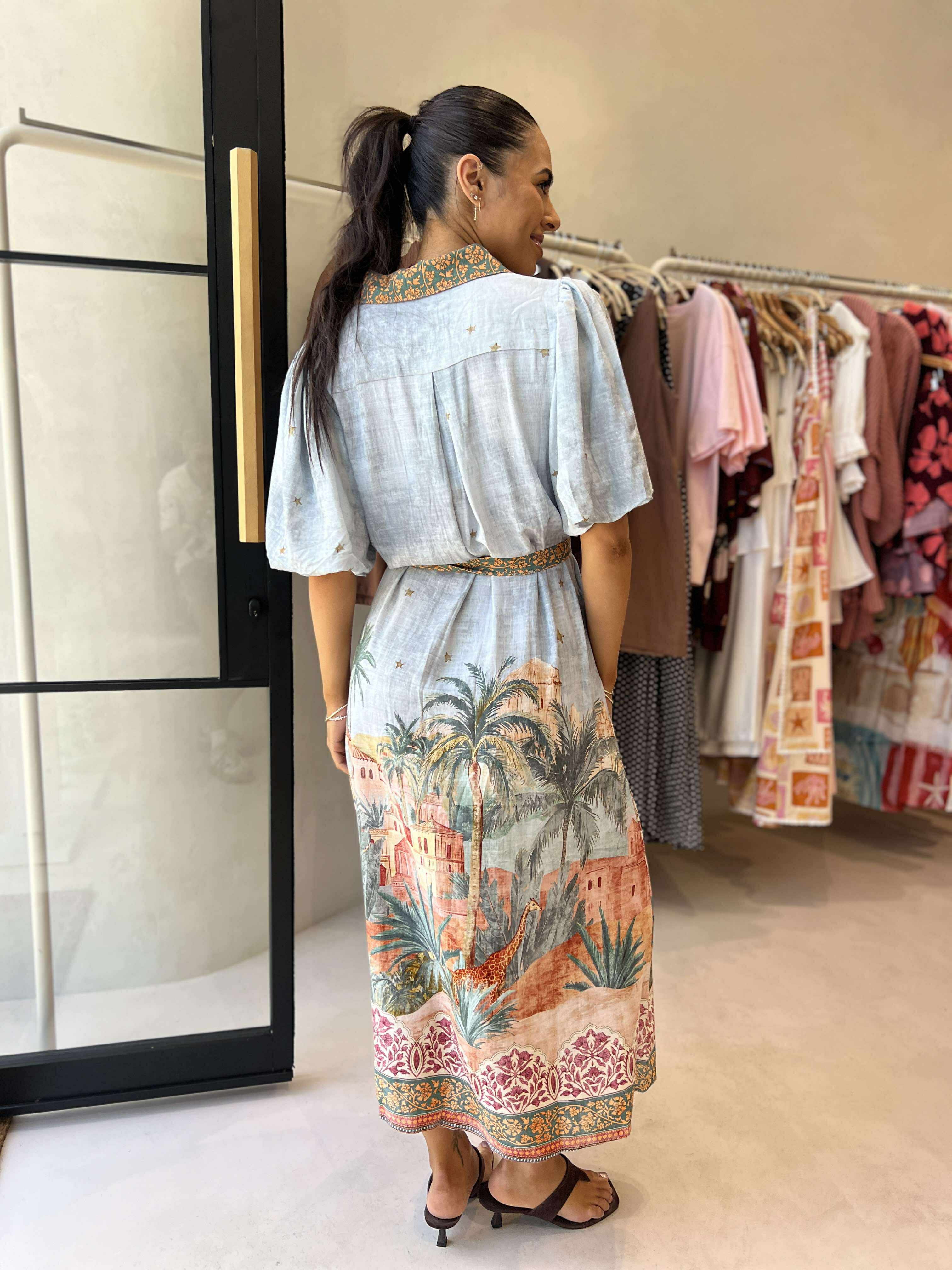 Chic and breezy, this maxi dress features eye-catching desert and palm graphics for a bold, effortless look. Designed with a classic collar, short balloon sleeves, button-up front, and a flattering waist tie, it also includes handy pockets and a flowing silhouette—perfect for warm, sun-filled days.