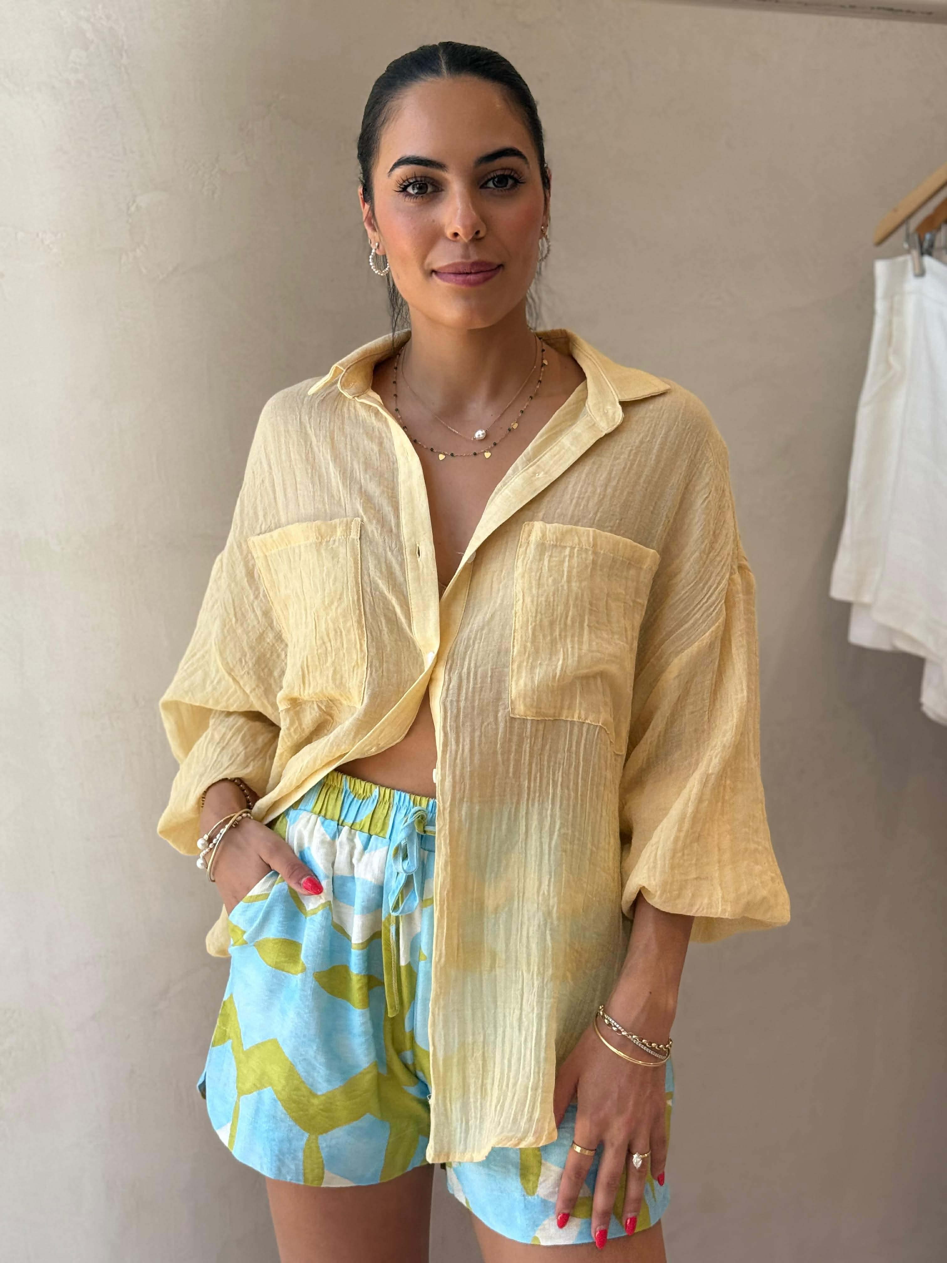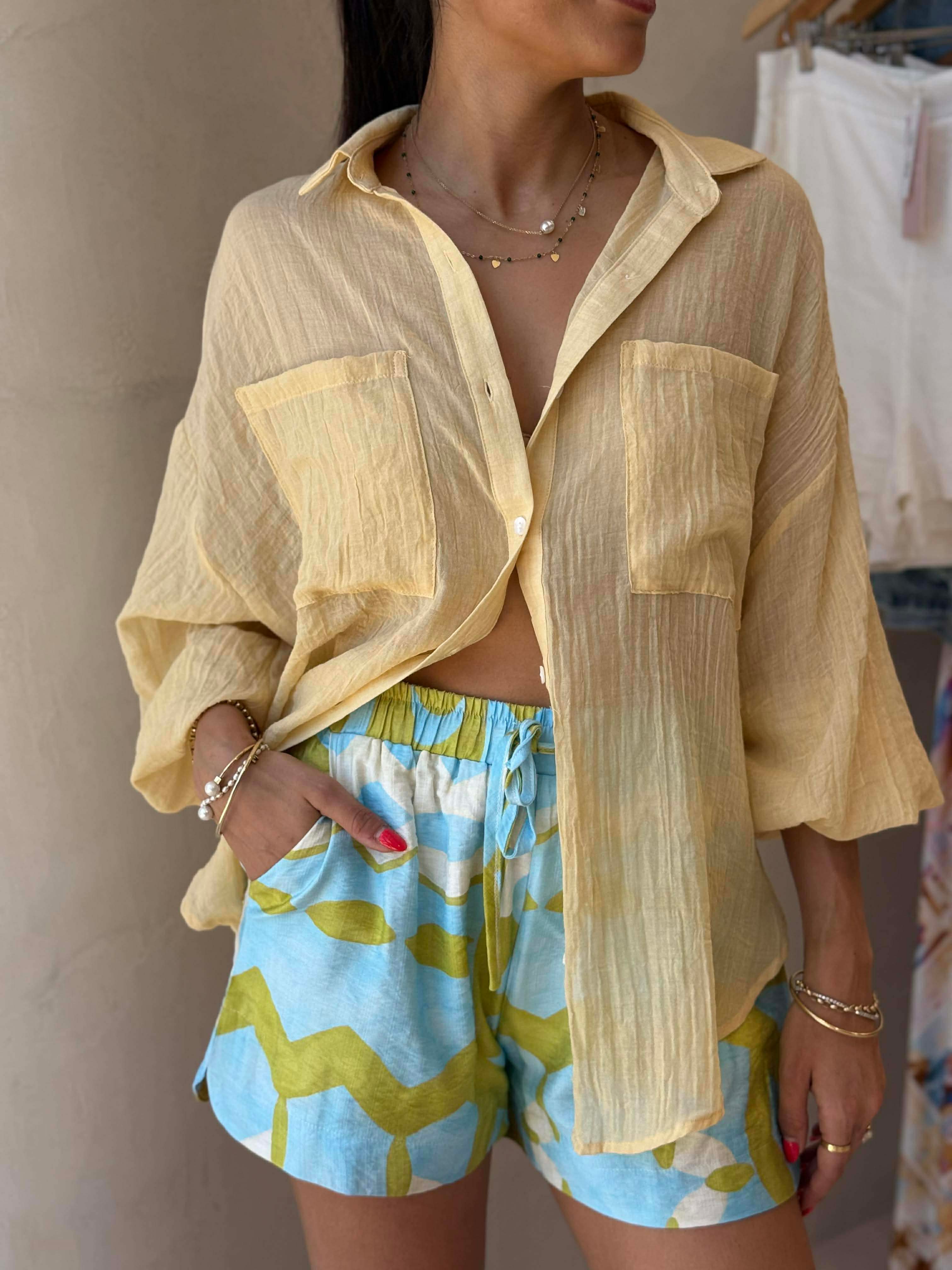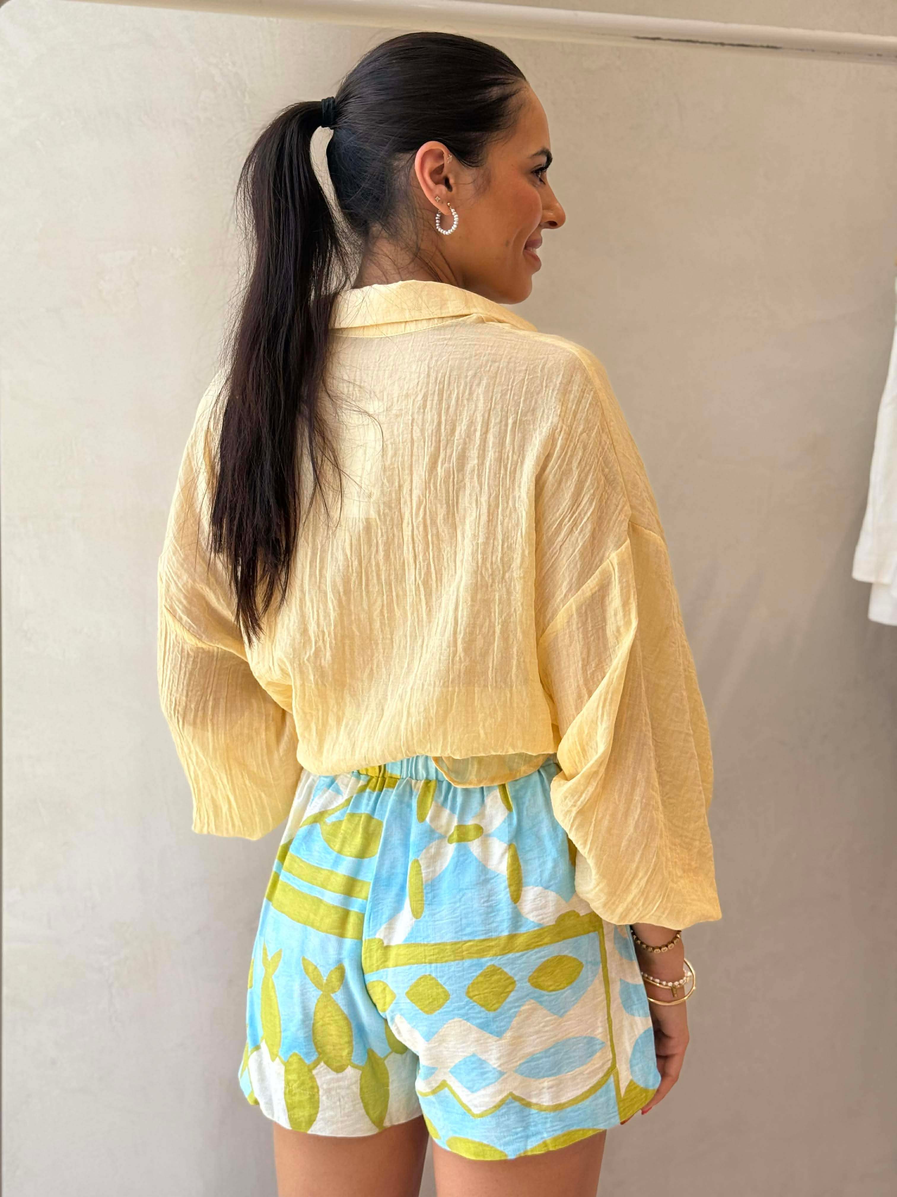 The Fish Print Shorts feature a relaxed fit, elasticised waistband with tie front, and the all-important side pockets….offering comfort and style in equal measure. The shorts are lined so sheer factor is not an issue. Pair the Fish Print Shorts with any of the new Spring Tanks, Ice Blue or Citrus.