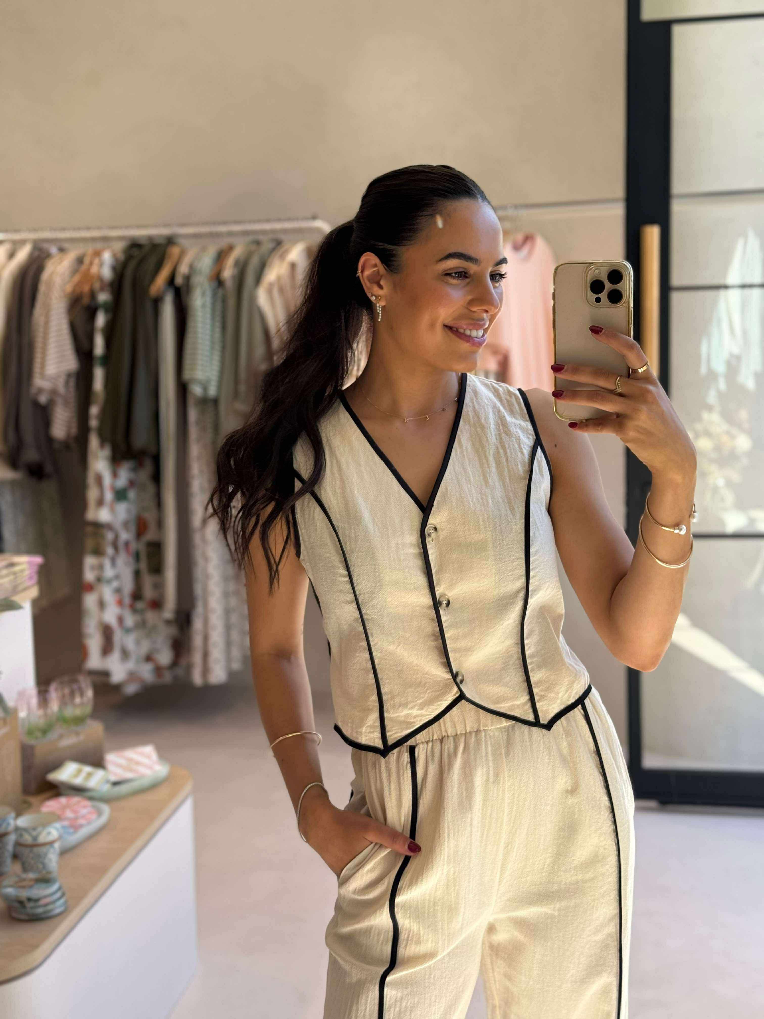 Effortlessly polished and endlessly versatile, the Frances Pant Set features a cream button-up vest with chic black trim and a flattering V-neckline, crafted from 100% cotton. Paired with matching cream pants in a relaxed fit, complete with an elasticated waistband for all-day comfort. A timeless set you’ll wear on repeat.