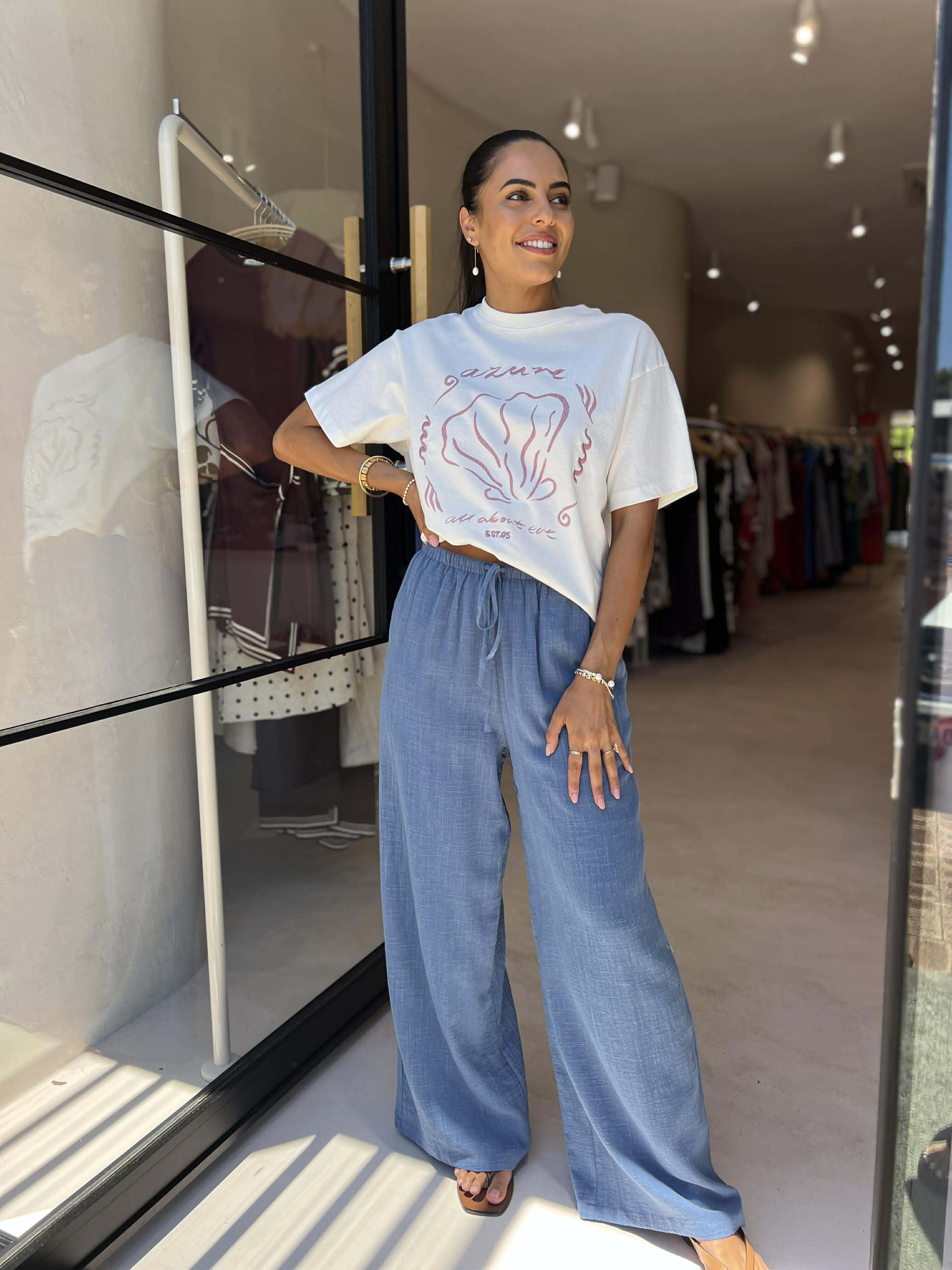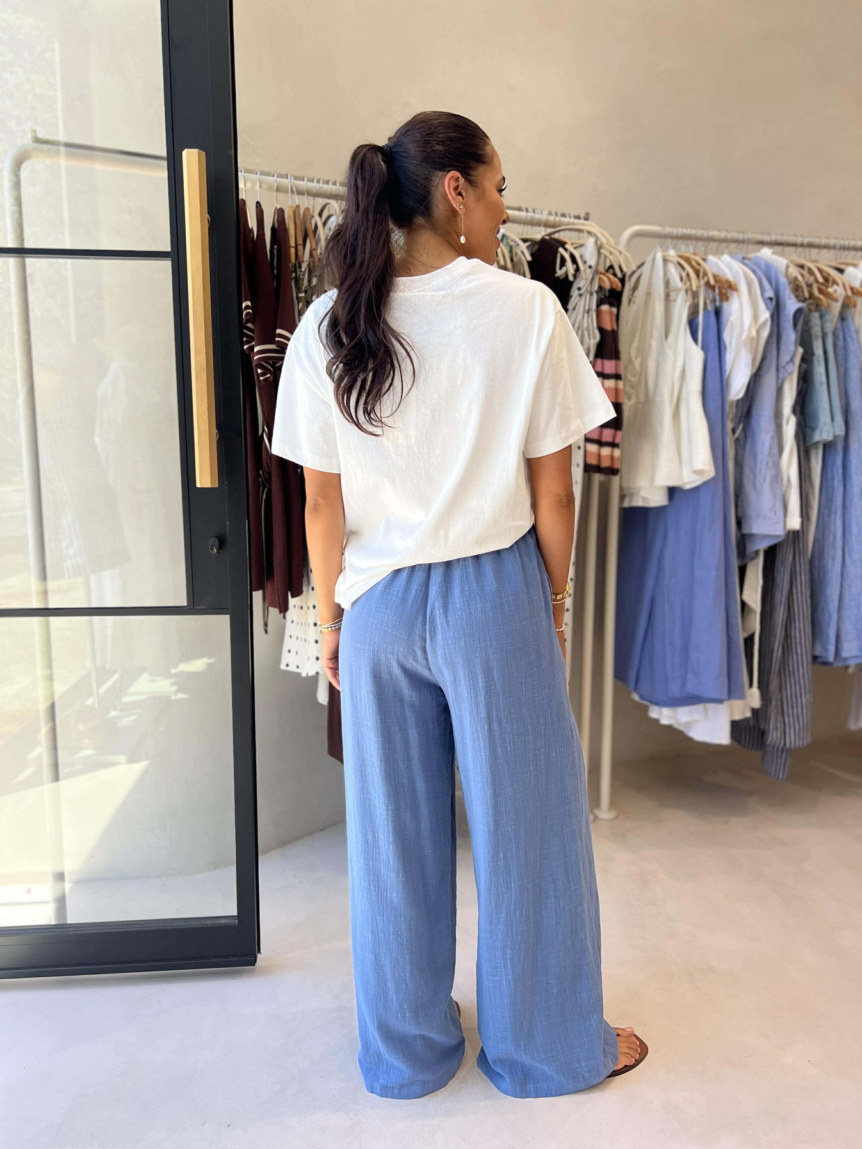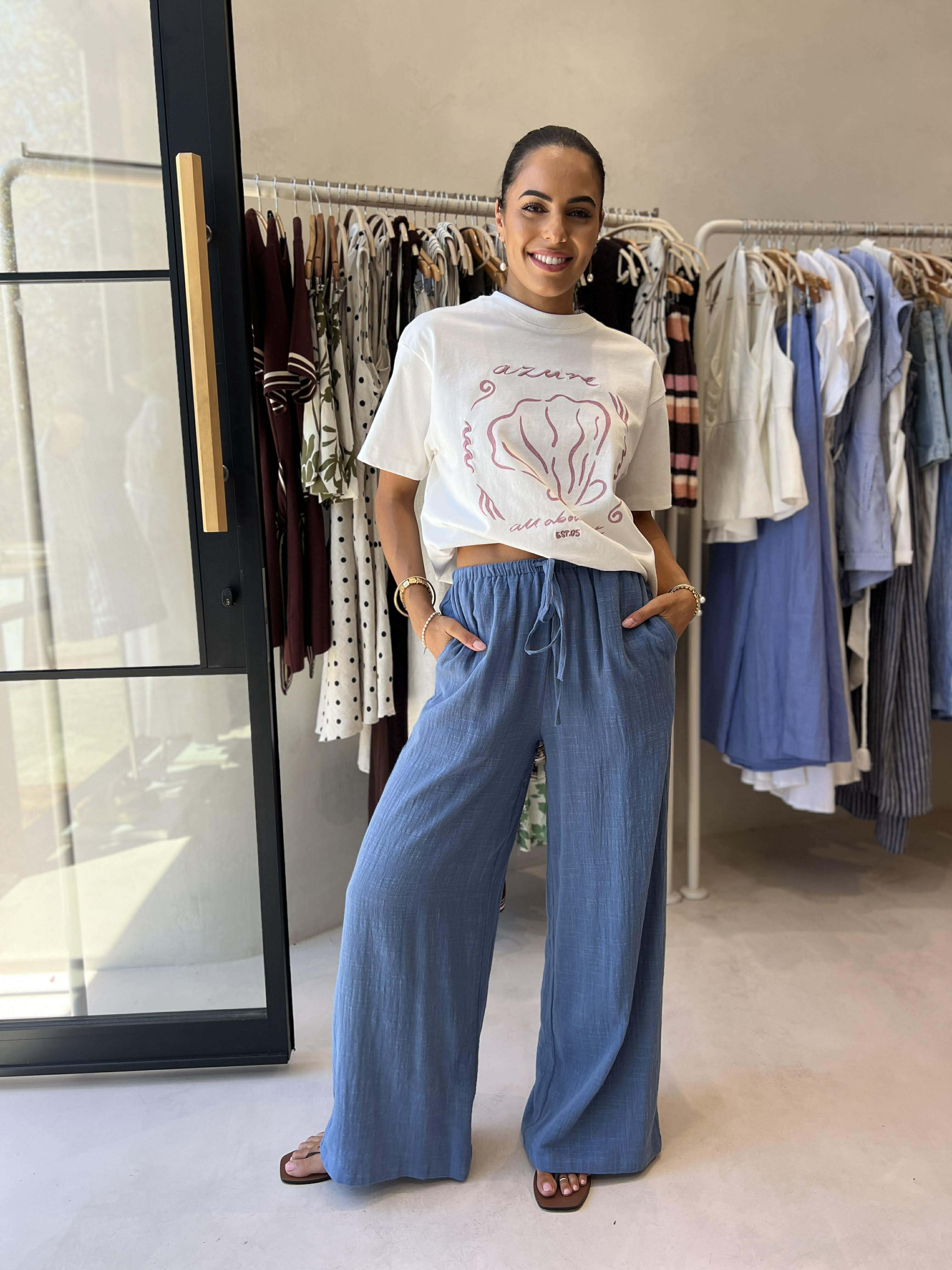 Exclusive to Frankii Clothing, these relaxed-fit Ezra Blu pants in blue are perfect for an elevated, easy summer look. Designed with a comfortable elasticated waist and adjustable drawstring, plus handy pockets. Lined and lightweight – perfect for warm, sunny days.