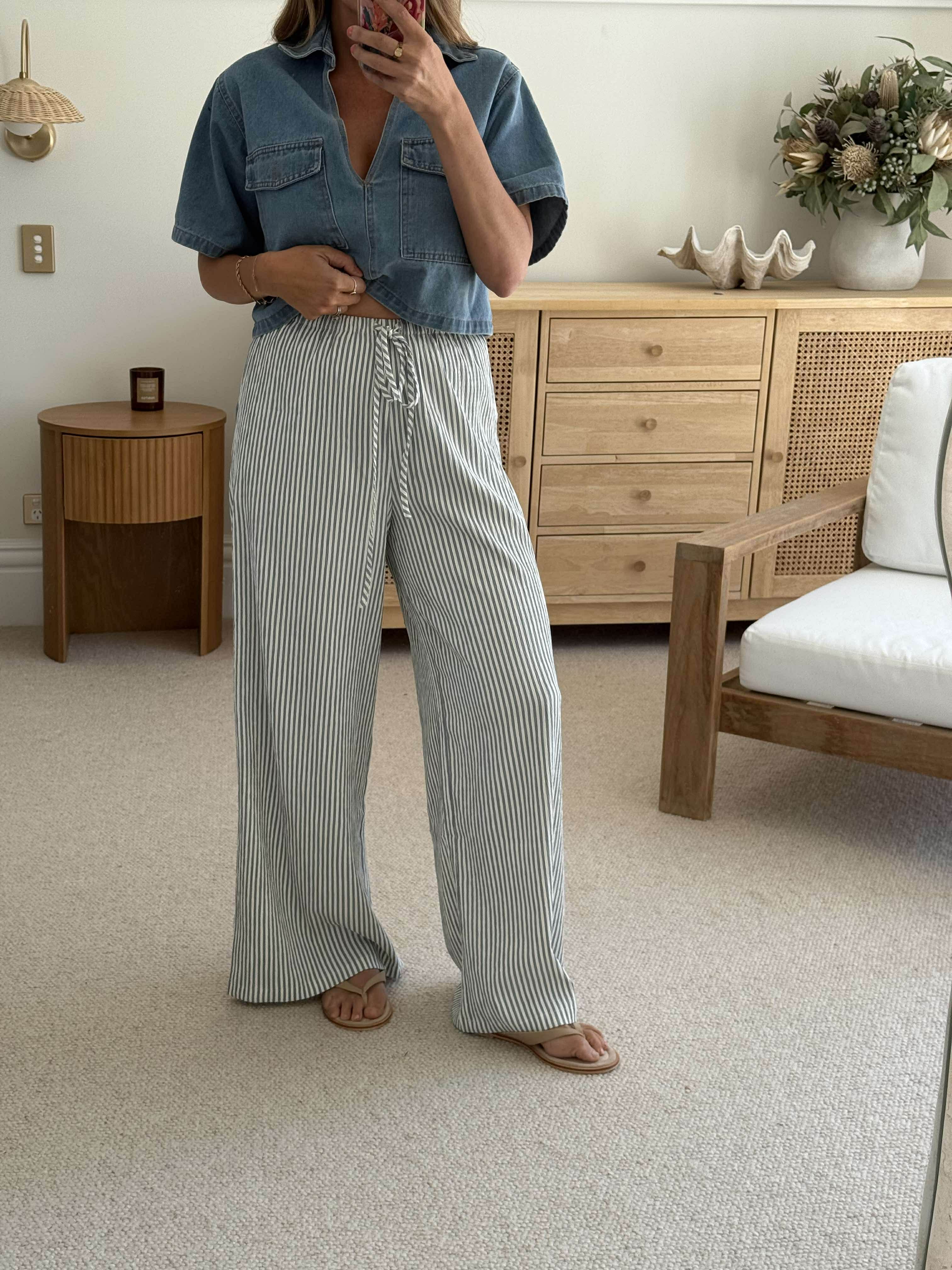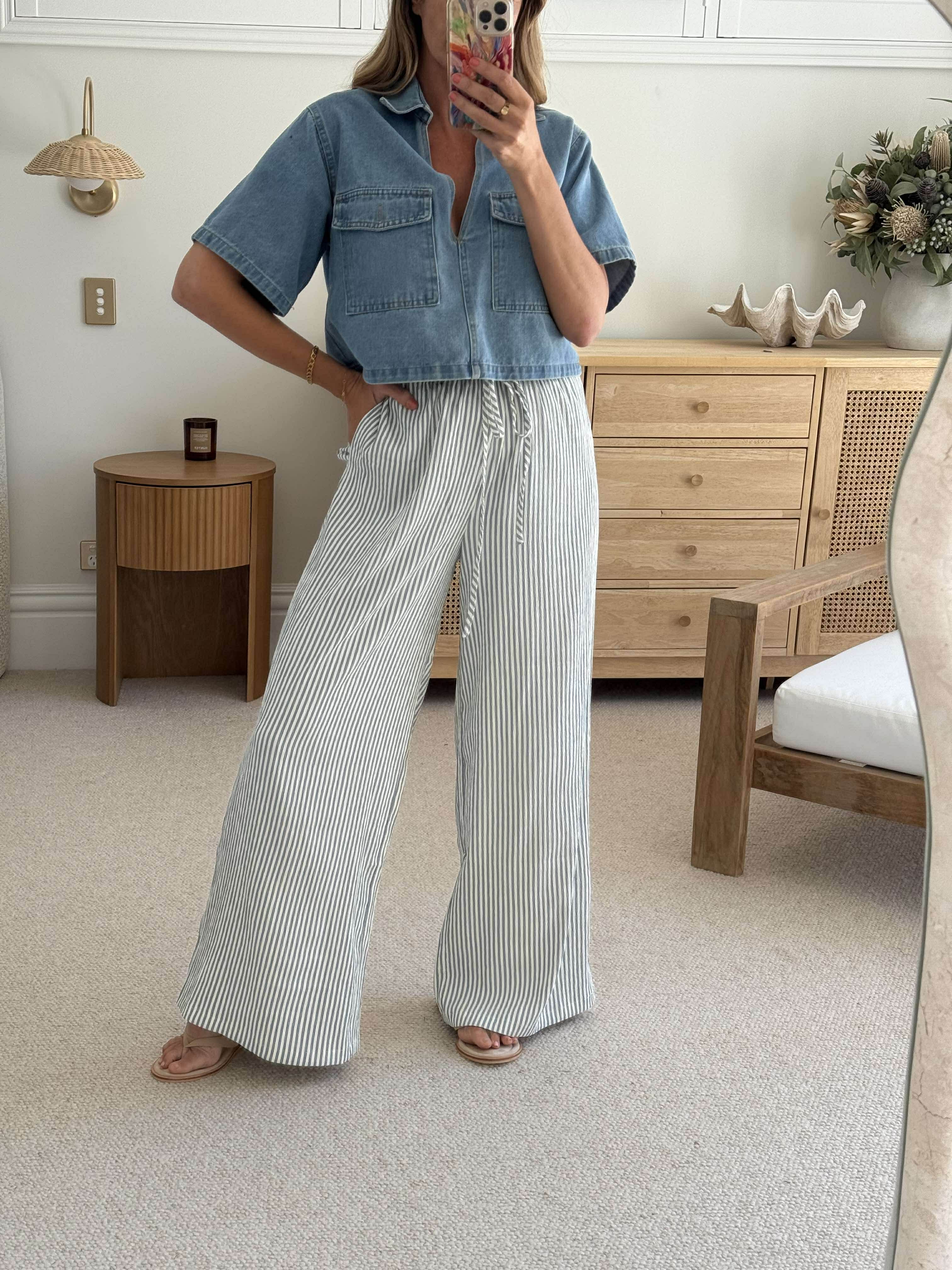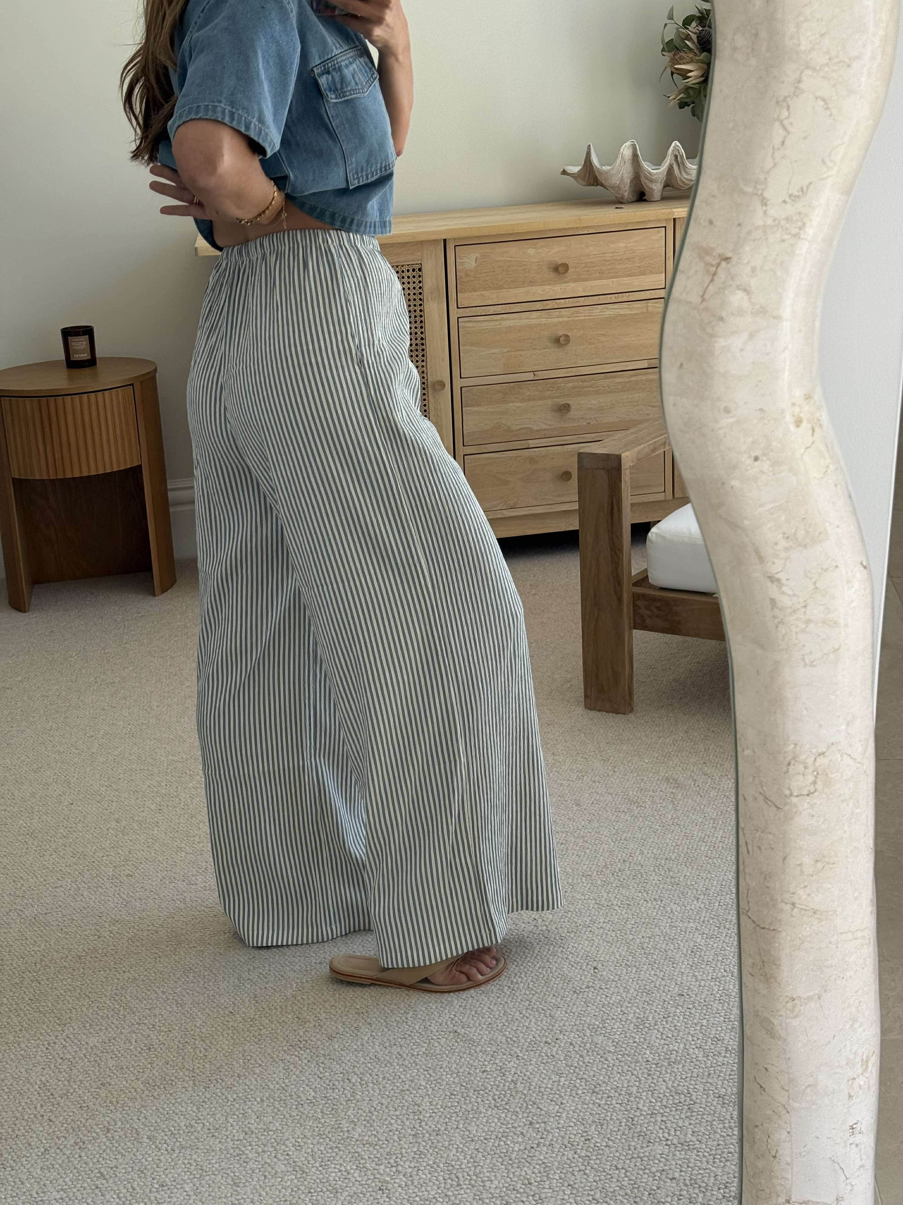 Exclusive to Frankii Clothing, these relaxed-fit Ezra Blu pants feature a lovely cream and soft blue vertical stripe for an easy, laid-back look. Designed with a comfortable elasticated waist and adjustable drawstring, plus handy pockets. Unlined and lightweight – perfect for warm, sunny days.