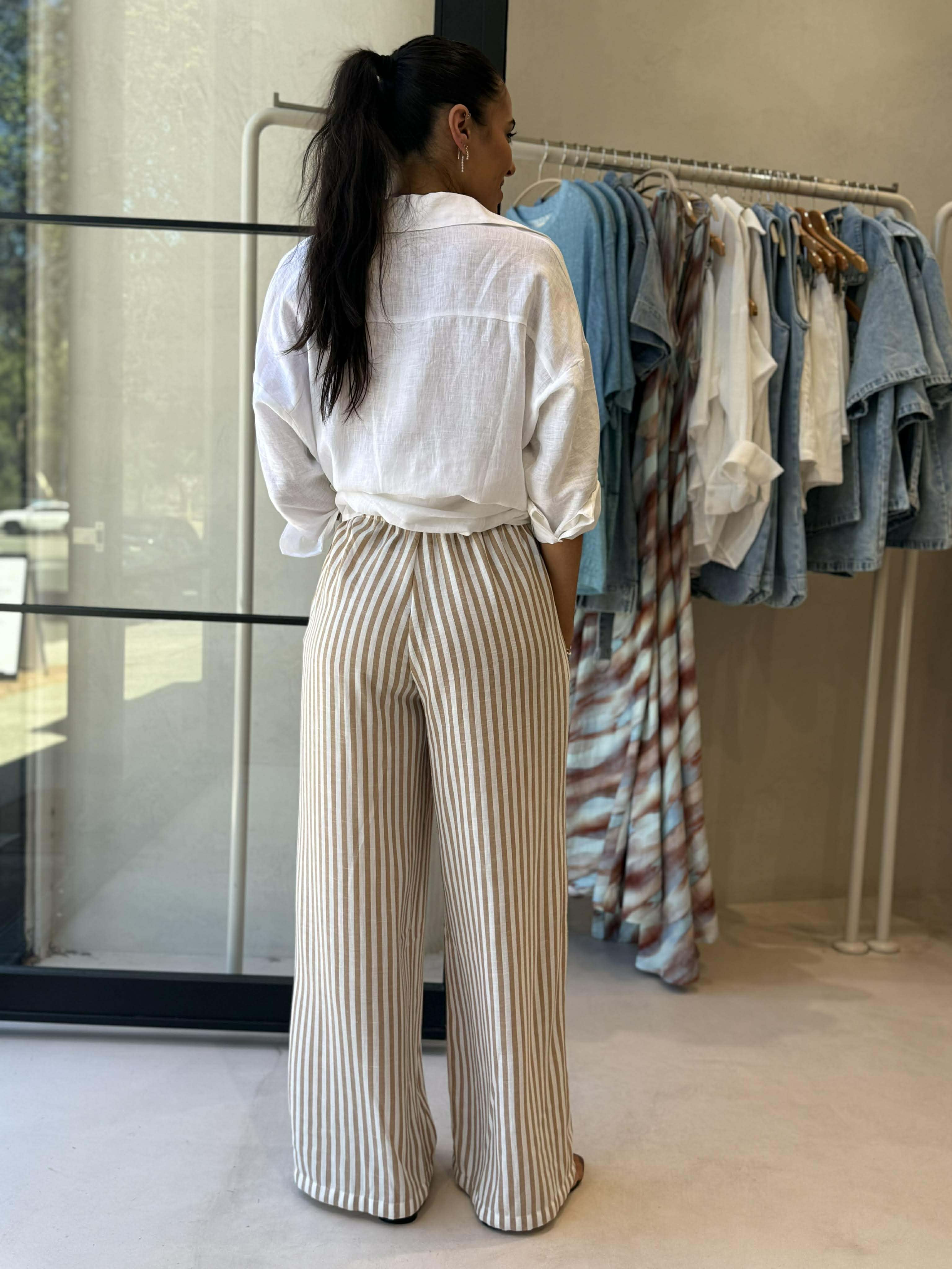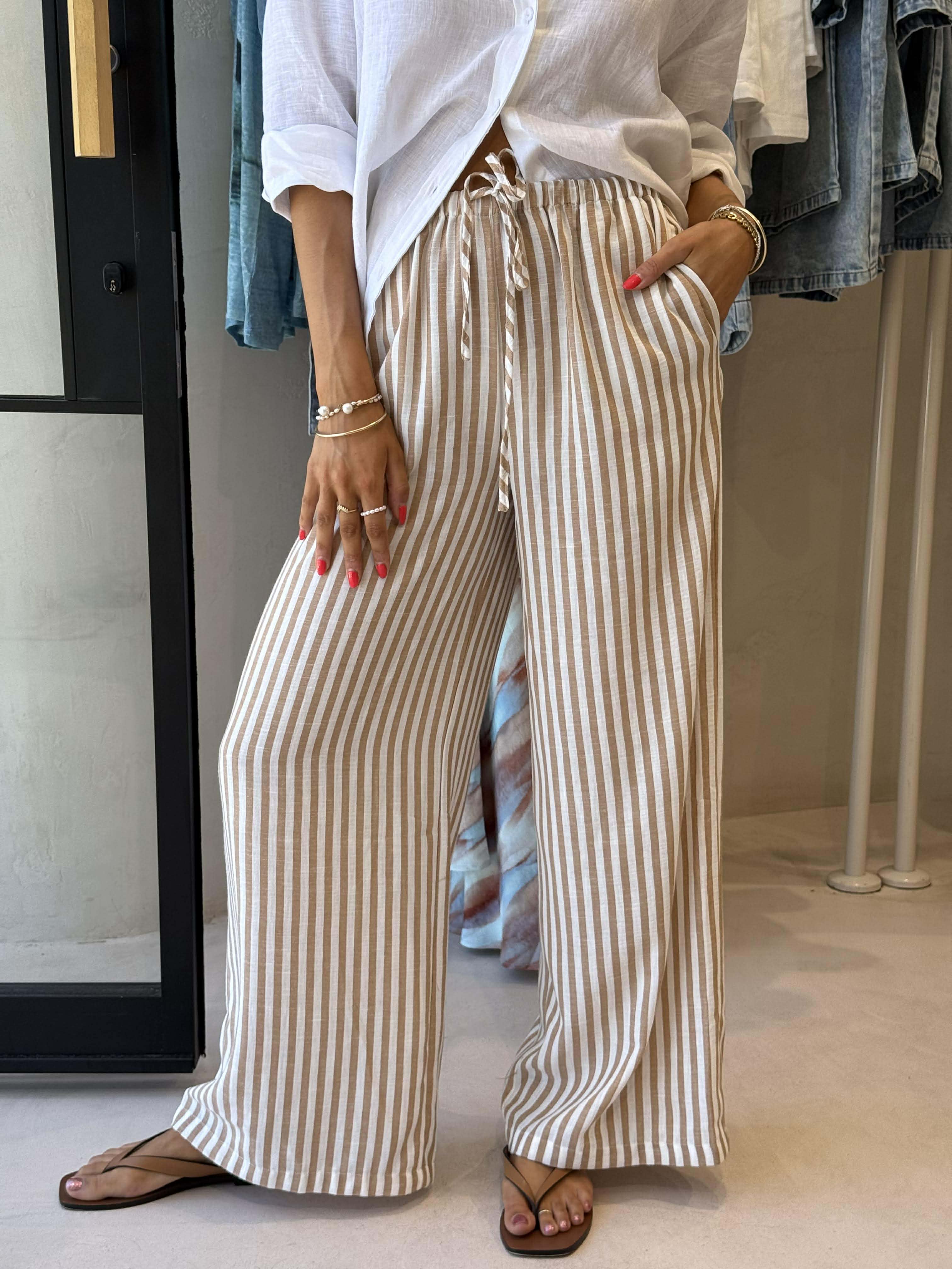 Exclusive to Frankii Clothing, these relaxed-fit Ezra Blu pants in Vanilla stripe are perfect for an elevated, easy summer look. Designed with a comfortable elasticated waist and adjustable drawstring, plus handy pockets. Lightweight and perfect for warm, sunny days.