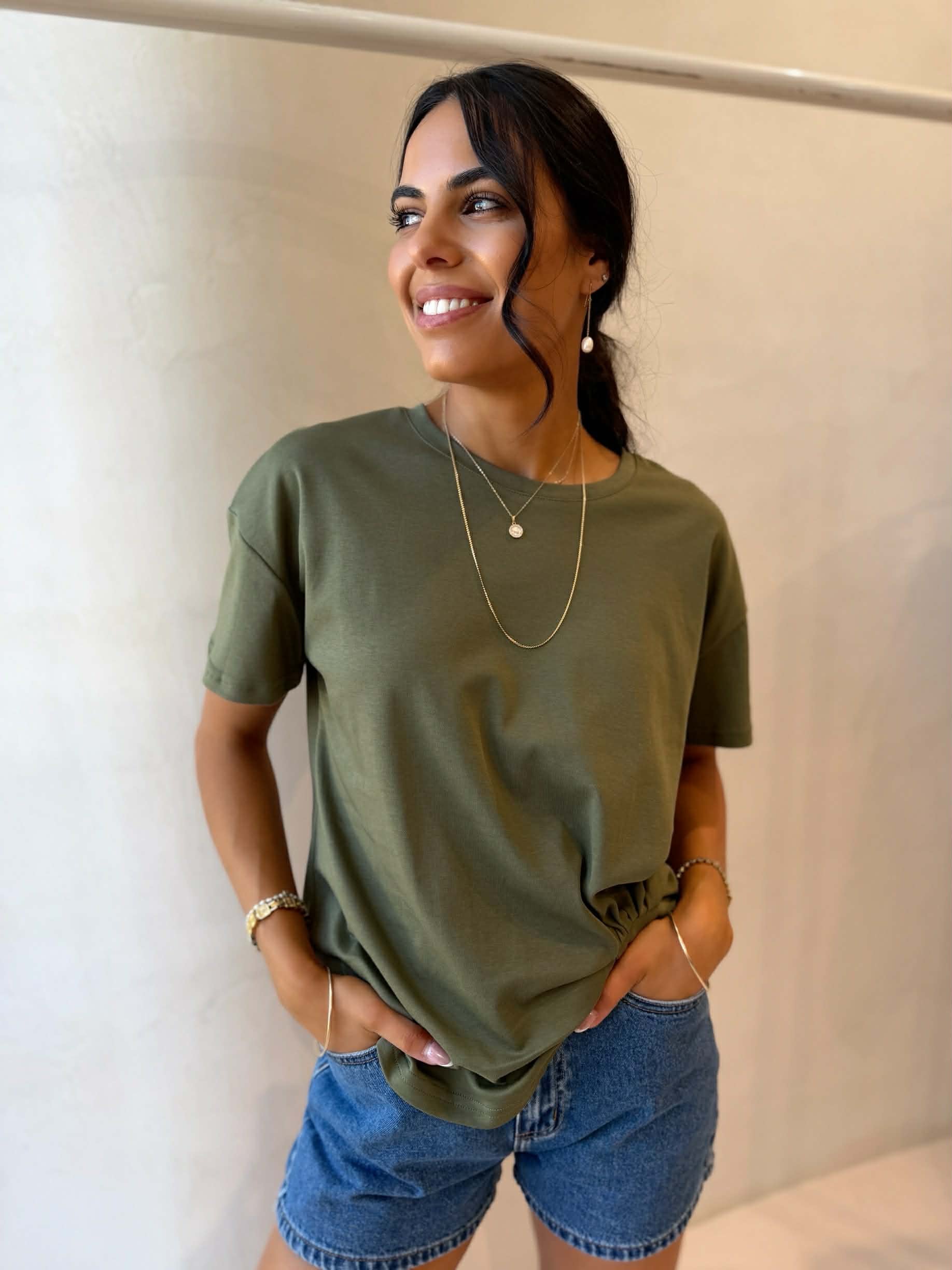 The Lexi T-Shirt features a classic crew neckline, short sleeves, and a stylish tie detail at the bottom left. Made from a soft Cotton/Elastane blend for everyday comfort and stretch. Model wears size 8.