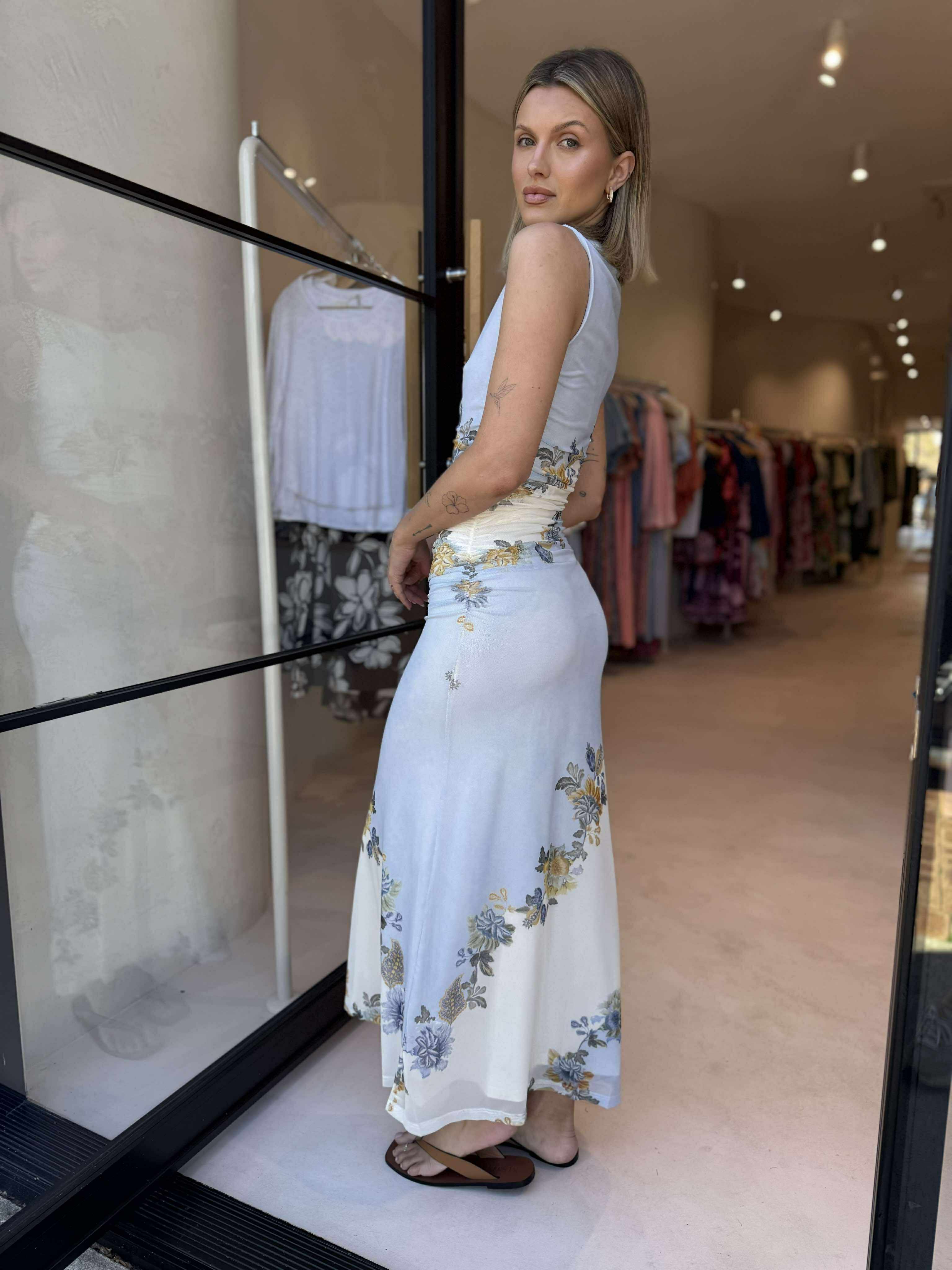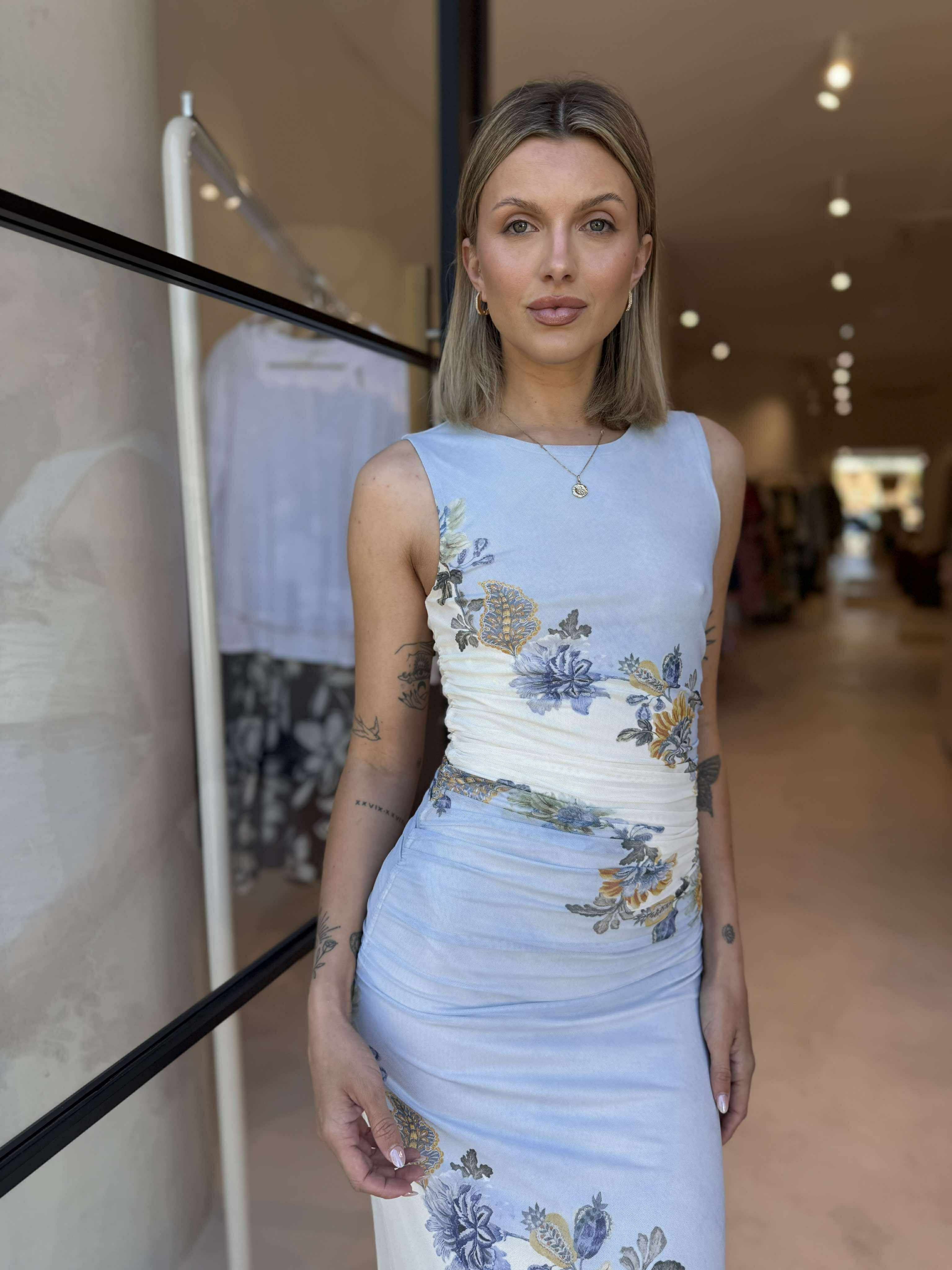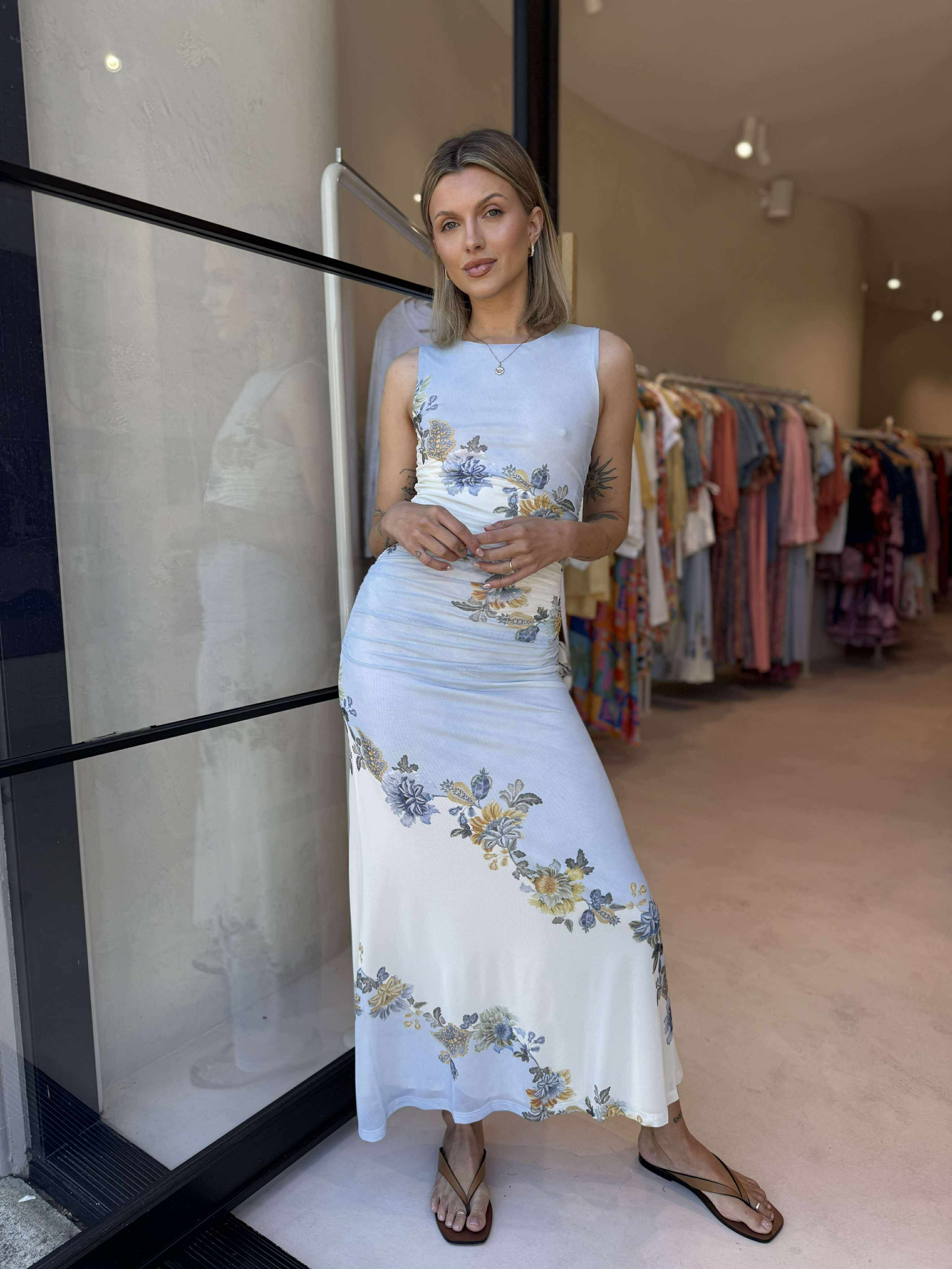 The Lucia Blue & Cream Floral Mesh Maxi Dress is a romantic, figure-skimming style that flows effortlessly from day to night. Crafted from soft stretch mesh, it features a dreamy watercolour blue and cream base with delicate floral accents in golden yellow and cornflower blue. The sleeveless design and subtle ruching enhance the silhouette, while the fully lined finish ensures comfort and coverage.