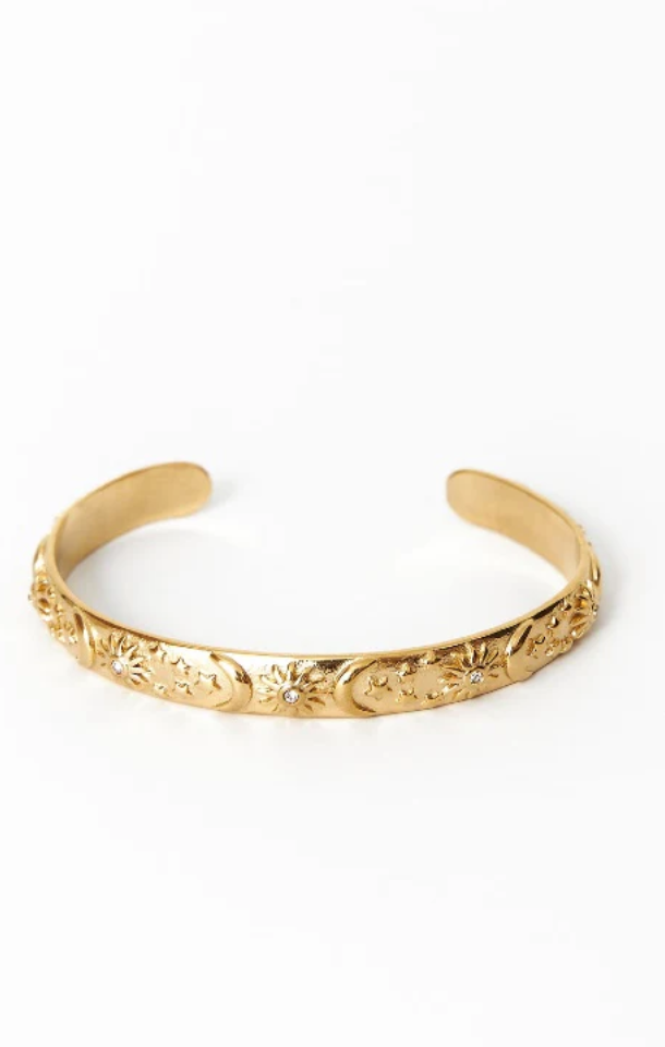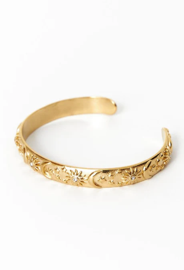 Add a touch of celestial style with our Luna Cuff Bracelet in gold. This unique piece features a delicate star and moon design, perfect for adding a touch of magic to any outfit. With its cuff style, it is both versatile and easy to wear.