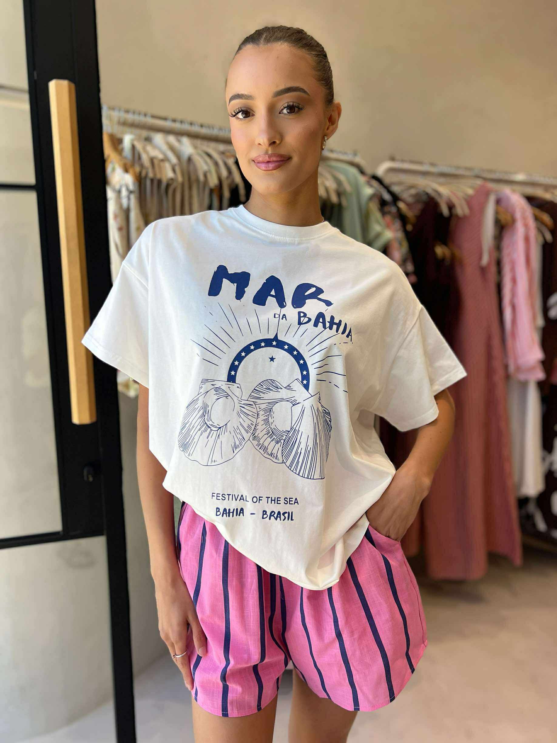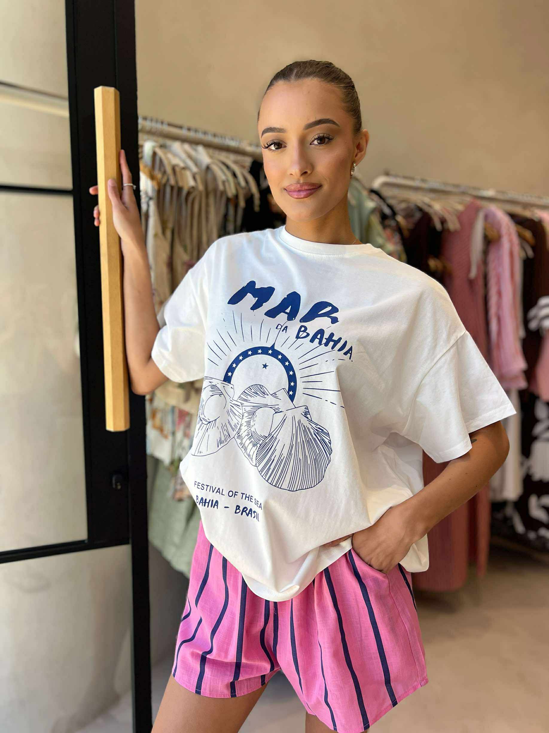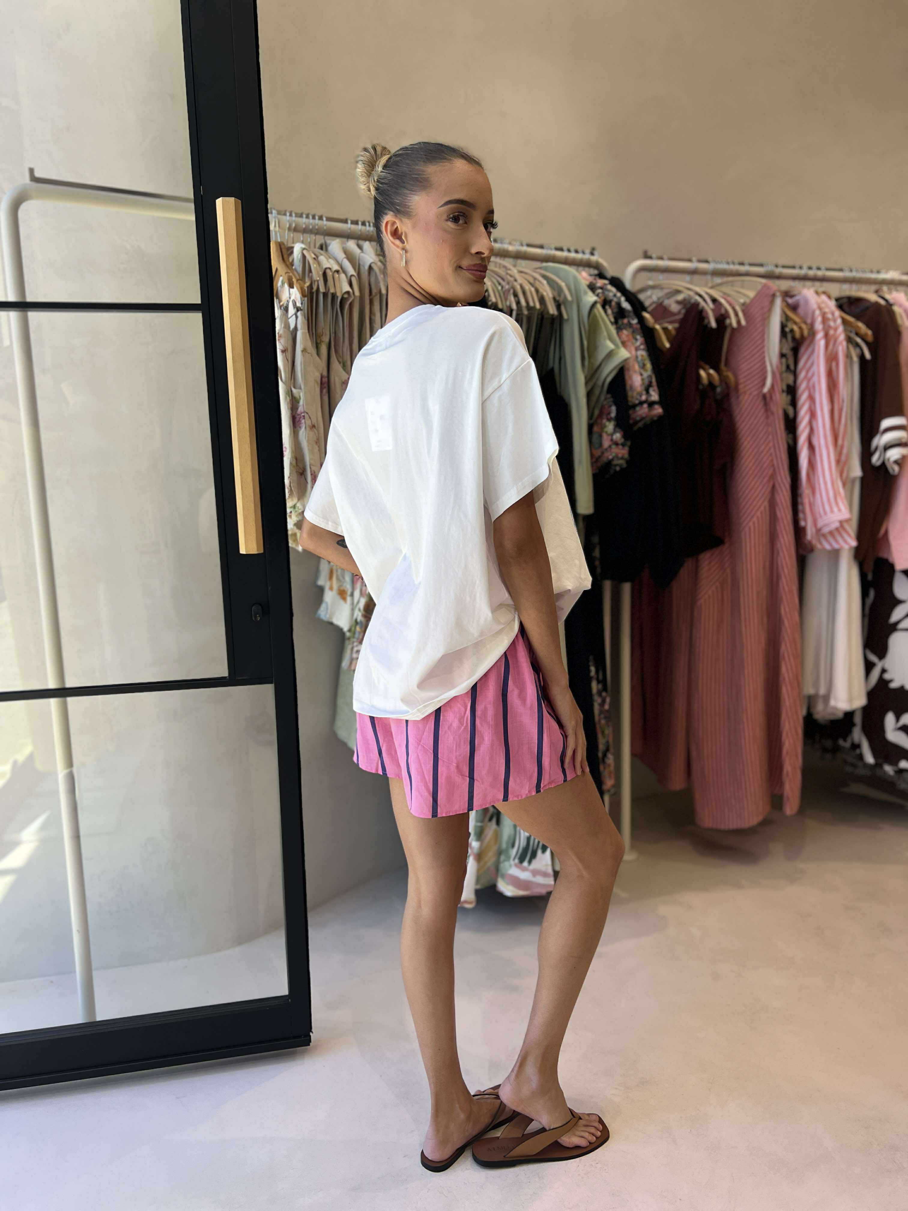 Stand out in bold colour with this effortlessly cool short and shirt set. The bright pink shorts feature deep blue stripes, an elasticated waist, and pockets for easy everyday wear. Paired with a relaxed-fit white shirt finished with a blue graphic on the front — this set brings a fresh, laid-back vibe to your off-duty look.