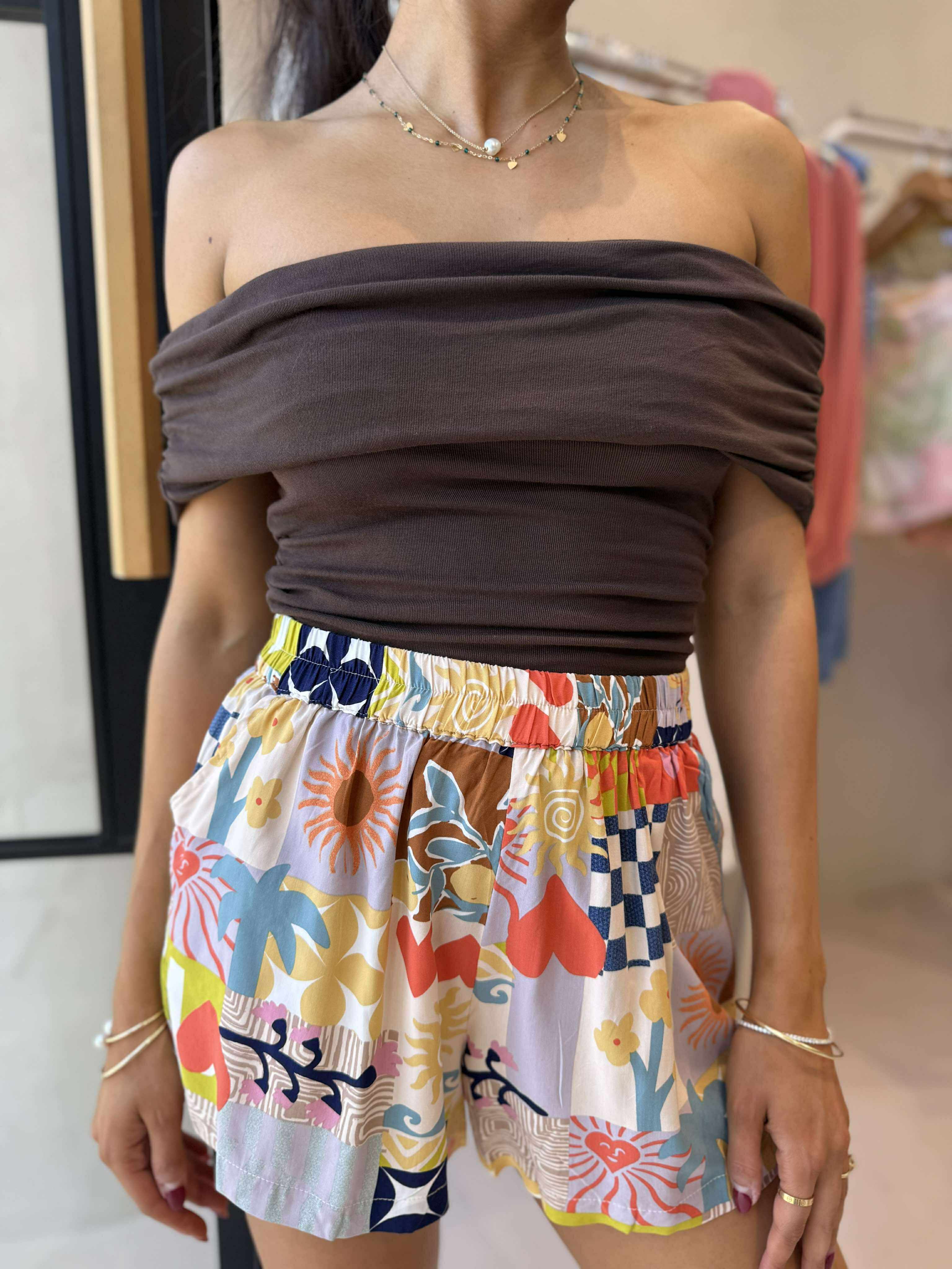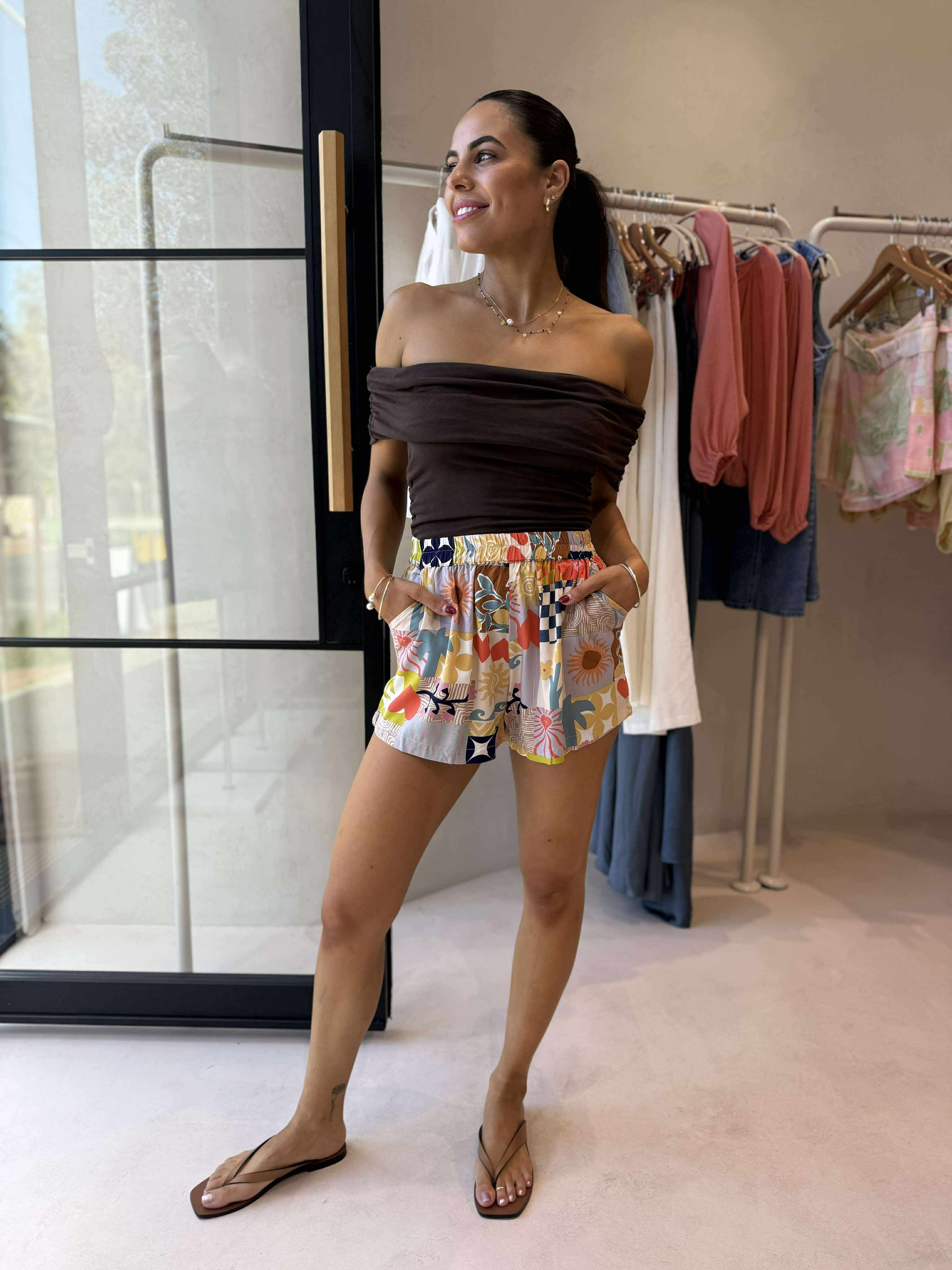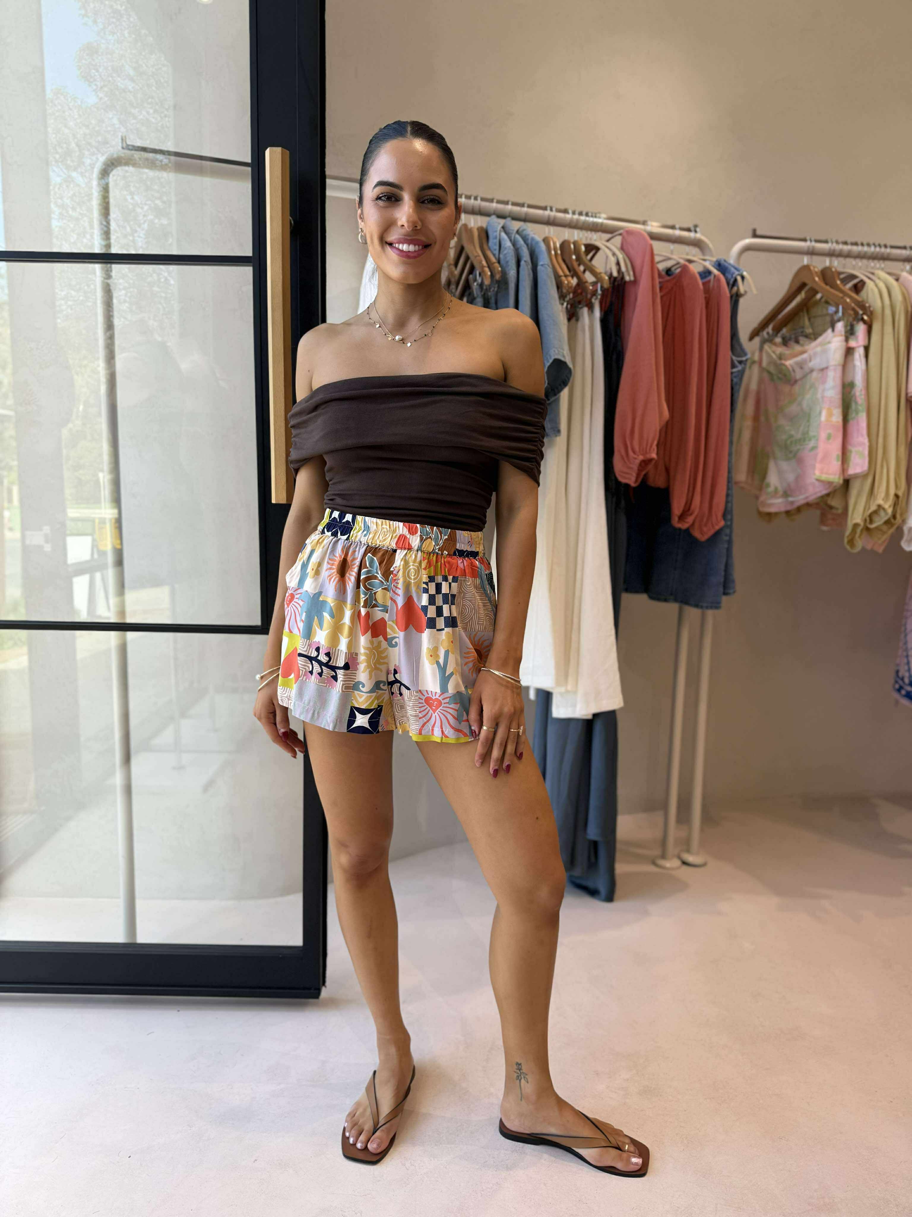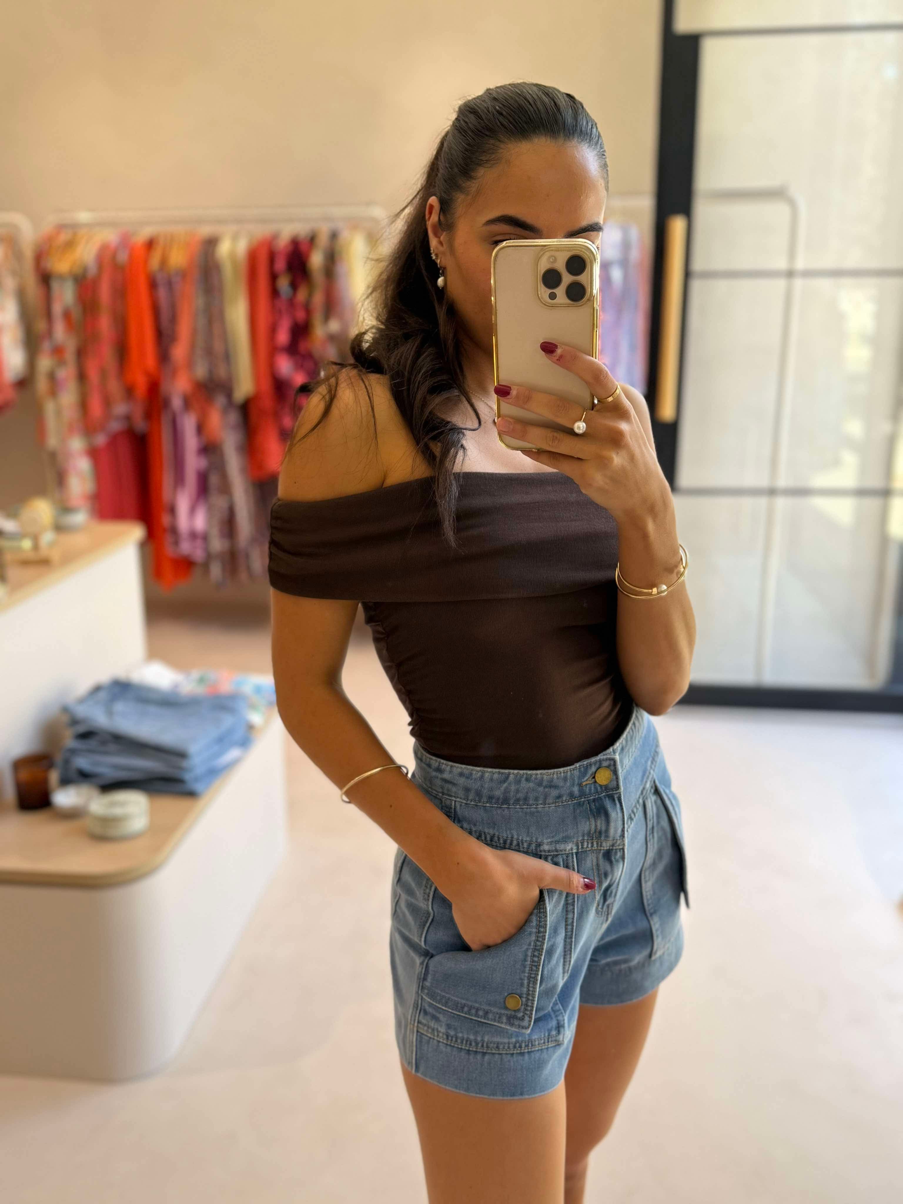 The Maddie Knit Top is all about soft sophistication, featuring a fold-over off-shoulder neckline in a rich brown knit. Ruched sides create a flattering, form-fitting shape that moves with you. Pair it with tailored trousers or a sleek midi for an elevated take on spring layering.