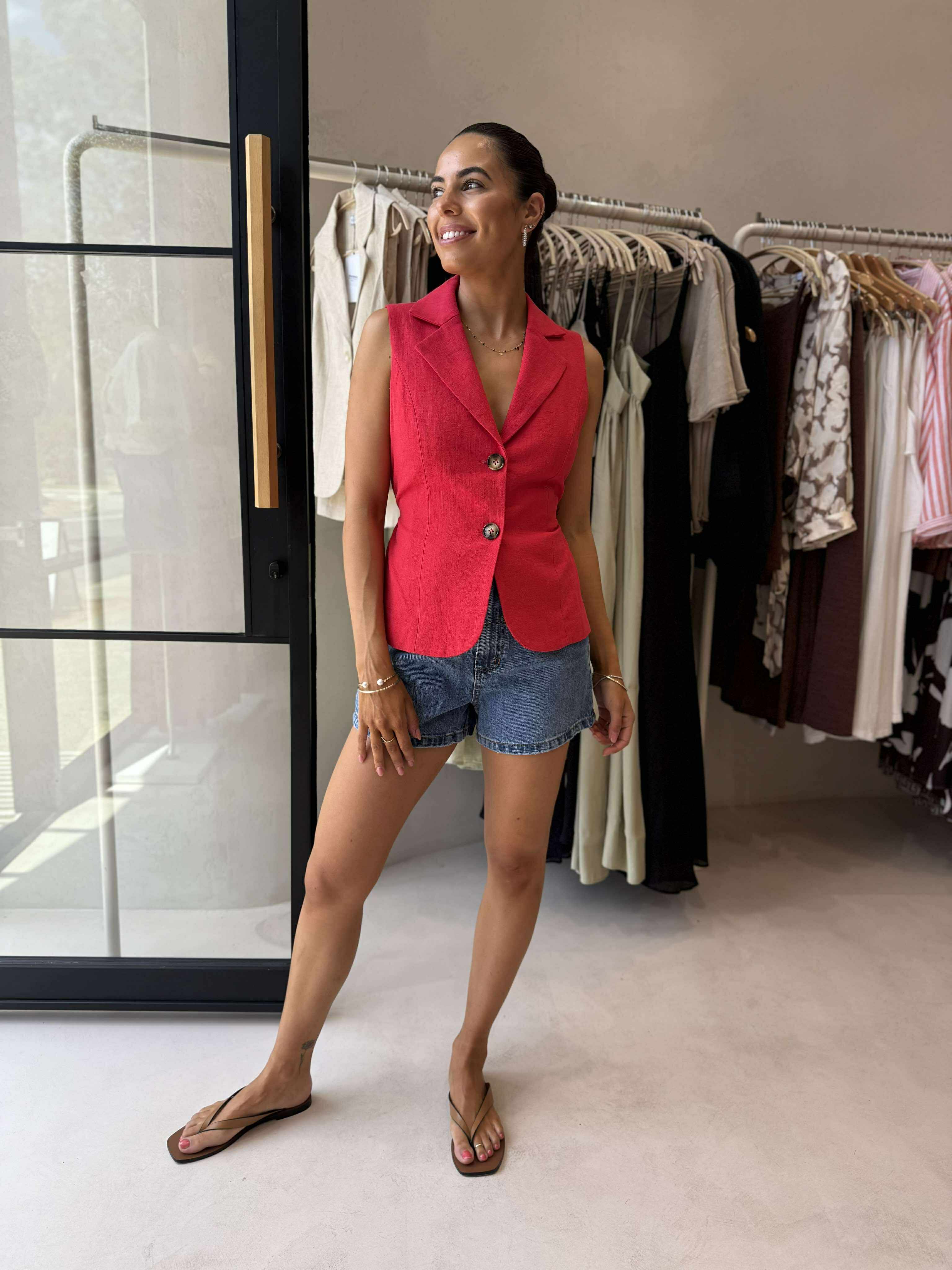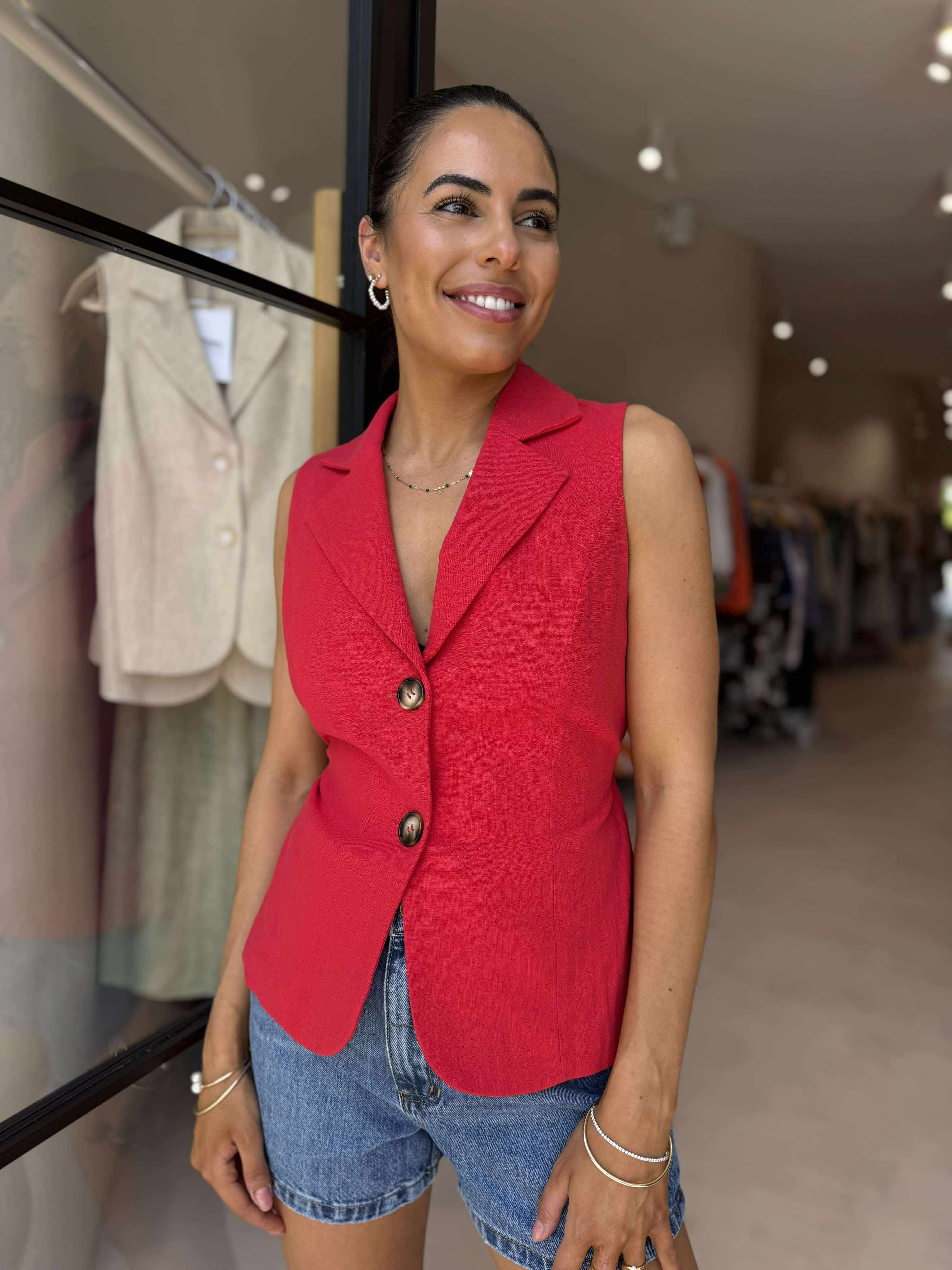 A bold wardrobe staple, this red vest features a classic collar, button-front closure, and a flattering v-neckline. The adjustable drawstring at the back allows you to cinch the waist for the perfect fit. Easy to dress up or down – style it solo or layered for a chic, tailored look.