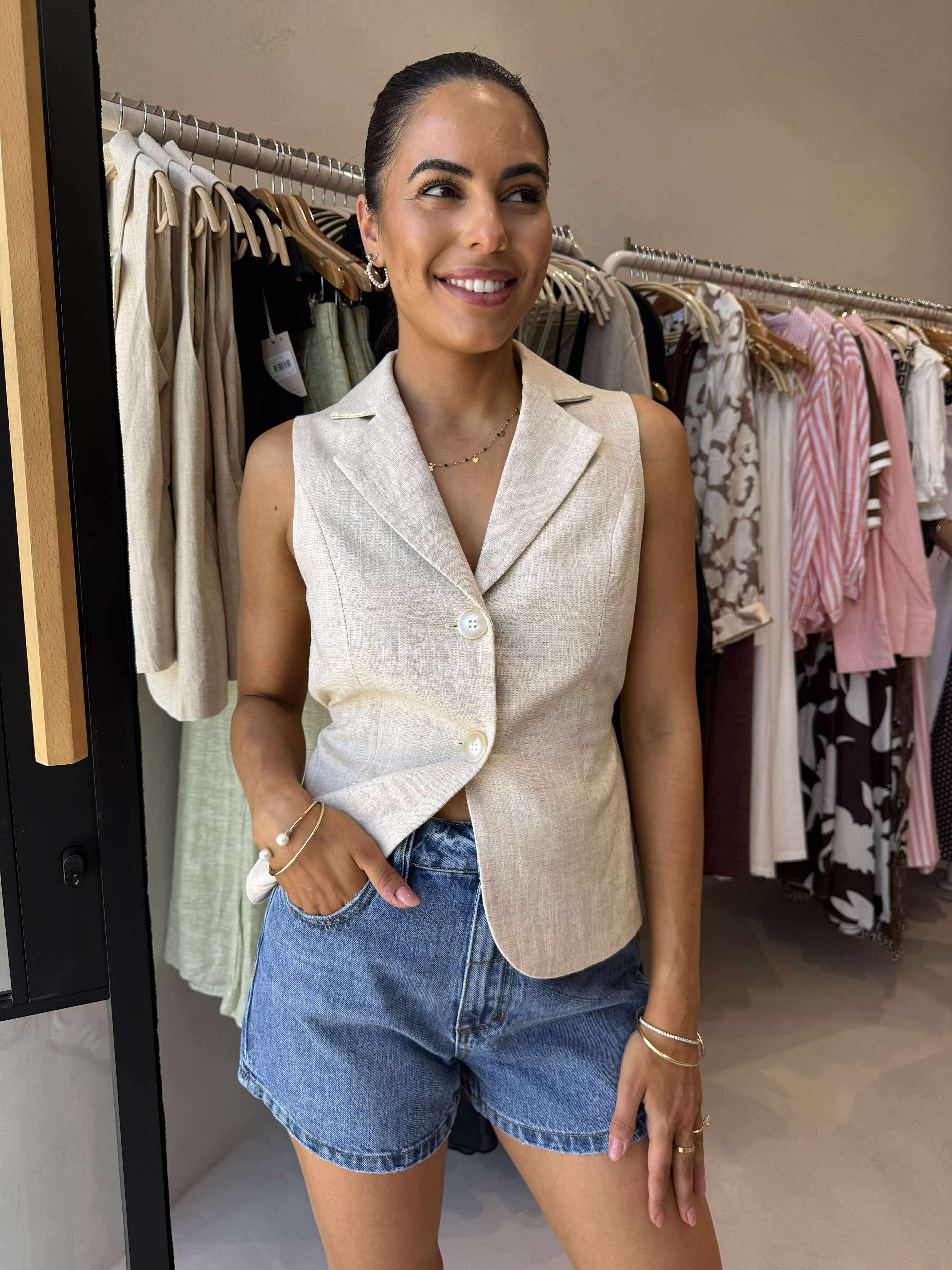 A perfect wardrobe staple, this oat coloured vest features a classic collar, button-front closure, and a flattering v-neckline. The adjustable drawstring at the back allows you to cinch the waist for the perfect fit. Easy to dress up or down – style it solo or layered for a chic, tailored look.