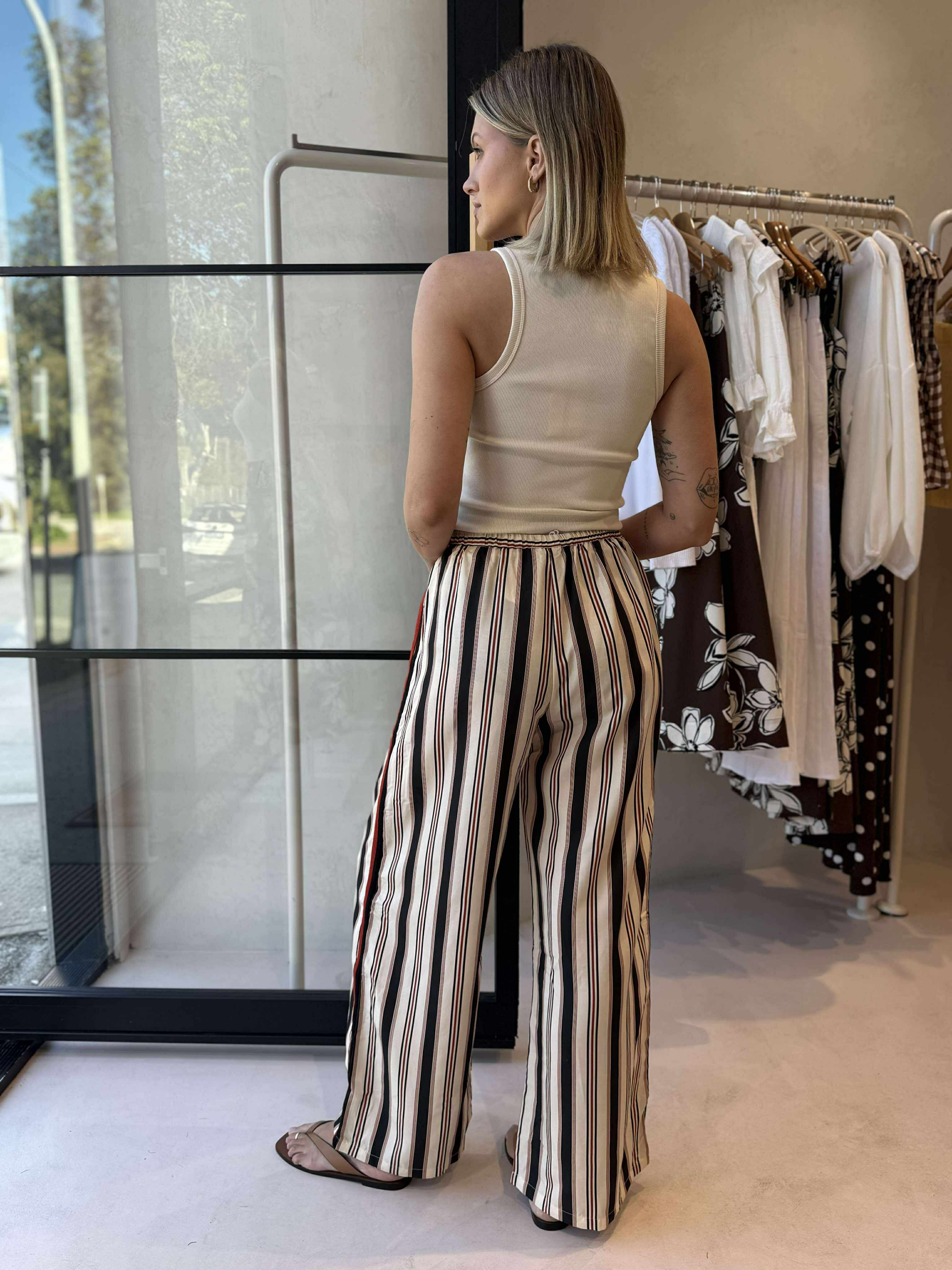 These relaxed-fit pants feature a black and red stripe design, an elasticated waistband with tie, and handy pockets. Light and comfortable — perfect for everyday wear.