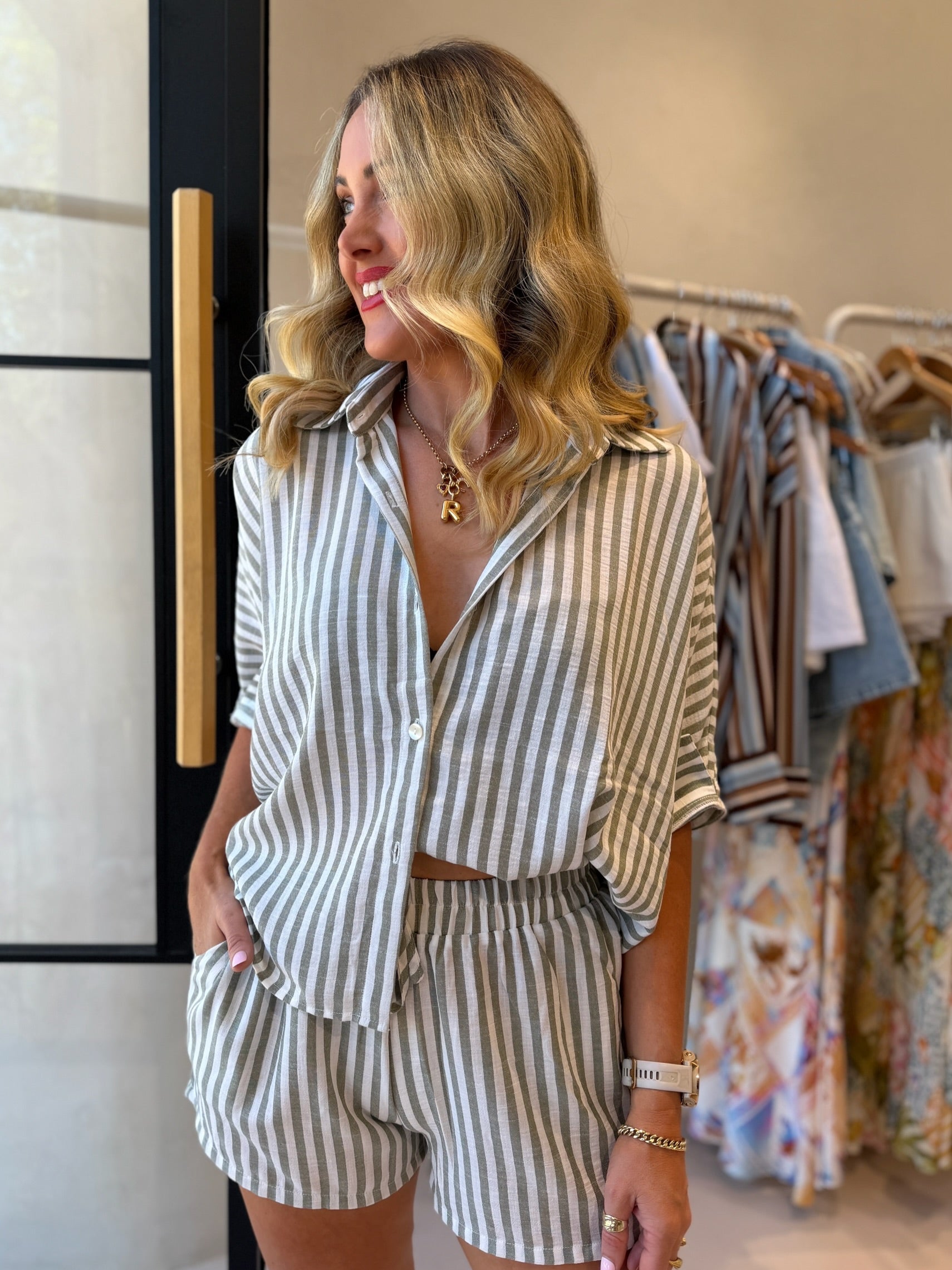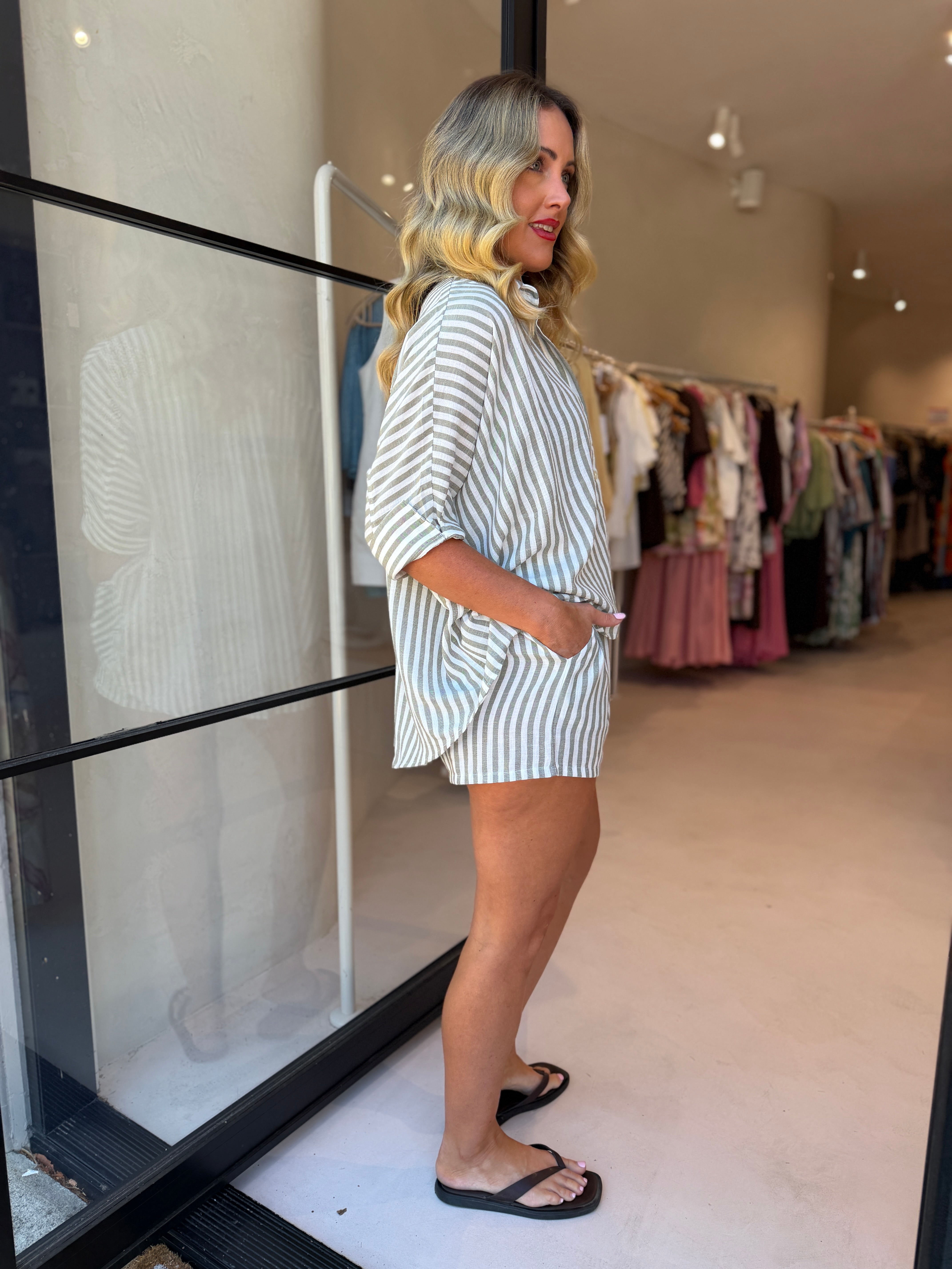 OMA SHORT SET - SAGE STRIPE