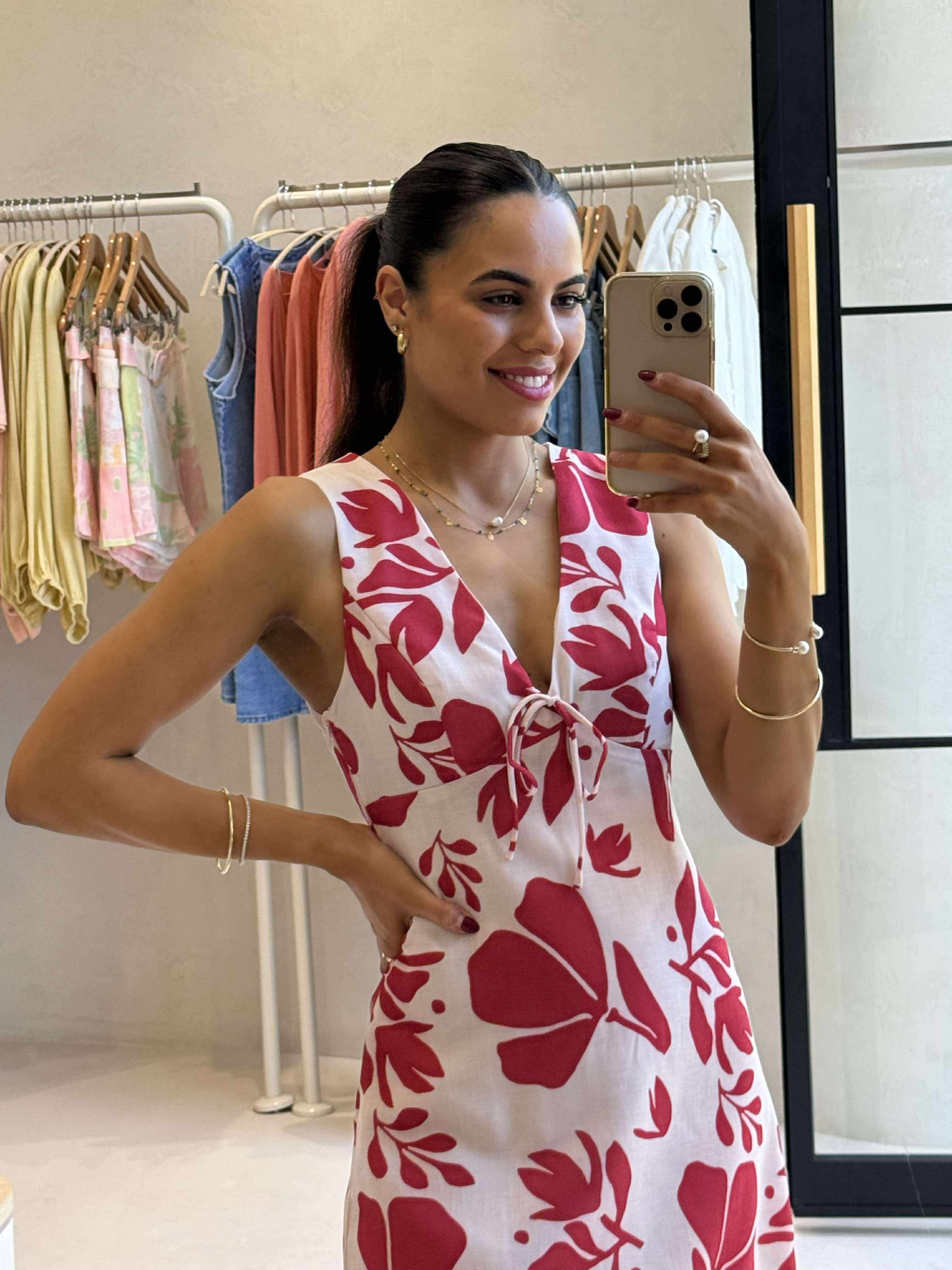 This pink floral mini dress features a flattering V-neck, tie detail on the bust, and thick straps for added support. Invisible zip down side and fully lined for comfort. Perfect for sunny days.