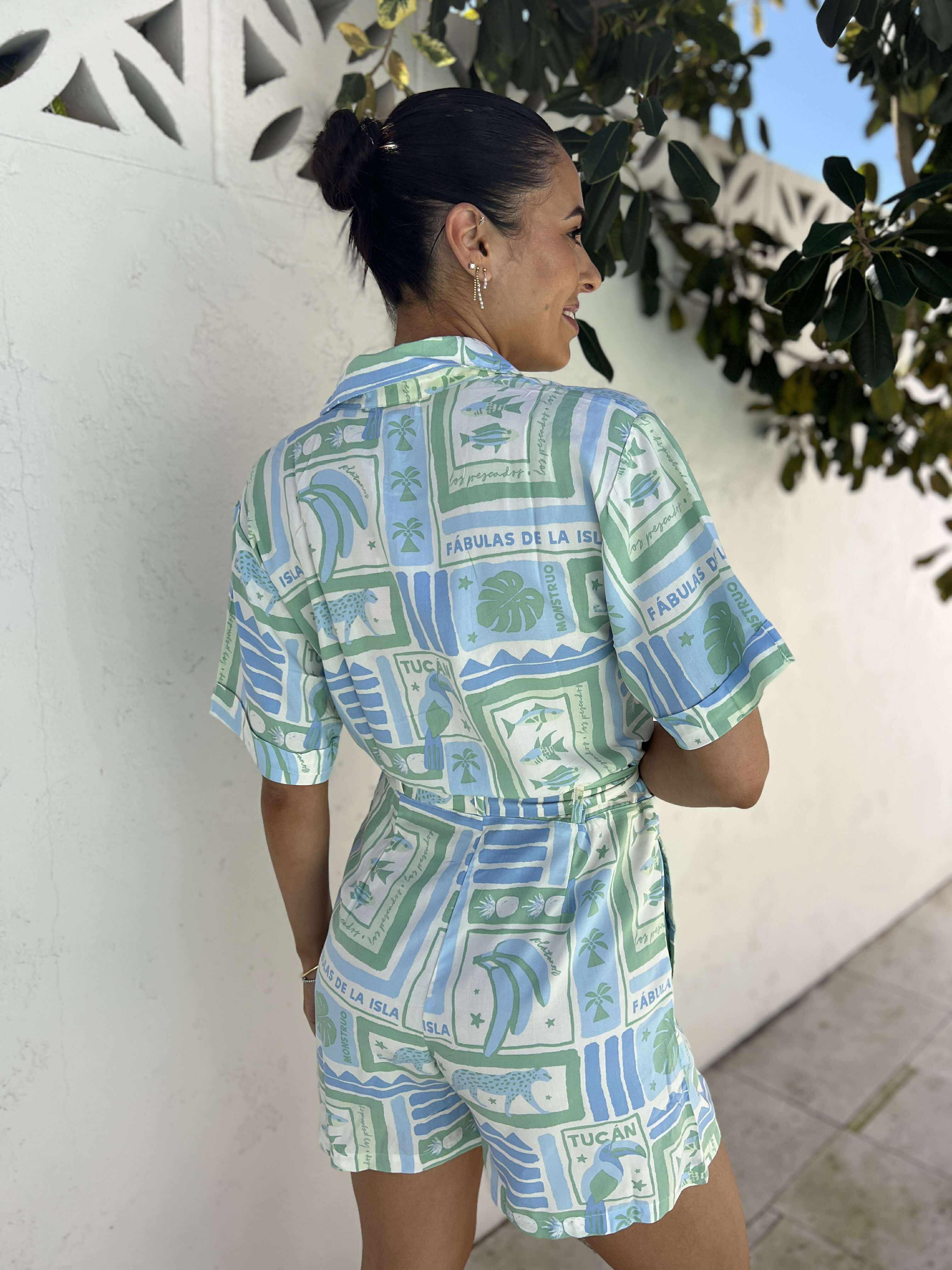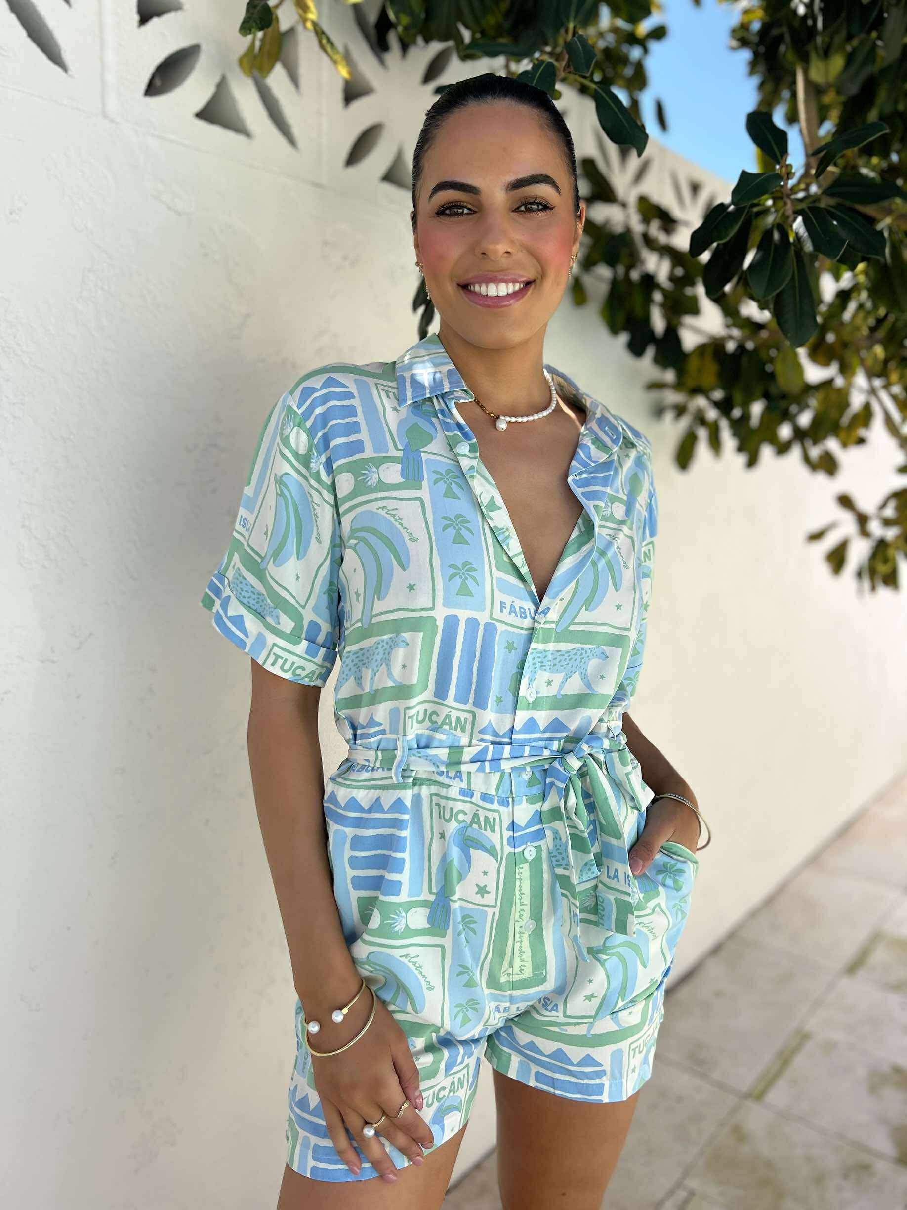 Turn heads in this playful short playsuit featuring a vibrant green and blue print. Designed with a relaxed fit through the legs, it offers all-day comfort with effortless style. Details include short sleeves with a capped hem, pockets, a flattering waist tie for a cinched silhouette, and a button-up front for a touch of classic charm. Perfect for sunny days and spontaneous adventures.