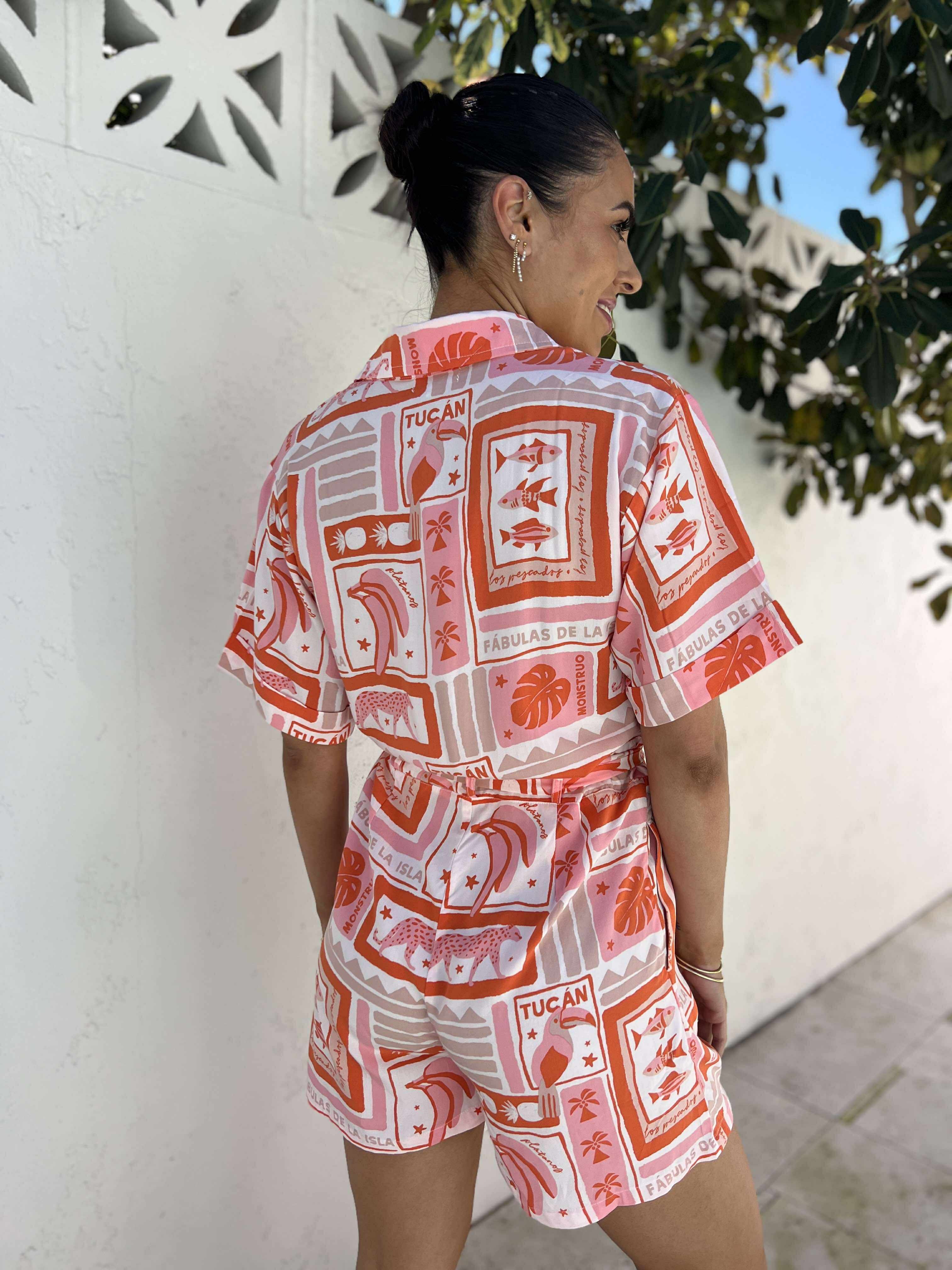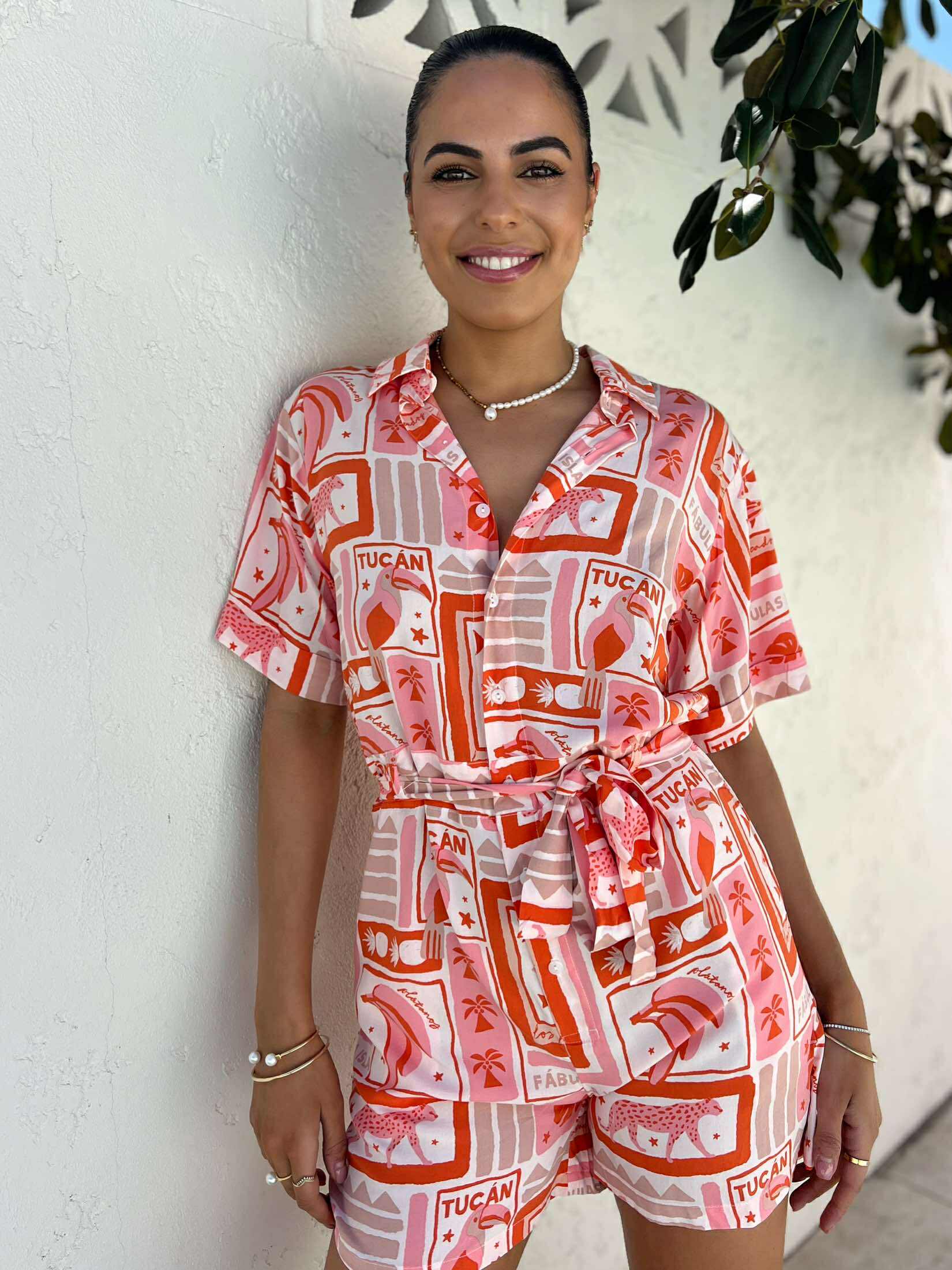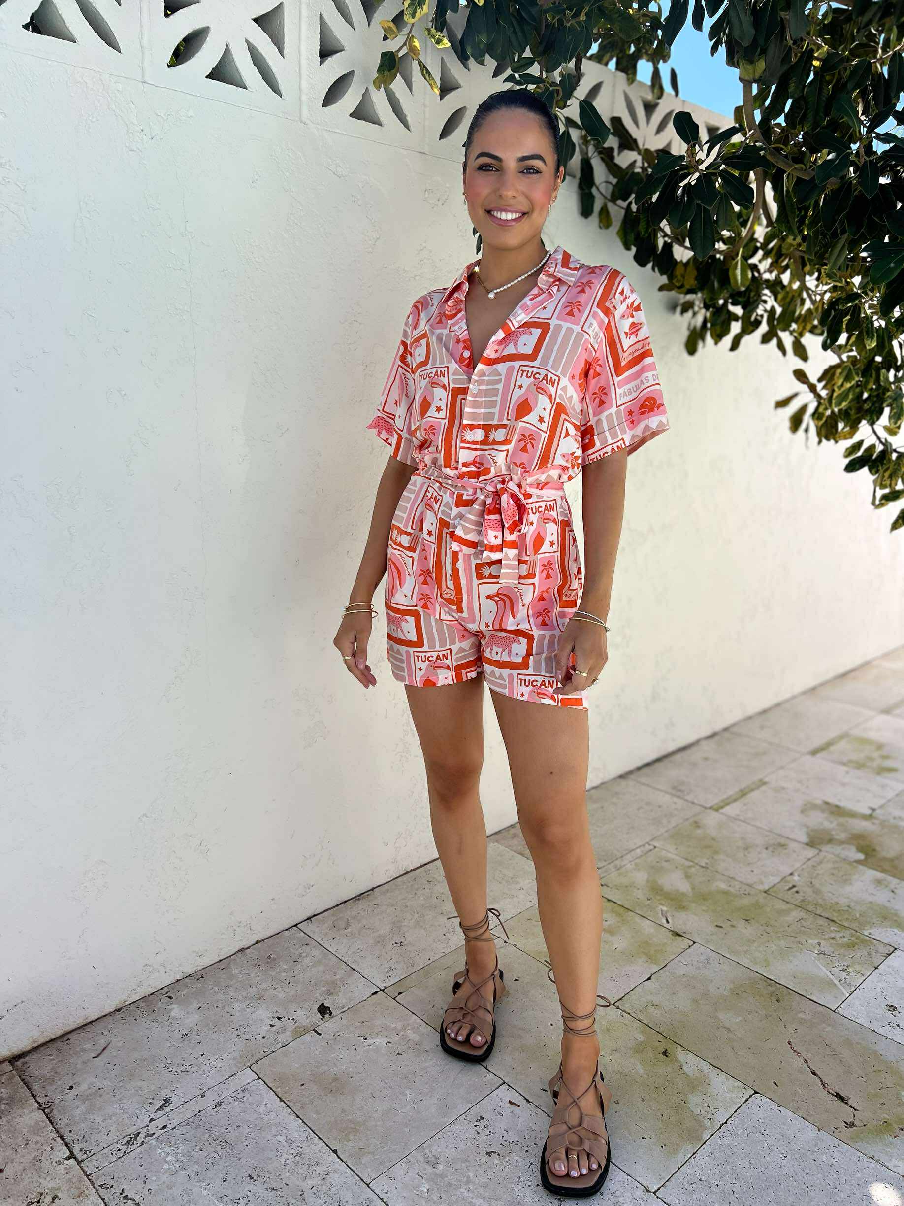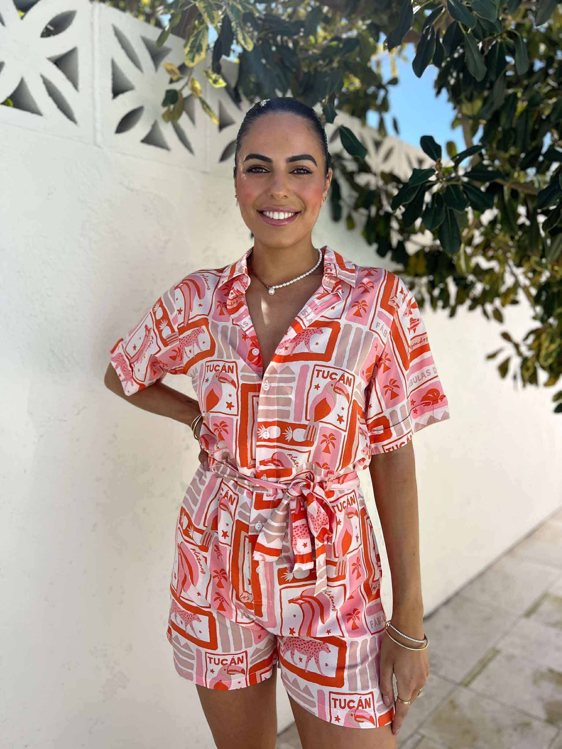 Turn heads in this playful short playsuit featuring a vibrant orange and pink print. Designed with a relaxed fit through the legs, it offers all-day comfort with effortless style. Details include short sleeves with a capped hem, pockets, a flattering waist tie for a cinched silhouette, and a button-up front for a touch of classic charm. Perfect for sunny days and spontaneous adventures.