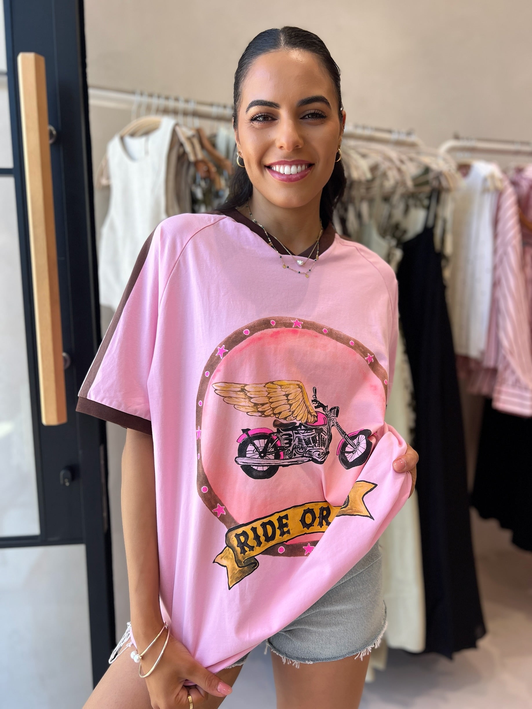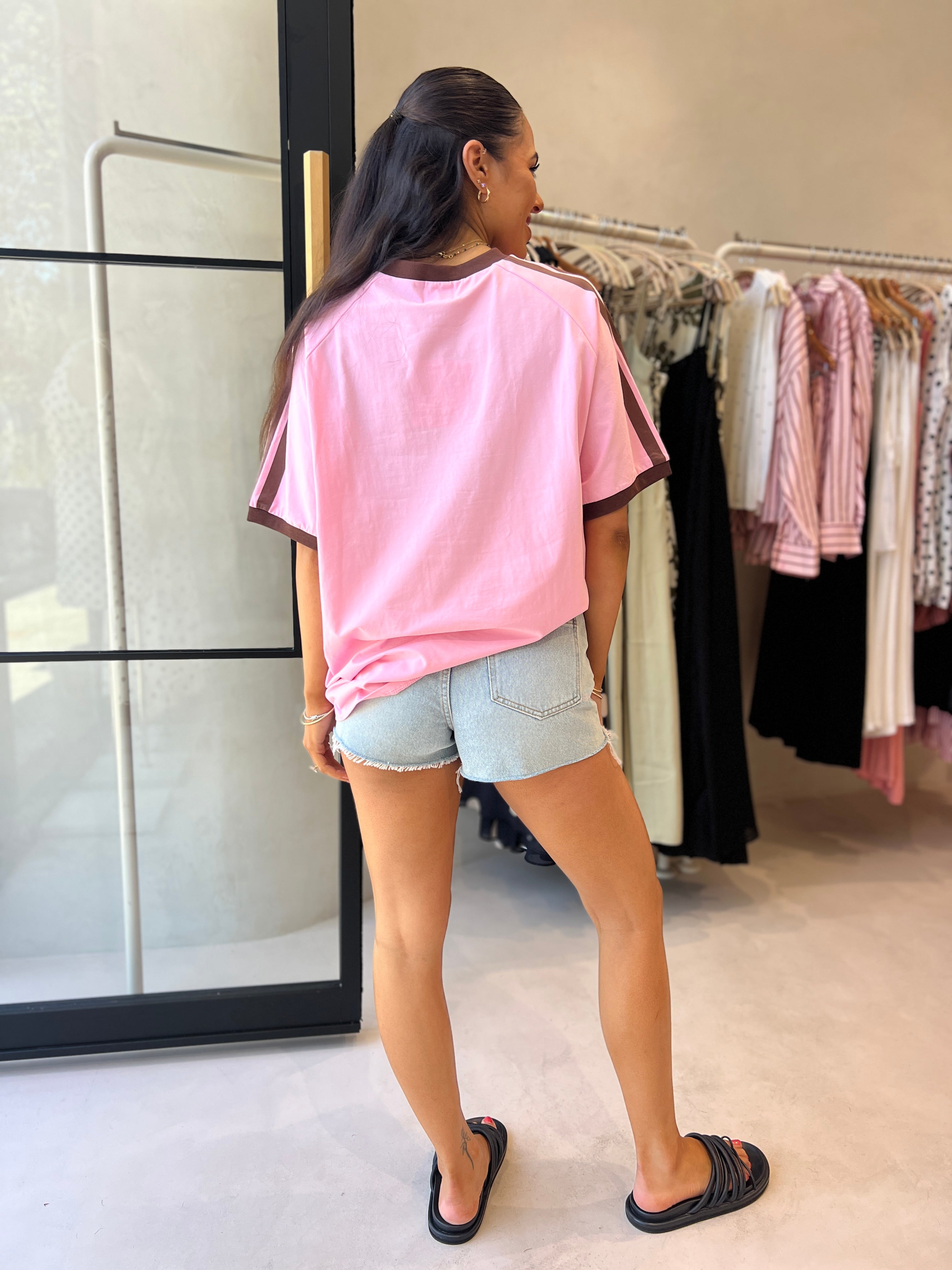 Made from 100% cotton, this comfy oversized tee features a playful graphic on the front and eye-catching contrast details with a brown collar and sleeve hems. The soft pink base adds a fun pop of color—perfect for laid-back, everyday style with a twist.