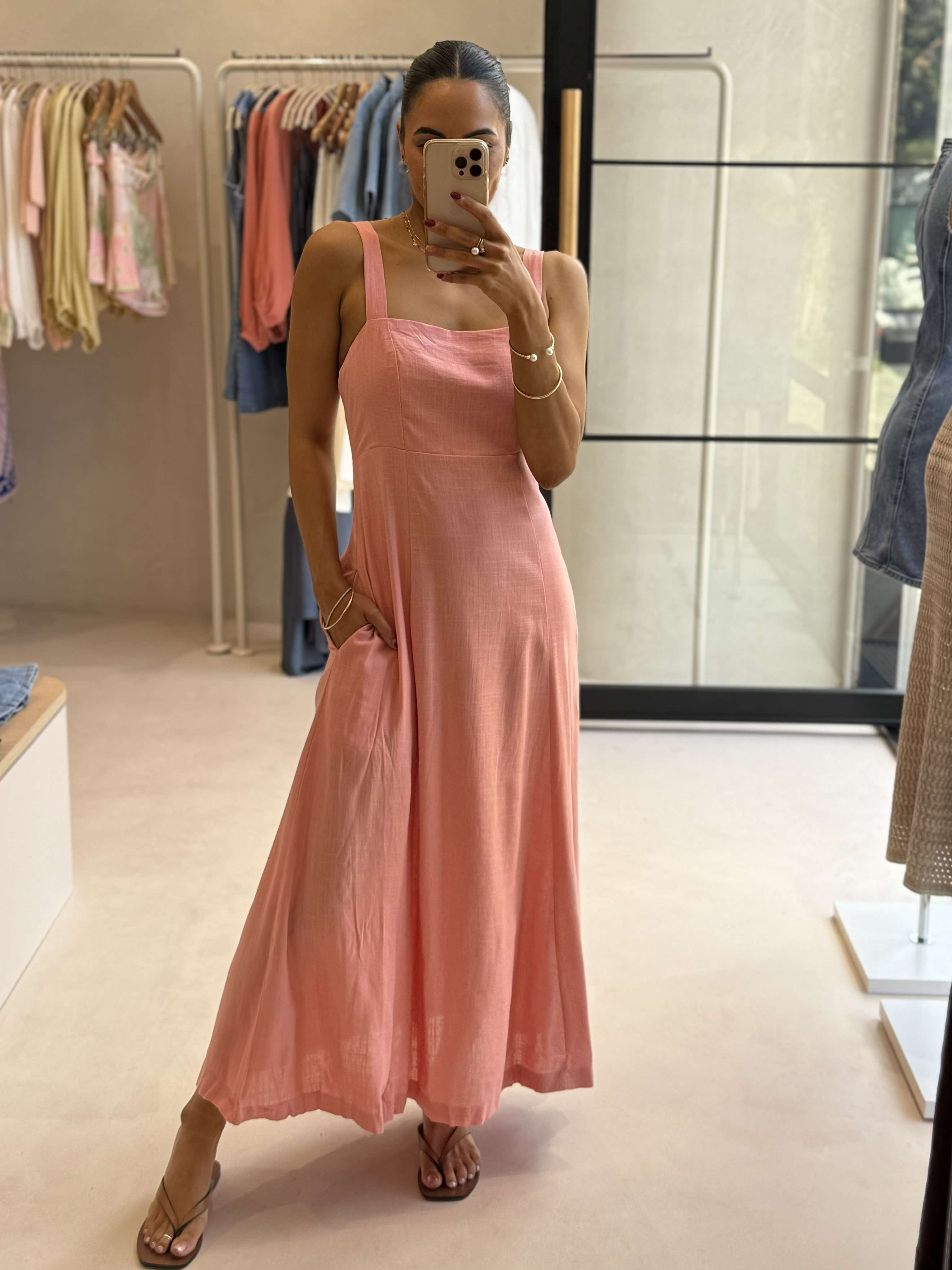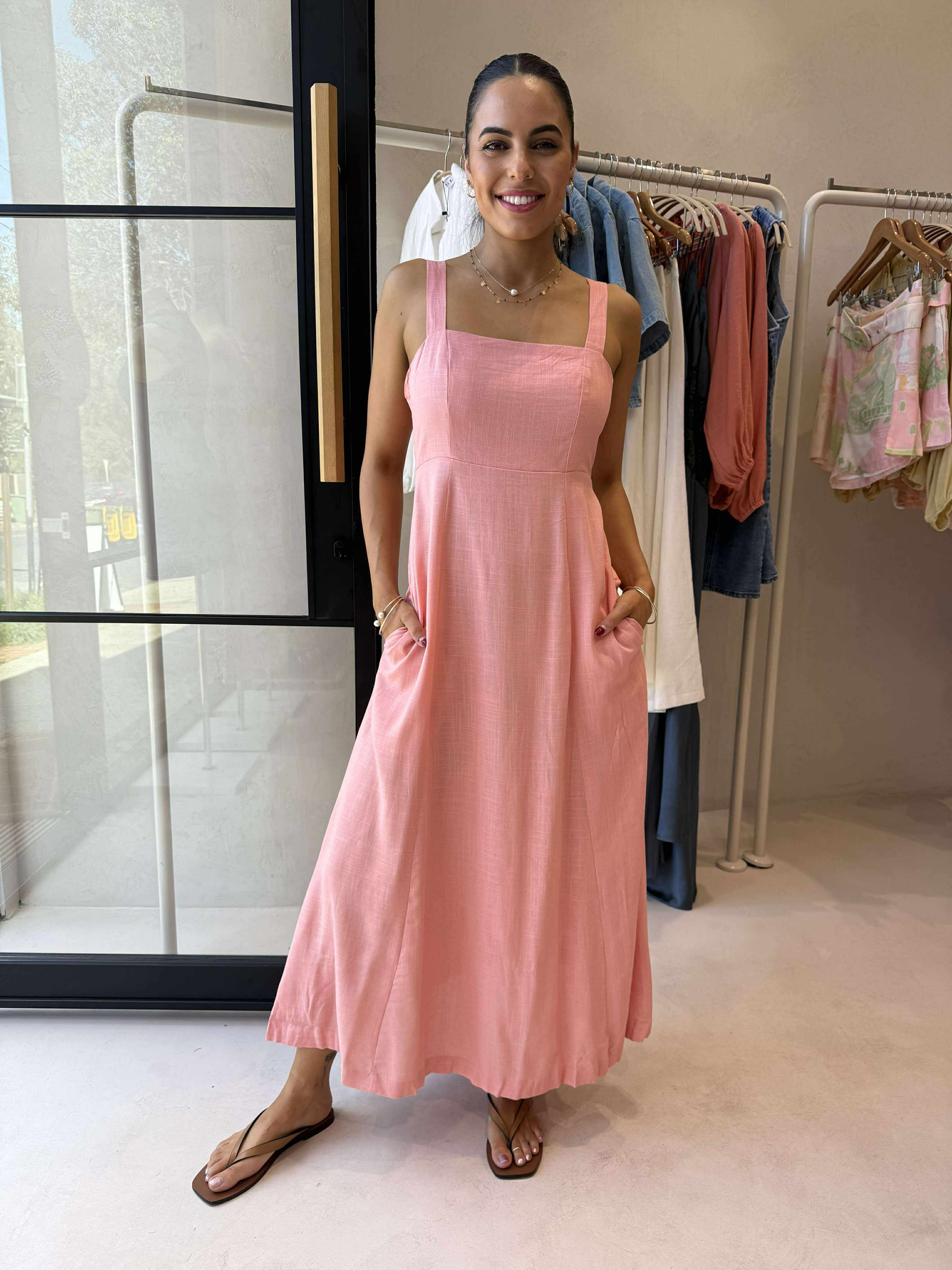 This maxi dress features a flattering square neckline, adjustable straps, and an invisible back zip for a seamless fit. The elastic back panel adds comfort, while pockets and a lined bust offer practicality and ease. Crafted from a breathable rayon/linen blend. Model wears size 8.