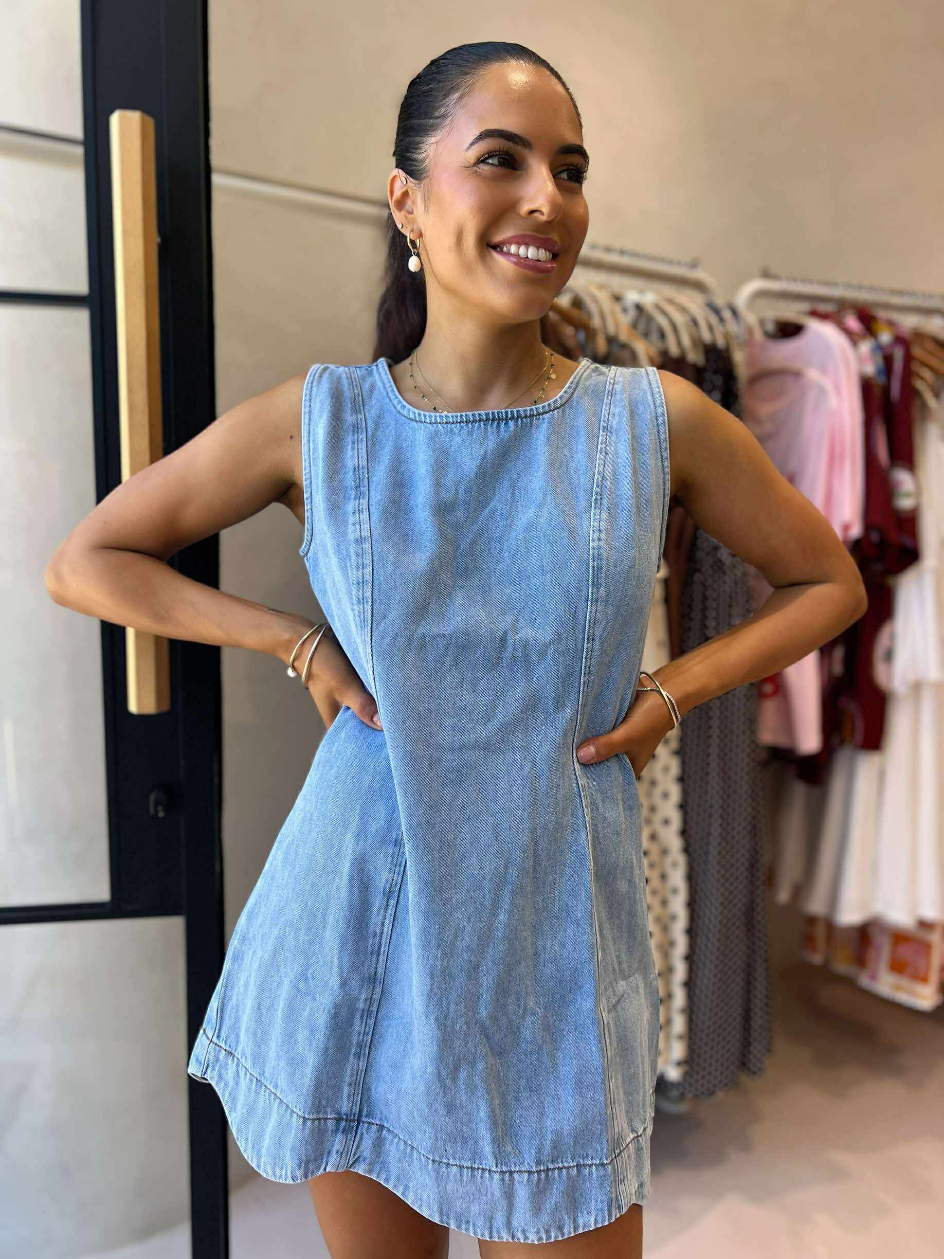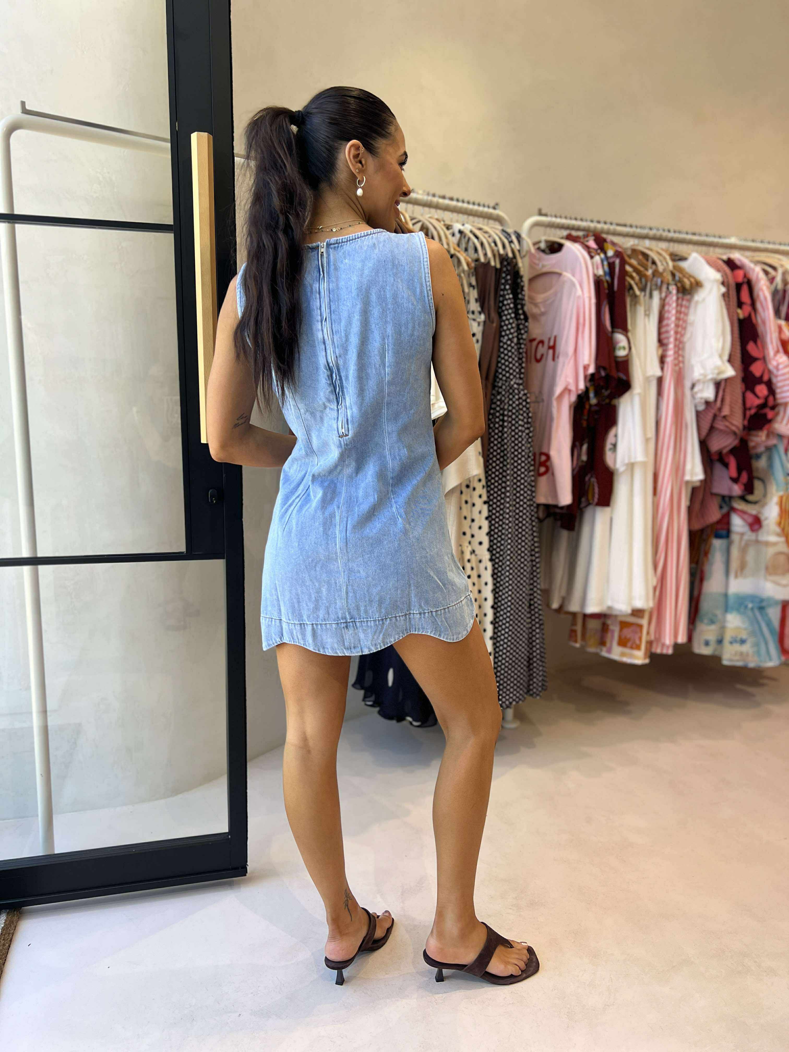 A fresh take on a classic, this sleeveless denim mini dress features a round neckline, scalloped hemline, and a sleek zip closure at the back. Perfect for casual days or dressed-up nights, it’s an easy go-to with a playful edge.