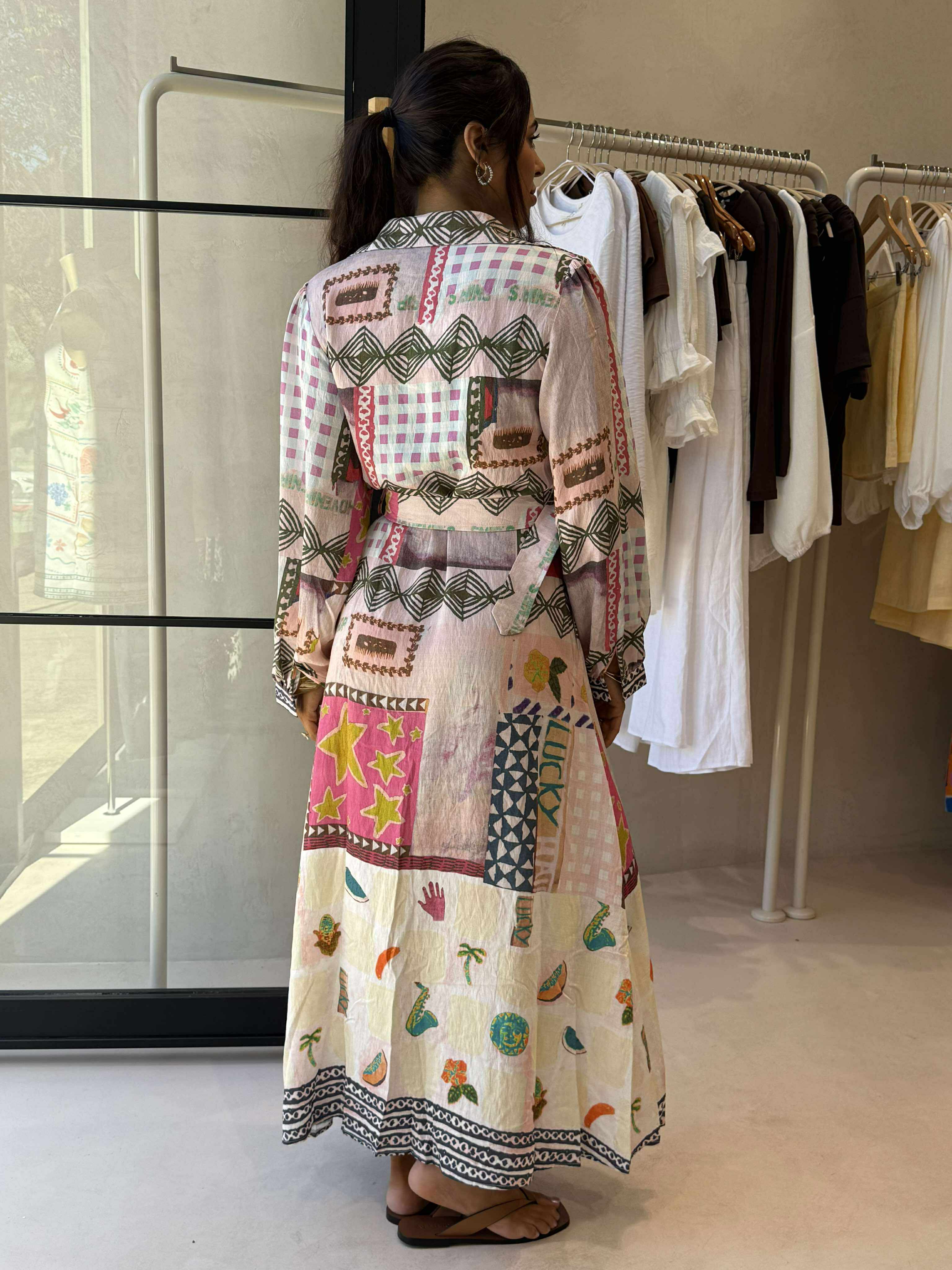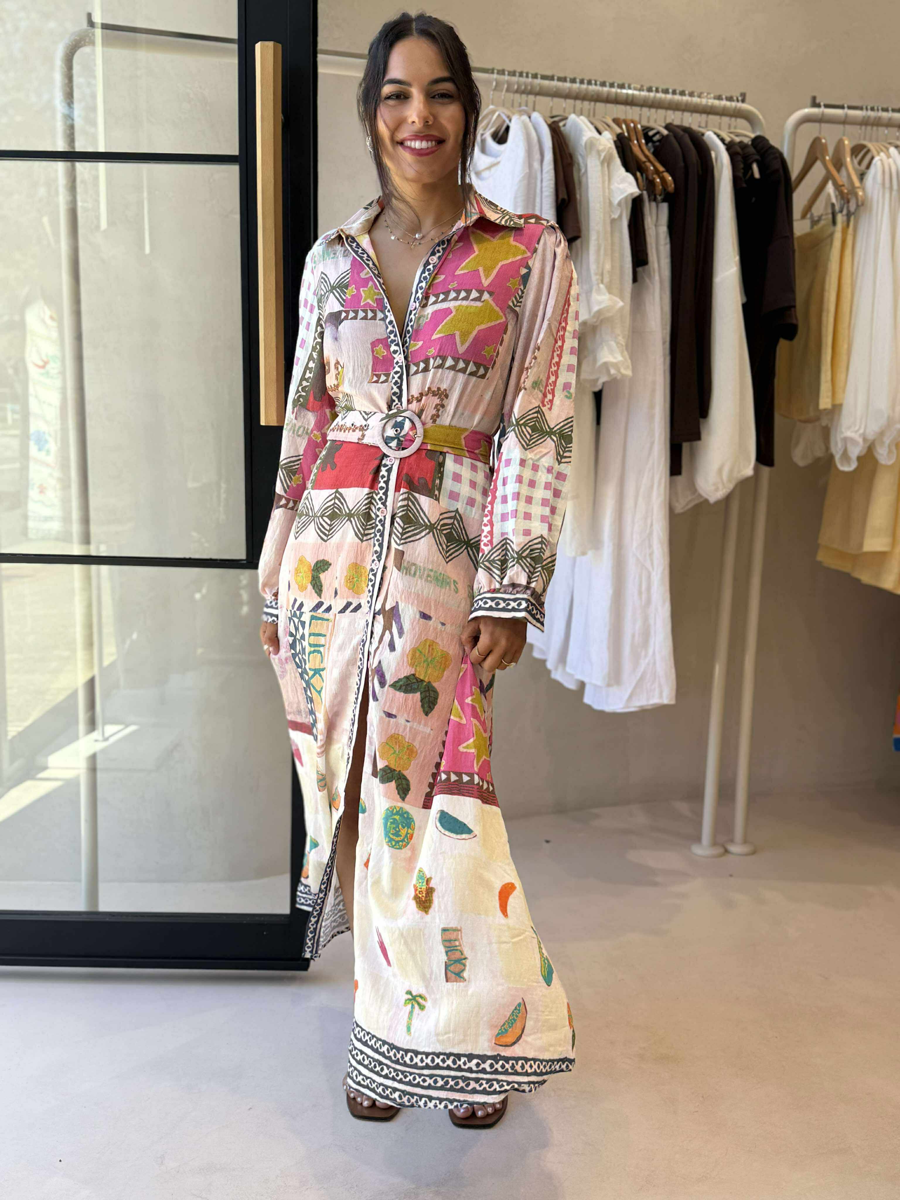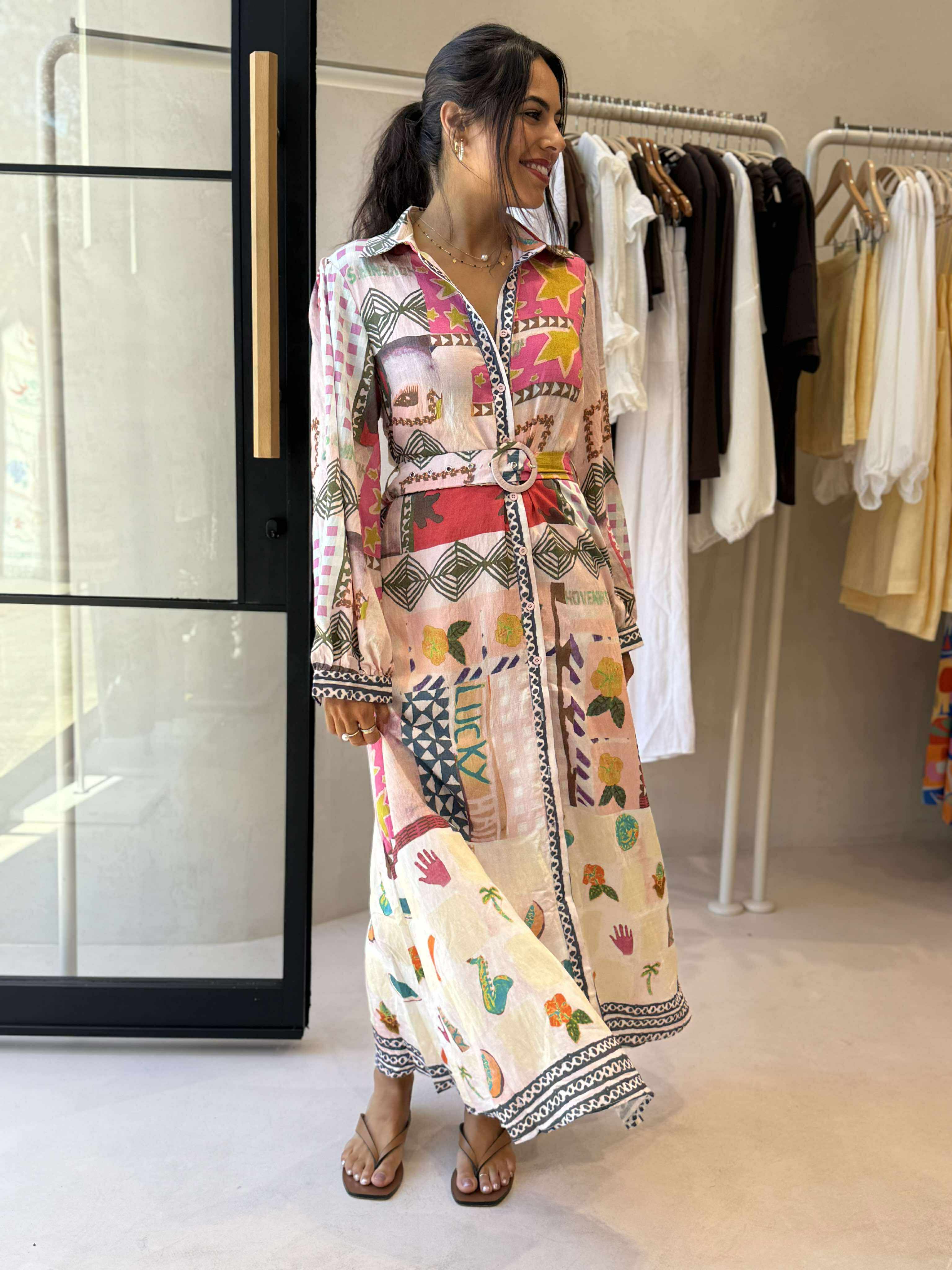 Make a statement in this light and relaxed-fit maxi dress, featuring a bold and colourful all-over print. Designed with a classic button-up front, long sleeves with buttoned cuffs, and a matching waist belt to define your shape. Effortlessly stylish and easy to wear from day to night.