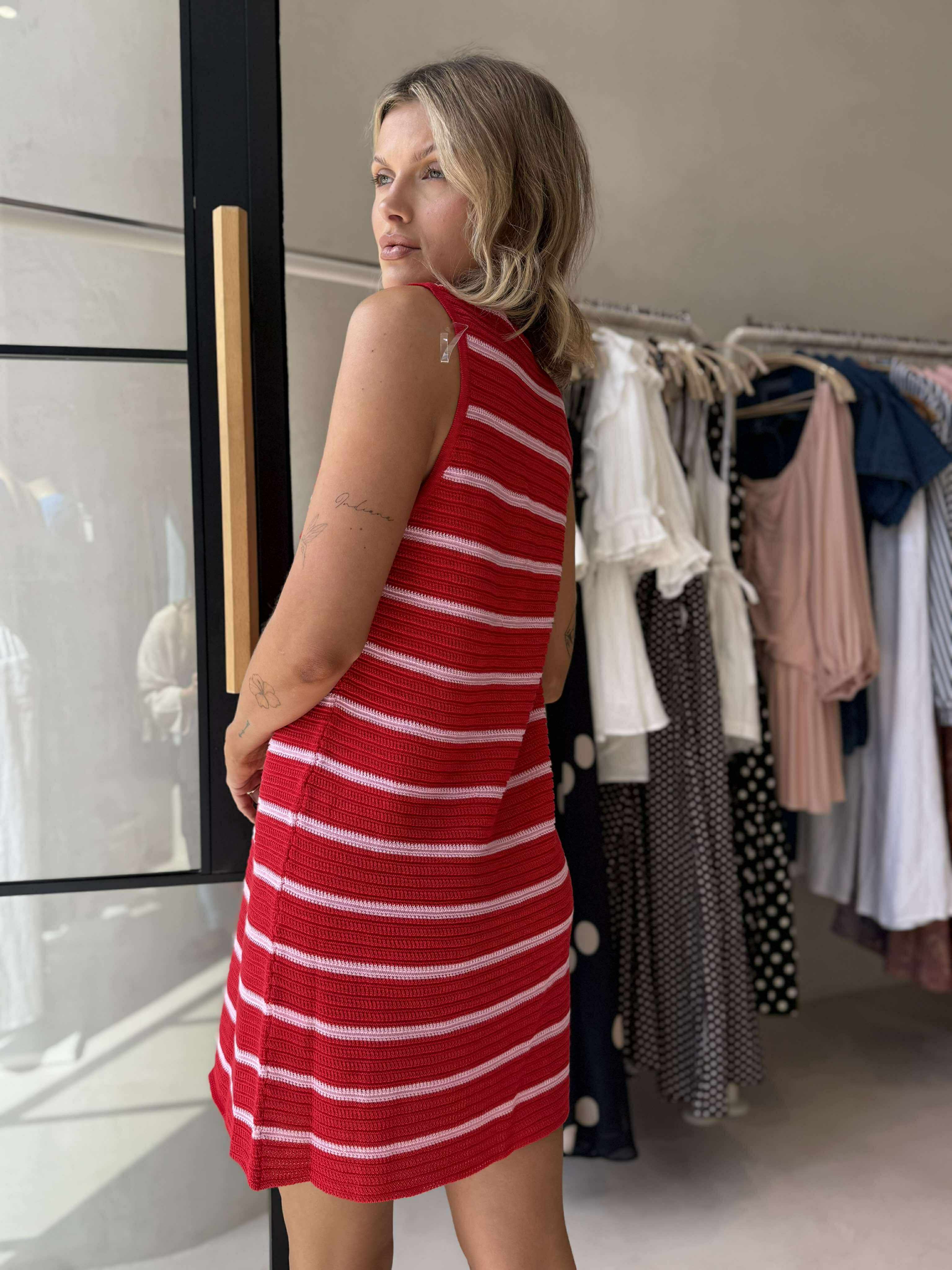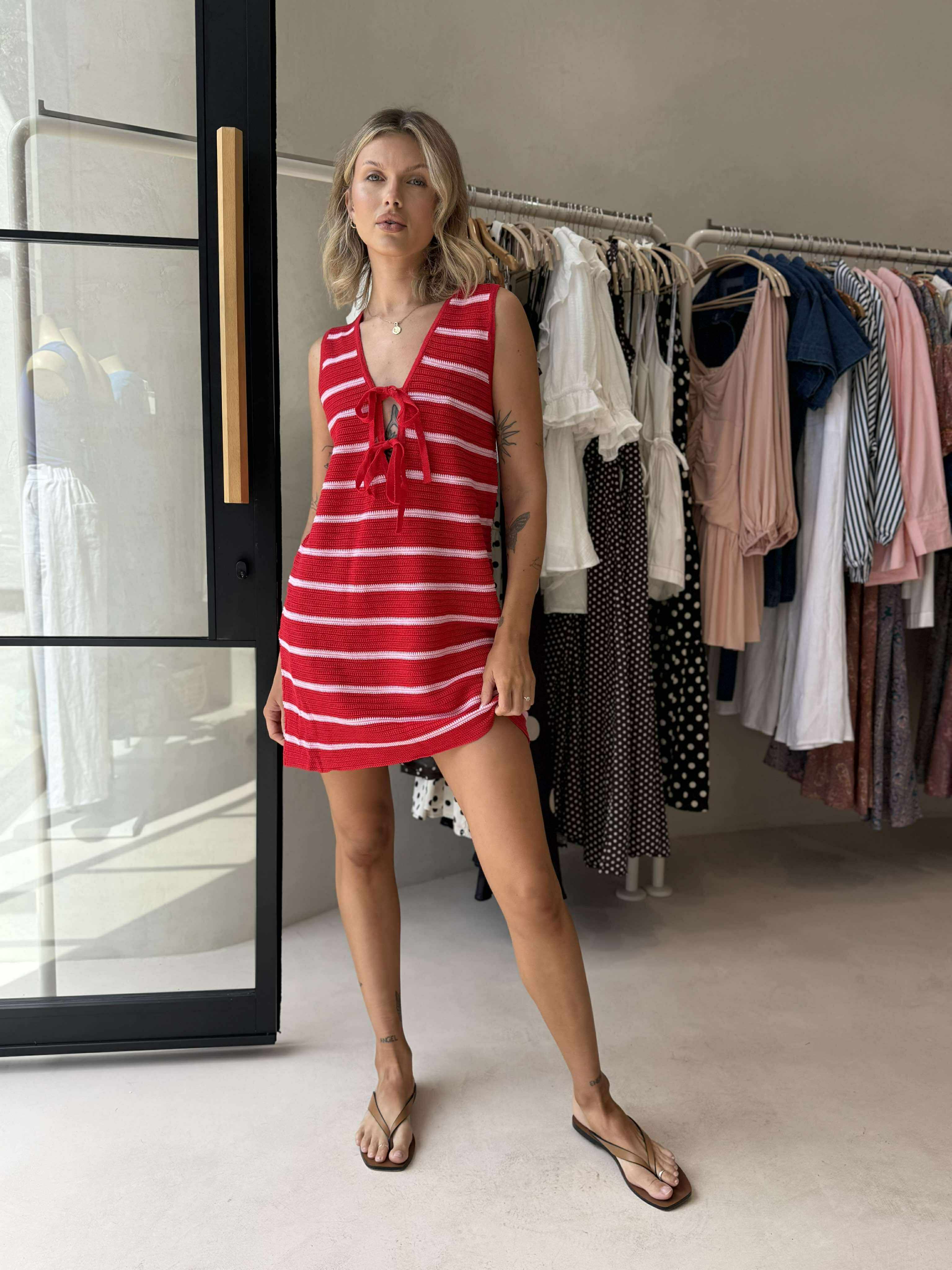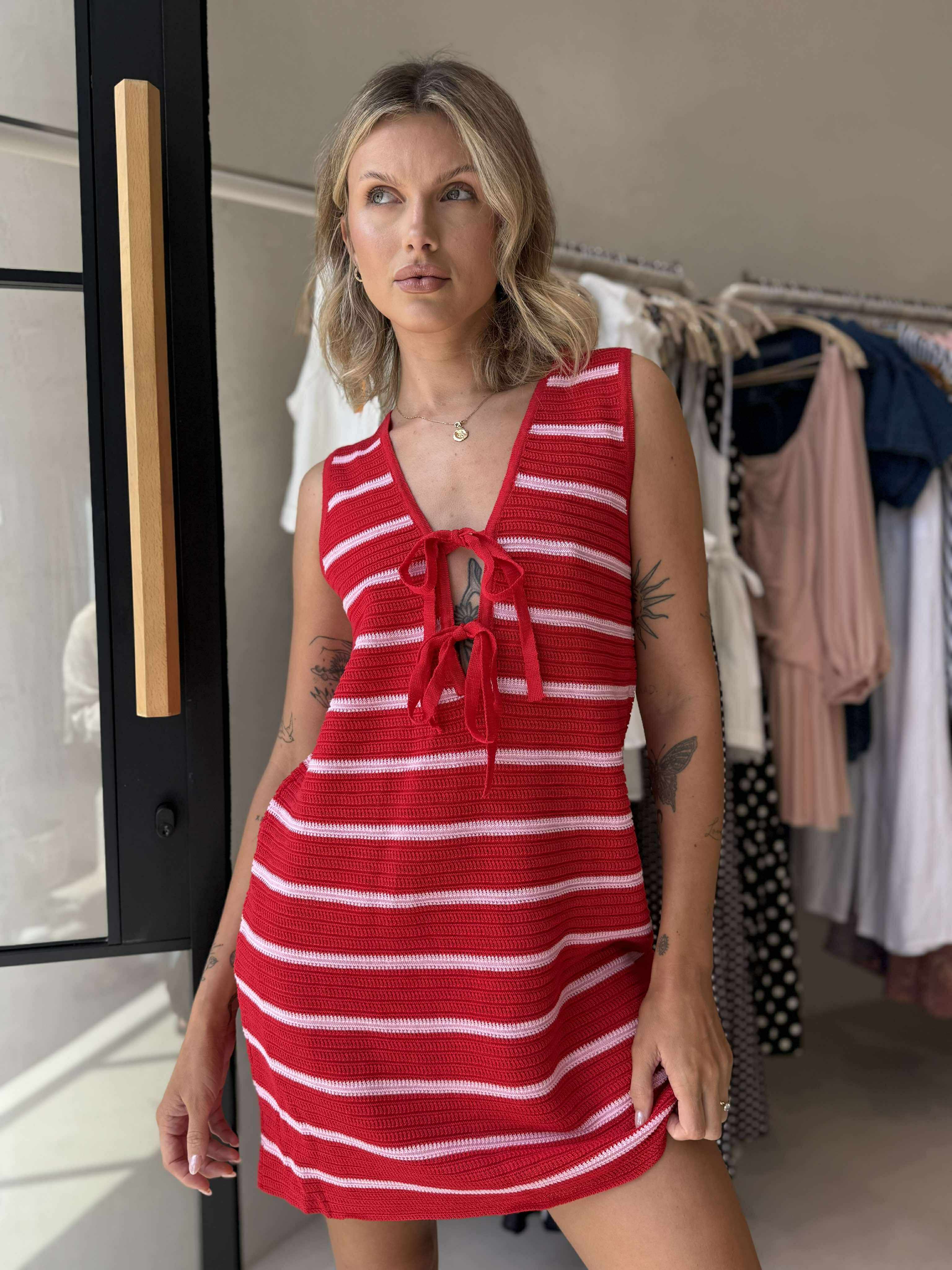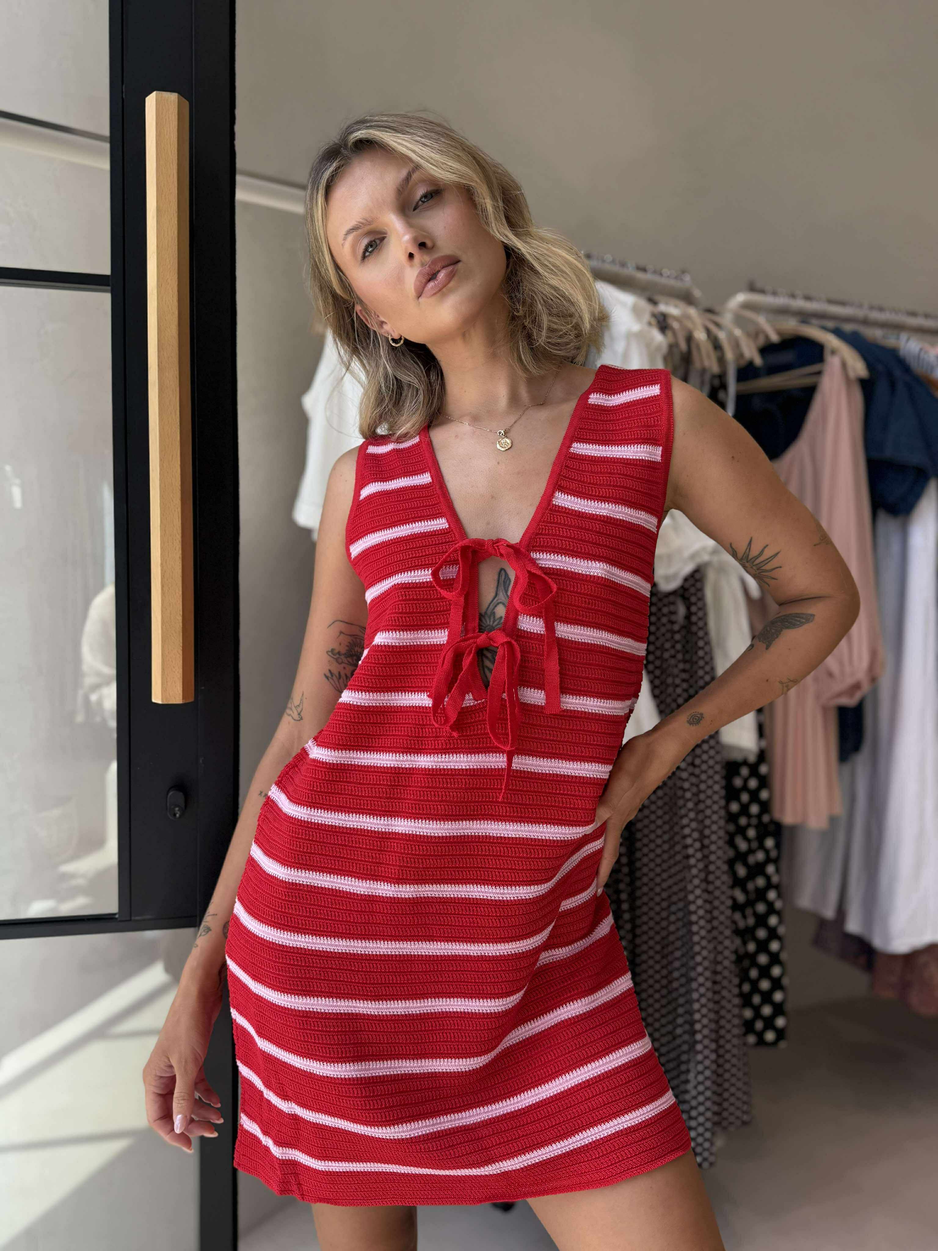 Turn heads in the Sunshine Mini, a flirty knit dress in vibrant red and pink hues. Featuring a relaxed A-line silhouette and a deep V neckline, this piece is finished with playful tie details across the chest for a hint of charm. Effortless, eye-catching, and perfect for warm days or nights out.