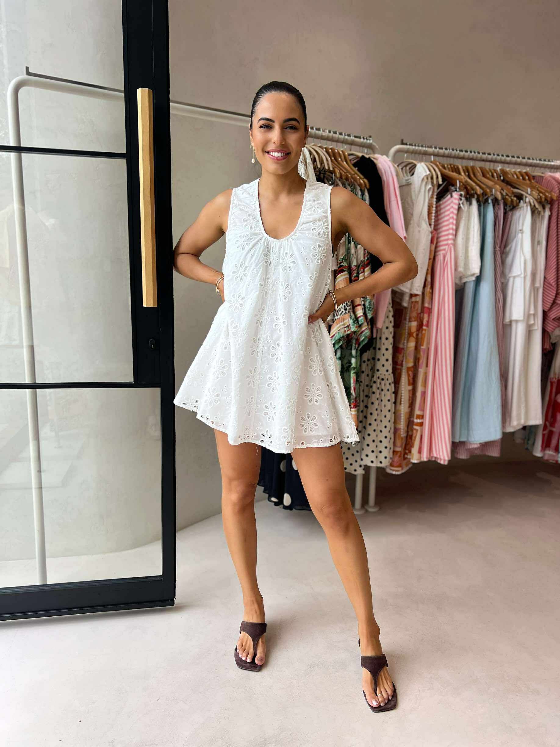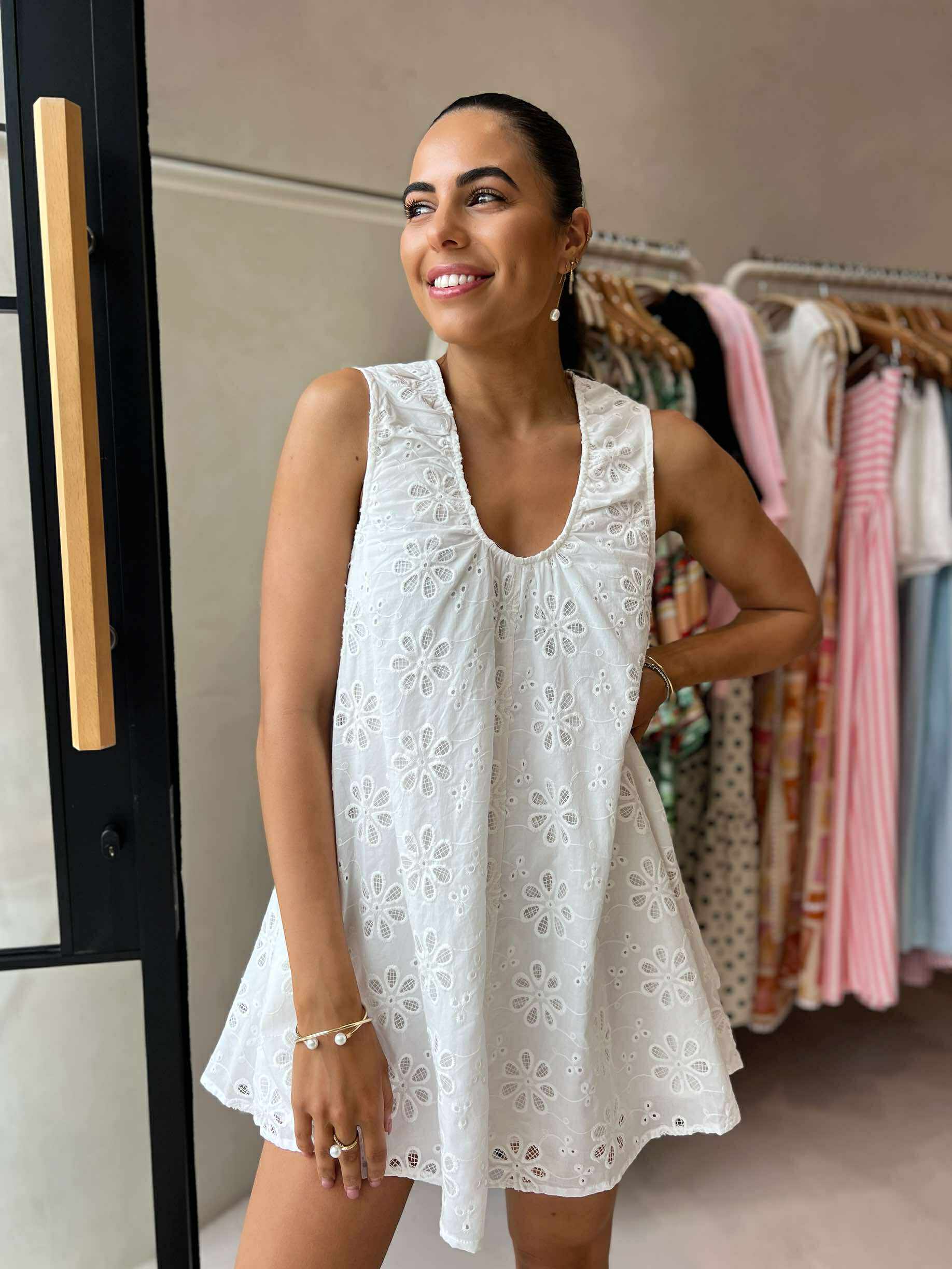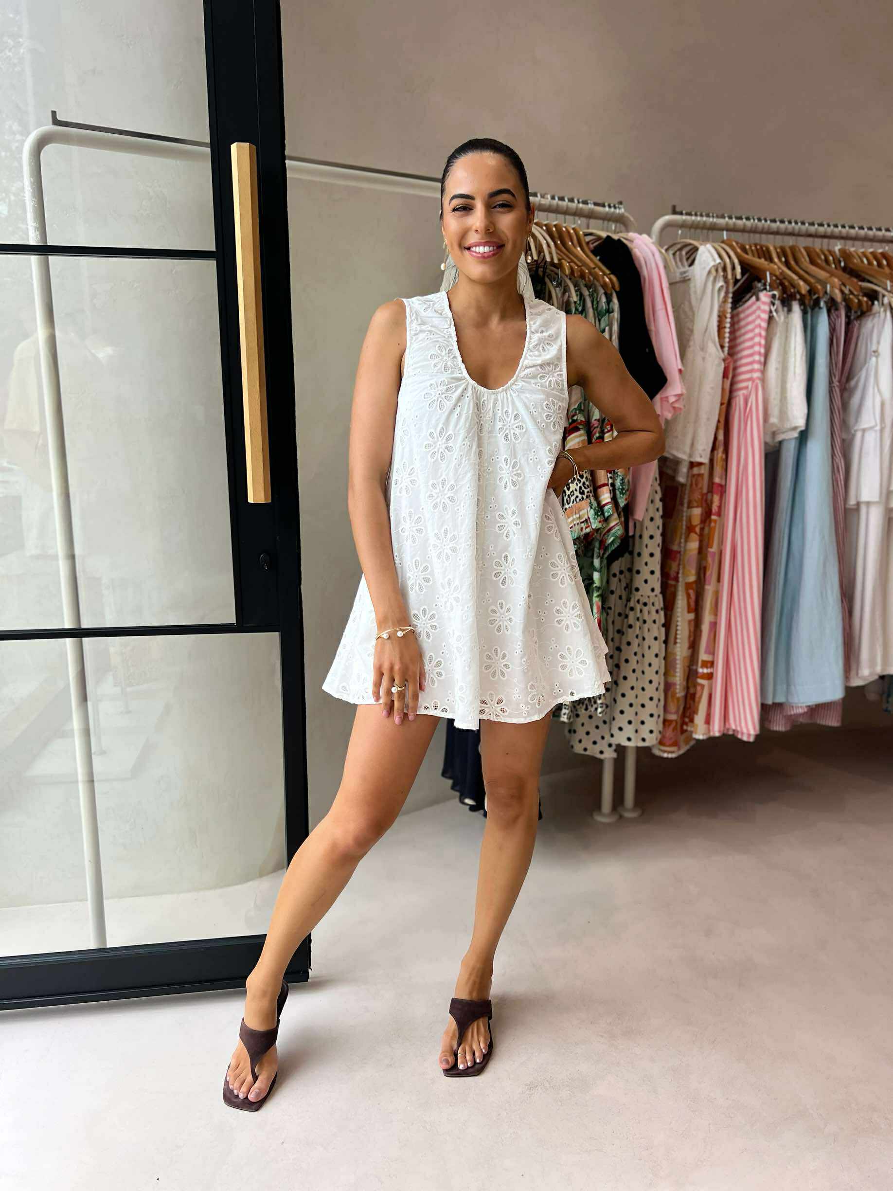 Light, breezy, and effortlessly elegant — this white mini dress features a relaxed, flowing fit with a scooped neckline and delicate lace detailing. Fully lined for comfort and designed with discreet pockets, it’s the perfect go-to for warm days or casual chic moments.