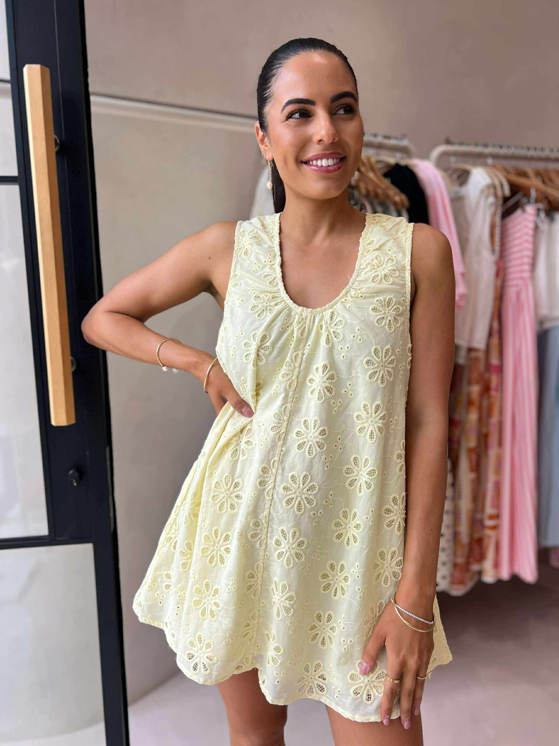 Brighten up your wardrobe with this charming yellow mini dress. Featuring a relaxed, flowing fit, it’s fully lined for comfort and accented with delicate lace details. The scooped neckline and hidden pockets add a touch of effortless ease—perfect for sunny days or casual outings.